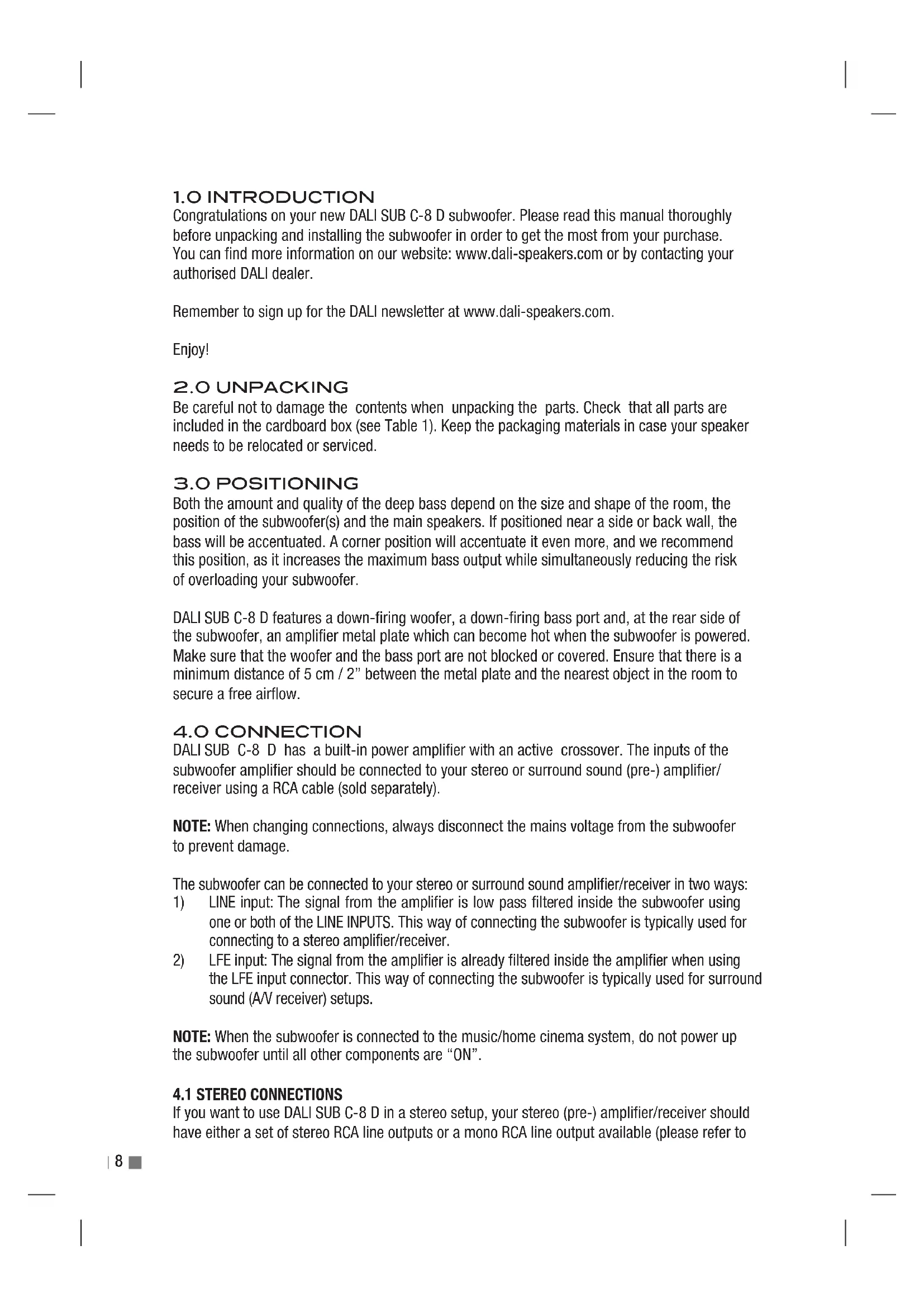 Congratulations on your new DALI SUB C-8 D subwoofer. Please read this manual thoroughly before unpacking and installing the subwoofer in order to get the most from your purchase. You can find more information on our website: www.dali-speakers.com or by contacting your authorised DALI dealer. Remember to sign up for the DALI newsletter at www.dali-speakers.com. Enjoy!