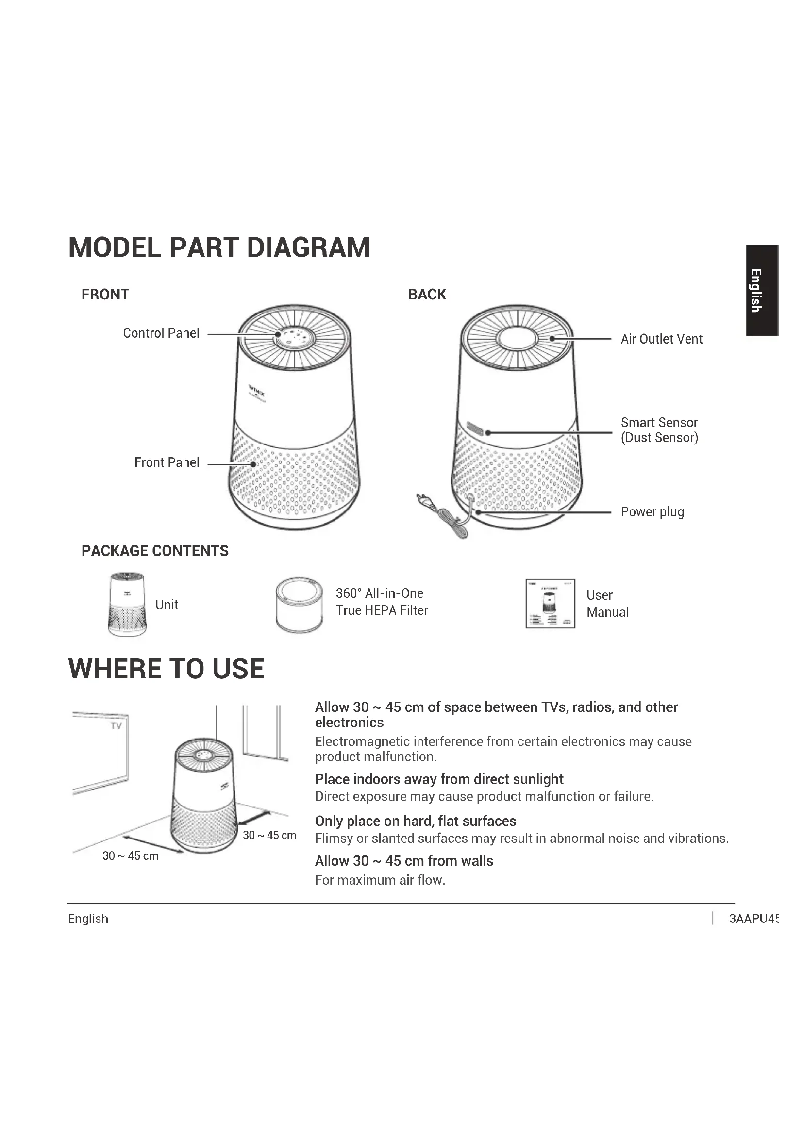 Allow 30 ~ 45 cm of space between TVs, radios, and other electronics Electromagnetic interference from certain electronics may cause product malfunction. Place indoors away from direct sunlight Direct exposure may cause product malfunction or failure. Only place on hard, flat surfaces Flimsy or slanted surfaces may result in abnormal noise and vibrations. Allow 30 ~ 45 cm from walls For maximum air flow. 30 ~ 45 cm30 ~ 45 cm FRONT Air Outlet Vent Smart Sensor (Dust Sensor) Power plug BACK PACKAGE CONTENTS Control Panel Front Panel Unit 360° All-in-One True HEPA Filter User Manual EnglishEnglish English