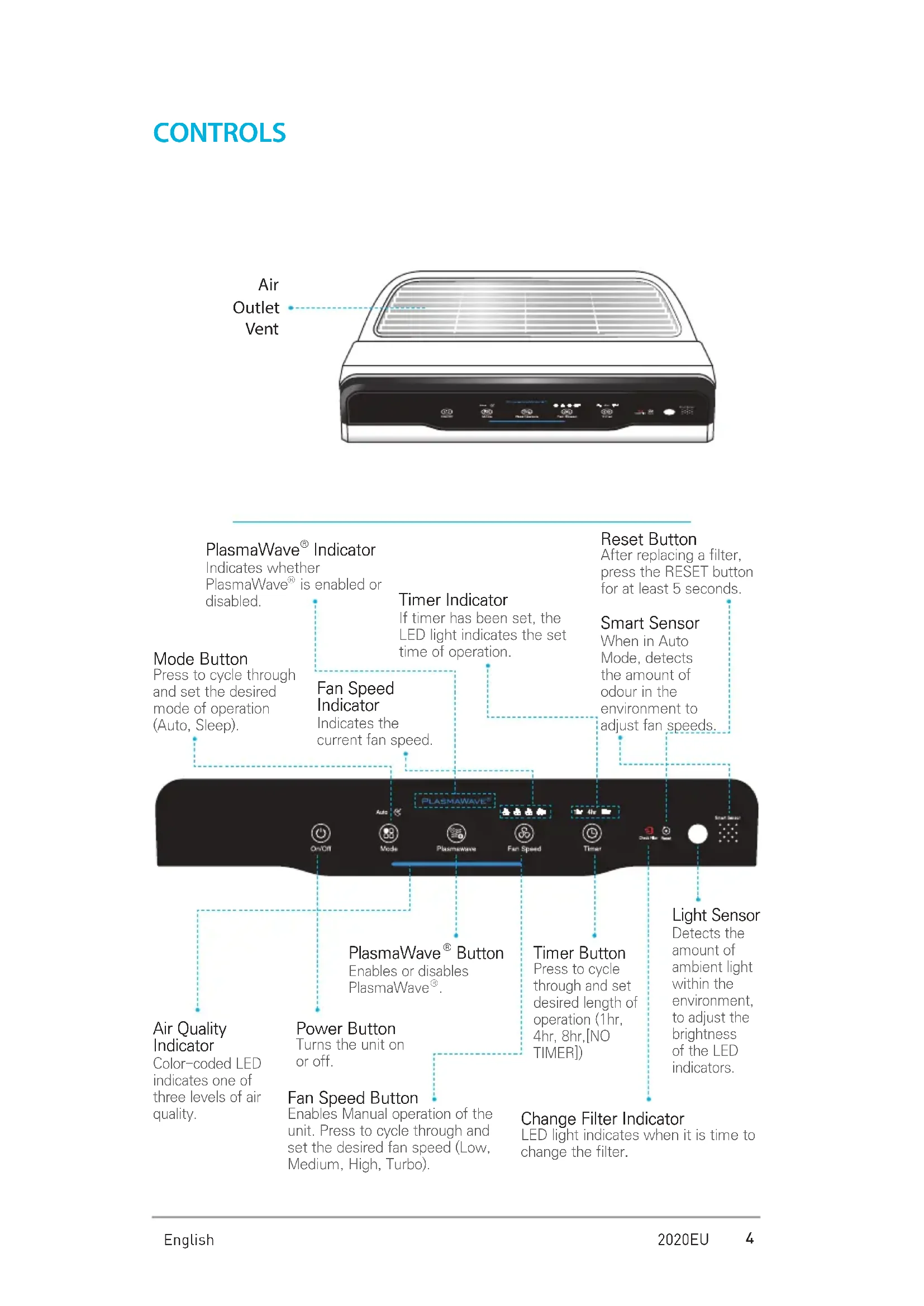 2020EU 소피아 2 영문소피아 1 소피아 2 영문소피아 1 Air Outlet Vent CONTROLS Reset Button After replacing a filter, press the RESET button for at least 5 seconds. Fan Speed Indicator Indicates the current fan speed. Timer Indicator If timer has been set, the LED light indicates the set time of operation. PlasmaWave