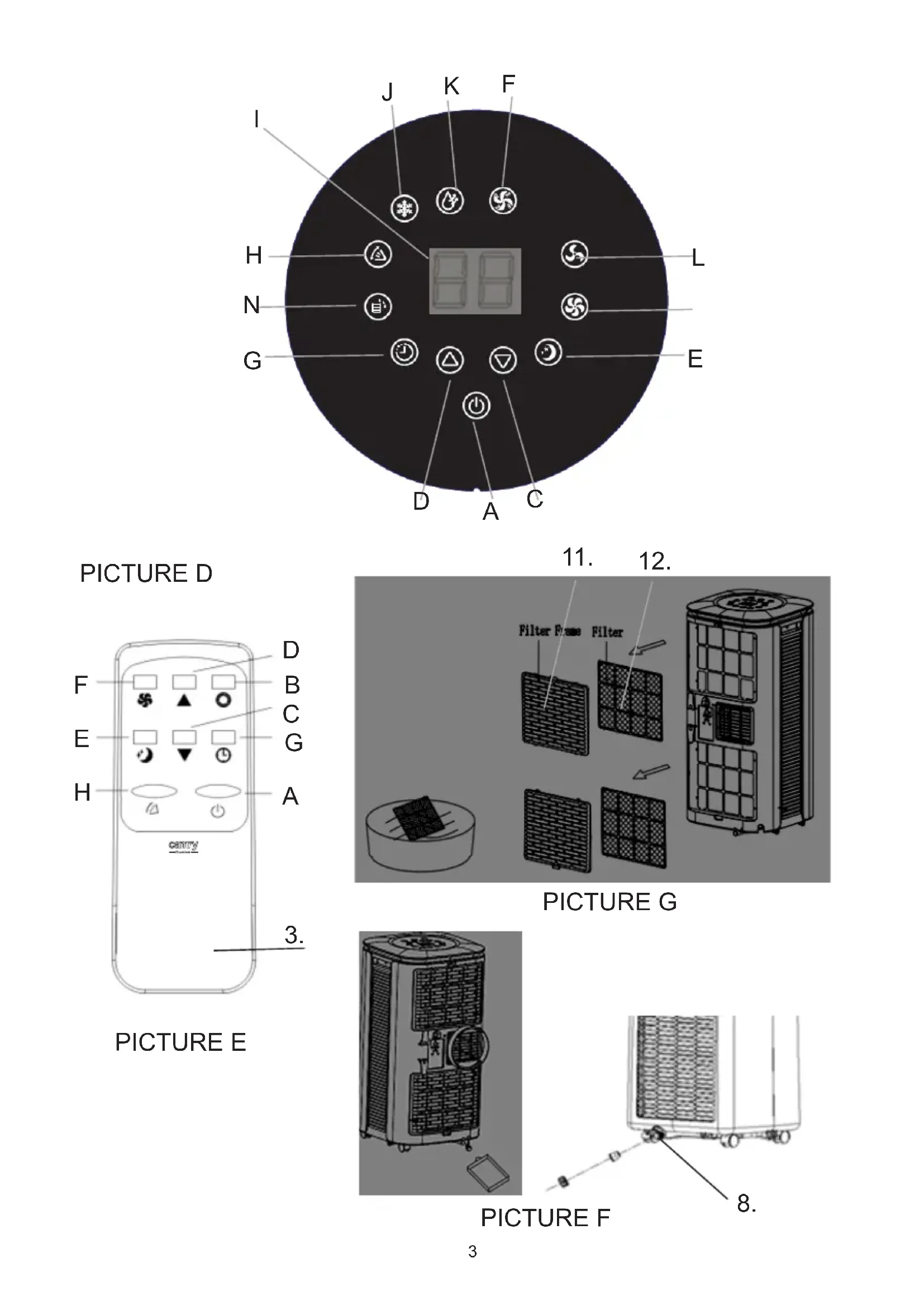 Control Panel Description - Picture D. A. Power button C. Temperature down / timer down button in cooling mode6 C. Temperature / timer down button Press an air oscillation button (H), after the device turns on, automatic air oscillation function turns on, the louver will swing continuously the left and the right; by pressing the button again the movement will stop and the louver remain in that position. Dehumidifying mode – The radius of horizontal air oscillation is 30 degrees left and 30 degrees right direction from the middle vertical. - When the device is working, press button “G”, the LCD screen flashes, press the button “C” or “D” to set up the quantity of hours need to pass before the device will shut off automatically. The LCD screen stops flashing, the timer icon will be illuminated, LCD screen shows required to achieve temperature. This is a delayed start function. REMOTE CONTROLLER operation – picture E The water full indicator lamp “N” will be illuminated and the buzzer will alarm for several second, then the compressor will stop to work when the inner device water tank will be full. - Press button “K” to select dehumidifying mode, the LCD screen will show “dh”. Under dehumidifying mode, sleep mode cannot be setup, and fan speed is fixed on slow fan speed automatically and cannot be changed. In order to switch off the dehumidifying mode select other operation mode: cooling or fan mode. 13The function of drain plug ( ) is to drain the condensate water from the device's upper part. Its use is determined according to the local air humidity. It is need to open the drain plug ( ) and pour out the condensate water if the device 13 operates when local air humidity is high or the device operates on dehumidification mode continuously for 12-24 hours continuously. In dry cooling mode (low air humidity) it is not necessary to open the drain plug ( ) because there is no need to drain the condensate.13 - Press button “J” to select cooling mode, next press the button “L” to get slow fan speed button or press the button “M” to get fast fan speed button. Next press button “ C” or “ D” to adjust required temperature from 16℃ to 31℃, buttons are not available in fan or dehumidifying mode. Timer set up - Timer operation range can be fixed by each one hour from 1 to 24 hours. - When the device is not working, press button “G”, the LCD screen flashes, press the button “C” or “D” to set up the quantity of hours after the device will start to operate. The LCD screen stops flashing and timer icon will be illuminated. Water full - - The sleep mode is automatically programmed. After the first hour of operation, the temperature will increase by 1 ℃, after the second hour of operation, the temperature will increase by another 1 ℃, and then remain at the same level. Cooling mode - Fan mode - - Press button “E” again to cancel sleep mode. Sleep mode – - Next press button “ C” or “ D” to adjust required temperature from 16℃ to 31℃. - At first Press button “J” to cooling mode, next press button “E” to turn on the sleep mode, then the device will work on Energy-Saving and quiet type. NOTE: Sleep mode is not available in dehumidify and fan modes. - Press button “F” to select fan mode, the LCD screen will show “FA”, next press the button “L” to get slow fan speed button or press the button “M” to get fast fan speed button. During fan mode operation the temperature and sleeping functions cannot be setup. Automatic air oscillation function – Press button “A” to turn on and turn off the device, the buzzer will play signal once. MODE SELECTION on manual operation of control panel – G. Timer button When the device is power on, choose mode you need between cooling mode or fan mode or dehumidifying mode as below: CONTROL PANEL manual operation – picture D E. Sleep mode button F. Fan speed selection button D. Temperature / timer up button H. Air oscillation button When the is powered on for the first time, the buzzer will shout, and then the device will get into standby status. Button "B" - press it to select operation mode: cool mode → dry mode → fan mode. Button "A" - the device will be started when it is energized or will be stopped, if you press this button again. The remote controller transmits signals to the system. Button "C" / "D" - press to set up the operation time from 1 to 24 hours or required room temperature from 15 to 31°C when cooling mode is7 Reason: The device is not placed on a flat surface. So, put the device on a flat and hard place to reduce noise. Reason 4: Air-inlet or air out-let is blocked. So, remove blockage. If nylon filter (12) is clogged with dust, then the effectiveness of the device is reduced, be sure to clean the filter once every two weeks. Reason 2: Door and windows are open , many heat sources in the room. So, close the door and windows, move out heat sources. Problem II.: The device auto-restarts frequently. TROUBLESHOOTING Reason1: Direct sunlight. So, drawn the curtains. 1.Pull out drainage plug (8) to flow out water. - Force down from the outside the latch of filter frame (11) with hands and pull out to yourself to remove the filter frame(11). 4.Clean and dry filters, then reinstall them. Storage the device and all device components in dry place. Problem I.: The air conditioning does not work. 3.Turn off the device and pull out plug . Reason 2: The water full indicator light “N” is illuminated. So, discharge the water. Reason 1:There is no electricity. So, turn it on after connecting it to a socket with electricity. Reason 3: Filters are too dirty. So, clean or replace filters. Problem III.: Big Noise Reason: Compressor time-delay protection turn on. So, wait for 3 minutes until the temperature is lowered, and then restart the device. - Put nylon filter (11) into warm water with neutral detergent (about 40℃ / 104℉) and dry it in the shade after r