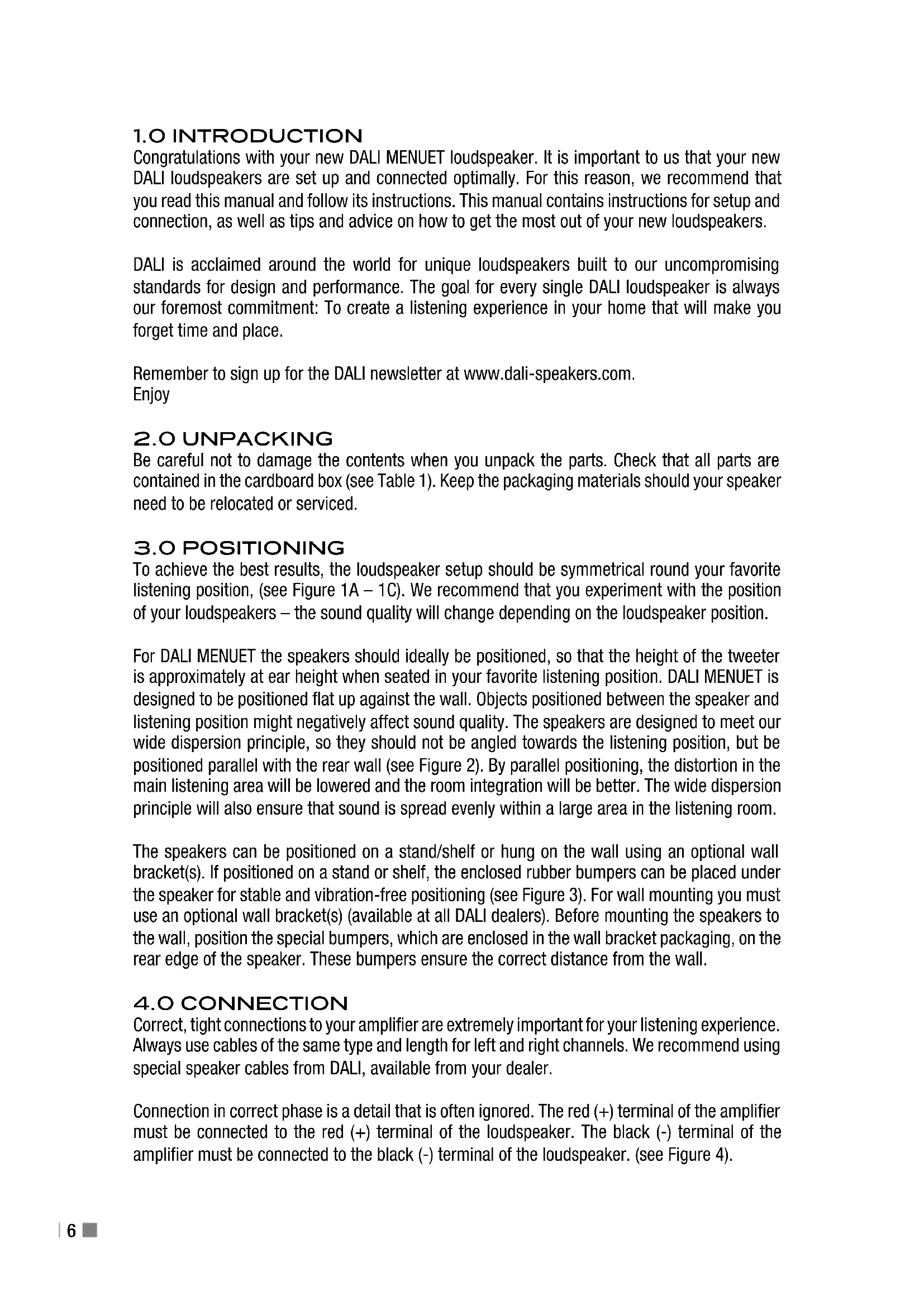 Congratulations with your new DALI MENUET loudspeaker. It is important to us that your new DALI loudspeakers are set up and connected optimally. For this reason, we recommend that you read this manual and follow its instructions. This manual contains instructions for setup and connection, as well as tips and advice on how to get the most out of your new loudspeakers. DALI is acclaimed around the world for unique loudspeakers built to our uncompromising standards for design and performance. The goal for every single DALI loudspeaker is always our foremost commitment: To create a listening experience in your home that will make you forget time and place. Remember to sign up for the DALI newsletter at www.dali-speakers.com. Enjoy