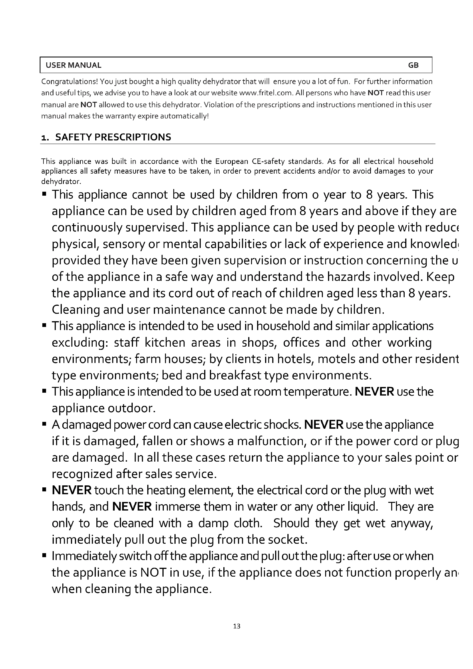 This appliance was built in accordance with the European CE-safety standards. As for all electrical household appliances all safety measures have to be taken, in order to prevent accidents and/or to avoid damages to your dehydrator.