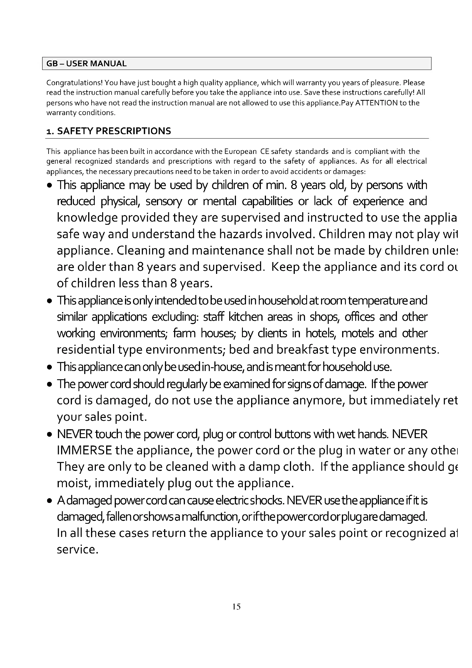 Congratulations! You have just bought a high quality appliance, which will warranty you years of pleasure. Please read the instruction manual carefully before you take the appliance into use. Save these instructions carefully! All persons who have not read the instruction manual are not allowed to use this appliance.Pay ATTENTION to the warranty conditions.