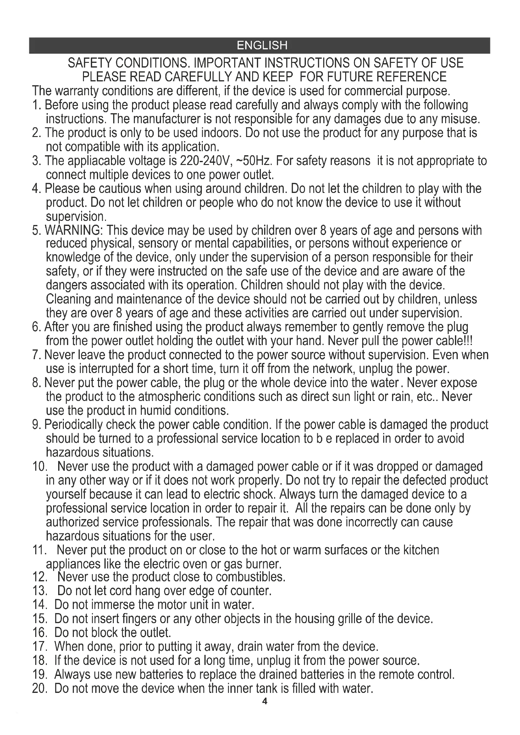 SAFETY CONDITIONS. IMPORTANT INSTRUCTIONS ON SAFETY OF USE PLEASE READ CAREFULLY AND KEEP FOR FUTURE REFERENCE The warranty conditions are different, if the device is used for commercial purpose.