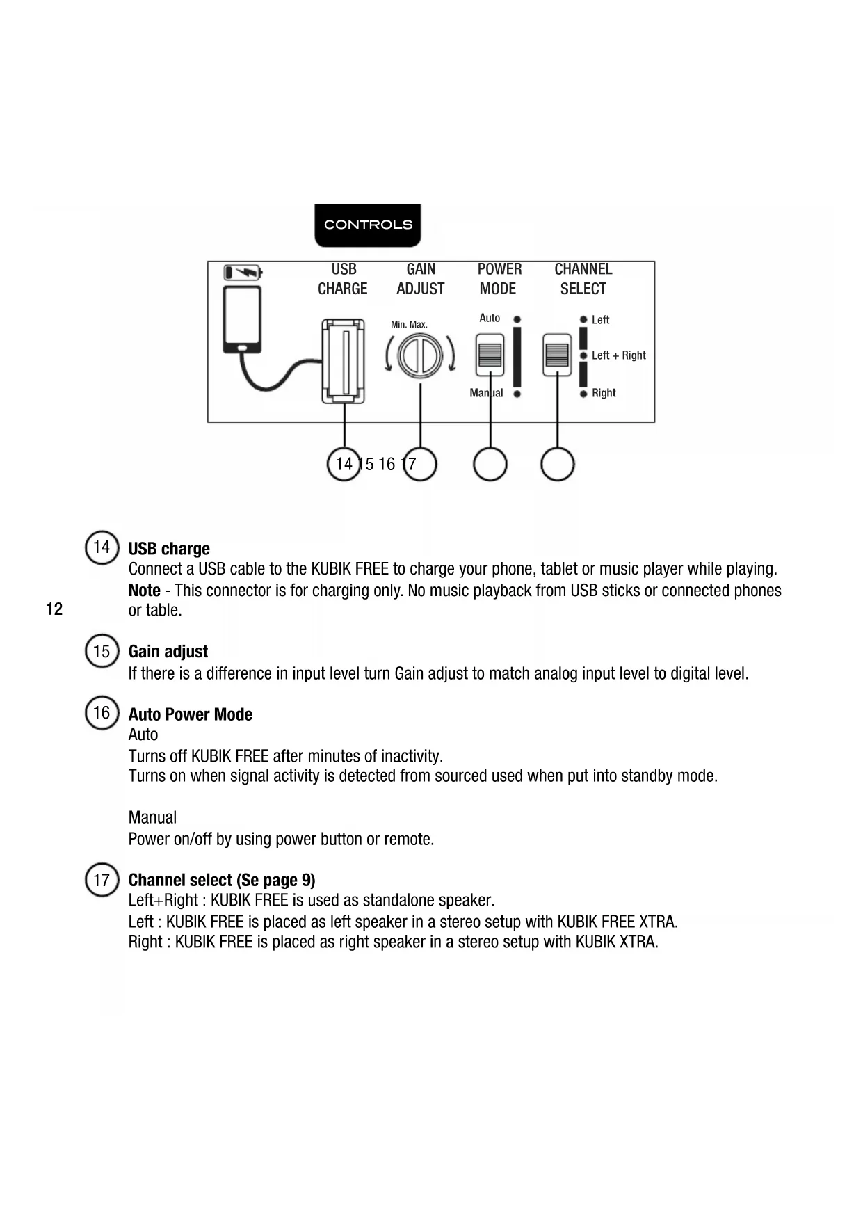 Min. Max. USB CHARGE Auto Manual Left Right Left + Right GAIN ADJUST POWER MODE CHANNEL SELECT USB charge Connect a USB cable to the KUBIK FREE to charge your phone, tablet or music player while playing. Note - This connector is for charging only. No music playback from USB sticks or connected phones or table. Gain adjust If there is a difference in input level turn Gain adjust to match analog input level to digital level. Auto Power Mode Auto Turns off KUBIK FREE after minutes of inactivity. Turns on when signal activity is detected from sourced used when put into standby mode. Manual Power on/off by using power button or remote. Channel select (Se page 9) Left+Right : KUBIK FREE is used as standalone speaker. Left : KUBIK FREE is placed as left speaker in a stereo setup with KUBIK FREE XTRA. Right : KUBIK FREE is placed as right speaker in a stereo setup with KUBIK XTRA.