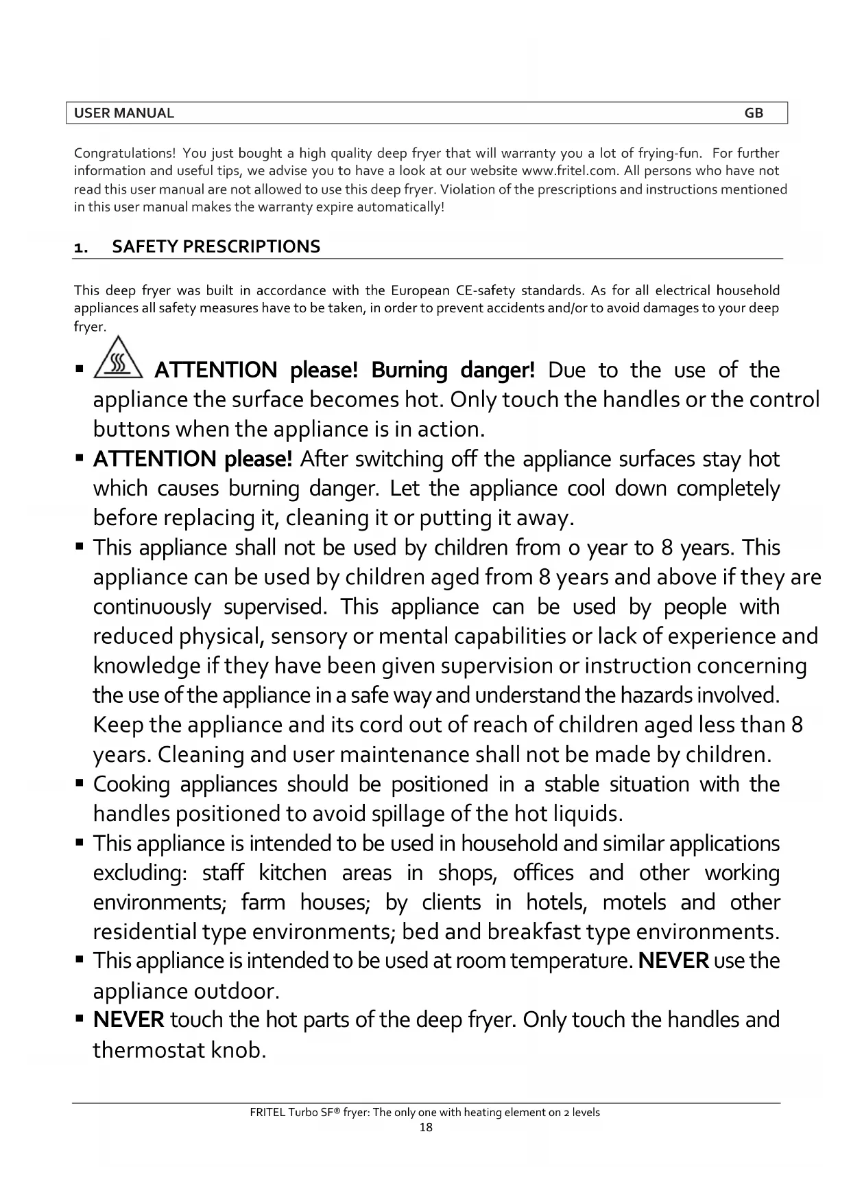 Congratulations! You just bought a high quality deep fryer that will warranty you a lot of frying-fun. For further information and useful tips, we advise you to have a look at our website www.fritel.com. All persons who have not read this user manual are not allowed to use this deep fryer. Violation of the prescriptions and instructions mentioned in this user manual makes the warranty expire automatically!