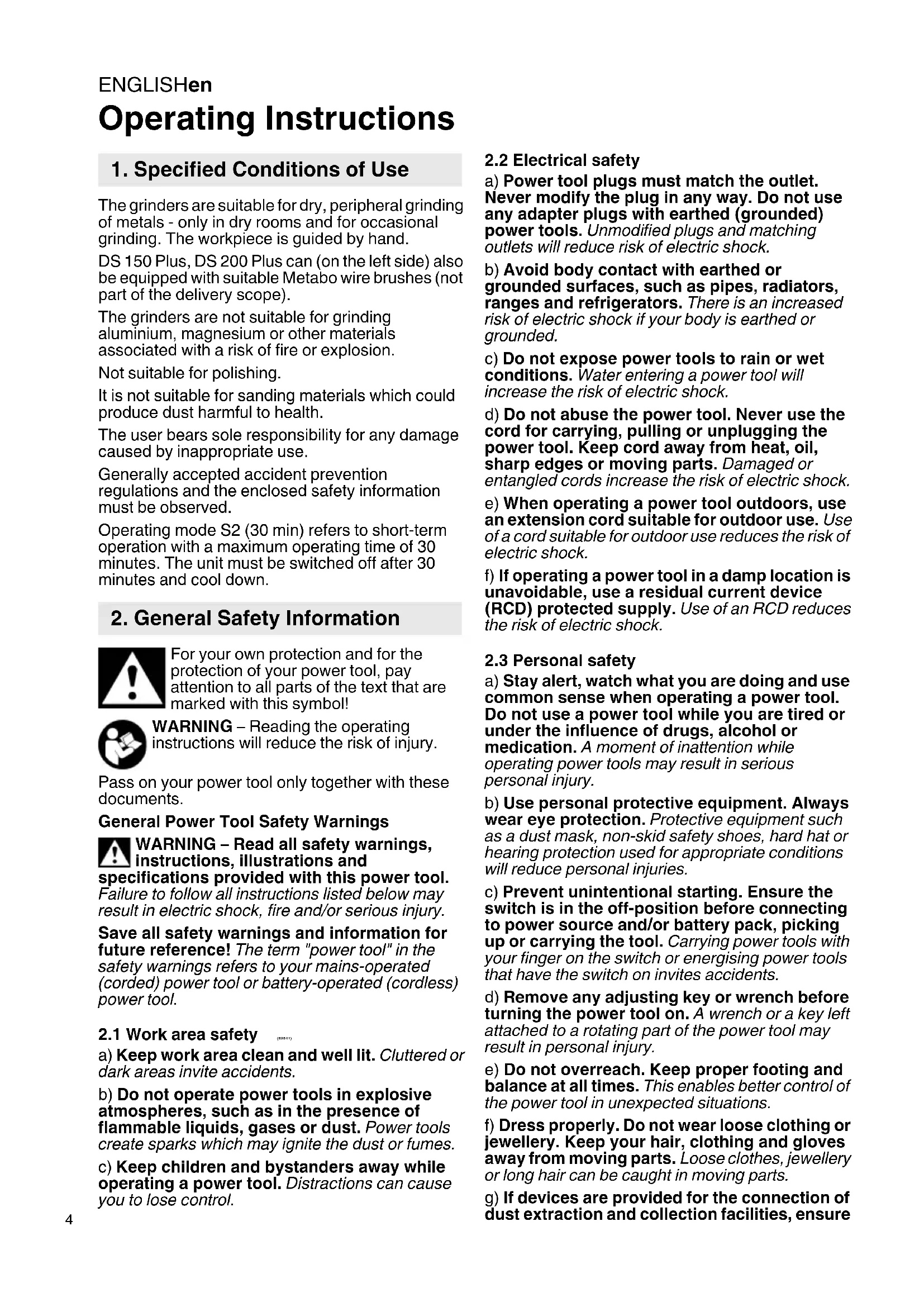 Operating Instructions The grinders are suitable for dry, peripheral grinding of metals - only in dry rooms and for occasional grinding. The workpiece is guided by hand. DS 150 Plus, DS 200 Plus can (on the left side) also be equipped with suitable Metabo wire brushes (not part of the delivery scope). The grinders are not suitable for grinding aluminium, magnesium or other materials associated with a risk of fire or explosion. Not suitable for polishing. It is not suitable for sanding materials which could produce dust harmful to health. The user bears sole responsibility for any damage caused by inappropriate use. Generally accepted accident prevention regulations and the enclosed safety information must be observed. Operating mode S2 (30 min) refers to short-term operation with a maximum operating time of 30 minutes. The unit must be switched off after 30 minutes and cool down. For your own protection and for the protection of your power tool, pay attention to all parts of the text that are marked with this symbol! WARNING – Reading the operating instructions will reduce the risk of injury. Pass on your power tool only together with these documents. General Power Tool Safety Warnings WARNING – Read all safety warnings, instructions, illustrations and specifications provided with this power tool. Failure to follow all instructions listed below may result in electric shock, fire and/or serious injury. Save all safety warnings and information for future reference! The term "power tool" in the safety warnings refers to your mains-operated (corded) power tool or battery-operated (cordless) power tool.