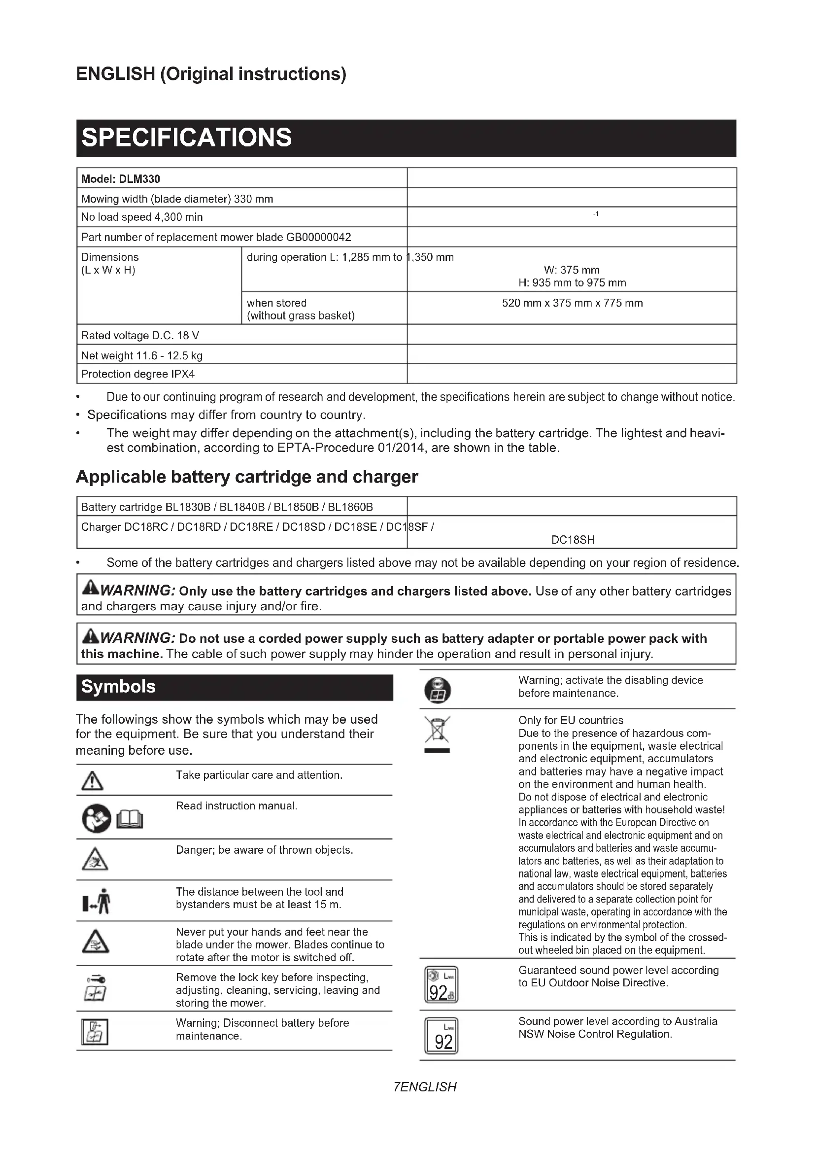 Fig.327 ENGLISH ENGLISH (Original instructions) SPECIFICATIONS Model: DLM330Mowing width (blade diameter) 330 mmNo load speed 4,300 min Part number of replacement mower blade GB00000042Dimensions (L x W x H)during operation L: 1,285 mm to 1,350 mm W: 375 mm H: 935 mm to 975 mmwhen stored (without grass basket)520 mm x 375 mm x 775 mmRated voltage D.C. 18 VNet weight 11.6 - 12.5 kgProtection degree IPX4