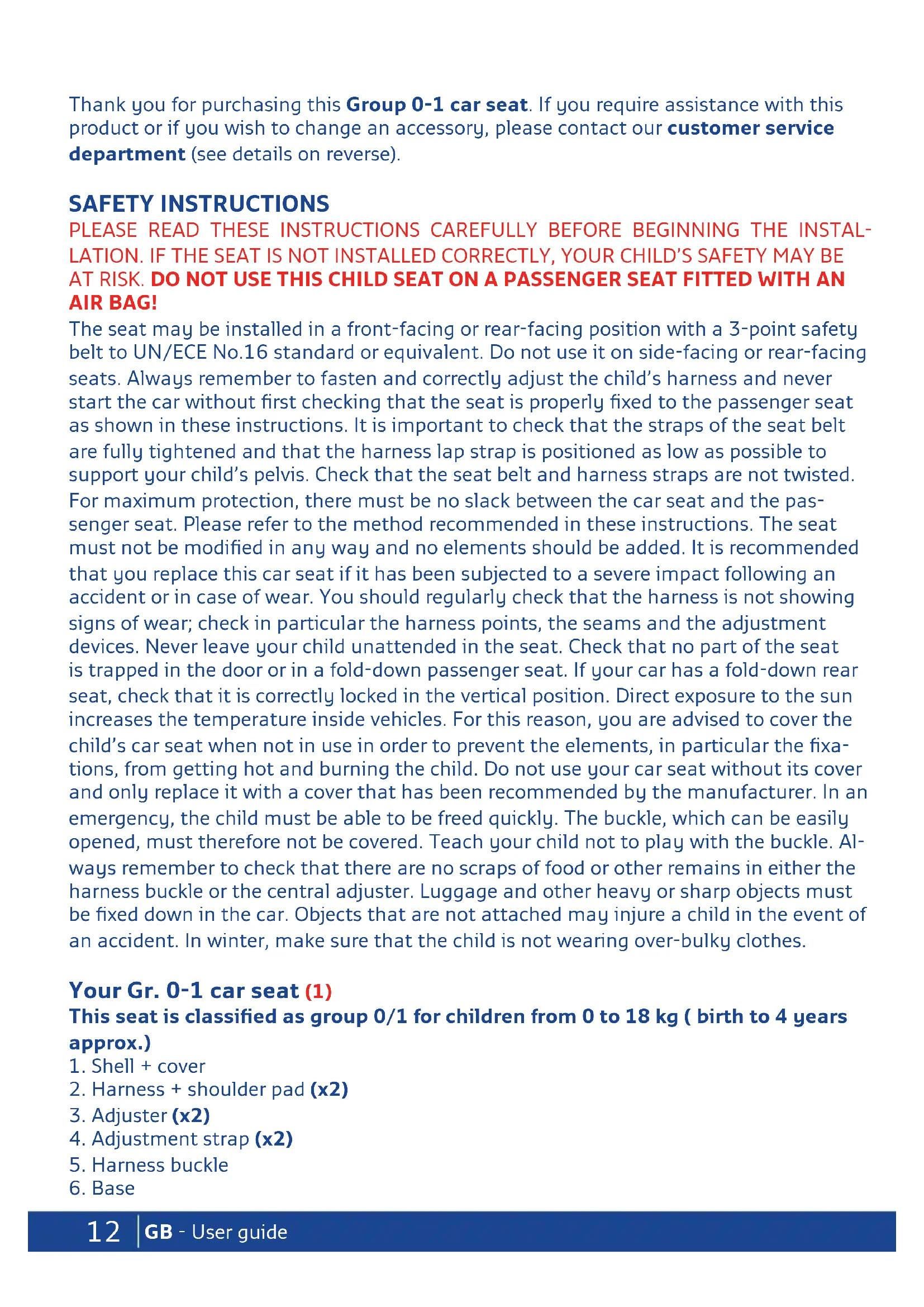 deur.12 GB - User guide Thank you for purchasing this Group 0-1 car seat. If you require assistance with this product or if you wish to change an accessory, please contact our customer service department (see details on reverse). SAFETY INSTRUCTIONS PLEASE READ THESE INSTRUCTIONS CAREFULLY BEFORE BEGINNING THE INSTAL- LATION. IF THE SEAT IS NOT INSTALLED CORRECTLY, YOUR CHILD’S SAFETY MAY BE AT RISK. DO NOT USE THIS CHILD SEAT ON A PASSENGER SEAT FITTED WITH AN AIR BAG! The seat may be installed in a front-facing or rear-facing position with a 3-point safety belt to UN/ECE No.16 standard or equivalent. Do not use it on side-facing or rear-facing seats. Always remember to fasten and correctly adjust the child’s harness and never start the car without first checking that the seat is properly fixed to the passenger seat as shown in these instructions. It is important to check that the straps of the seat belt are fully tightened and that the harness lap strap is positioned as low as possible to support your child’s pelvis. Check that the seat belt and harness straps are not twisted. For maximum protection, there must be no slack between the car seat and the pas- senger seat. Please refer to the method recommended in these instructions. The seat must not be modified in any way and no elements should be added. It is recommended that you replace this car seat if it has been subjected to a severe impact following an accident or in case of wear. You should regularly check that the harness is not showing signs of wear; check in particular the harness points, the seams and the adjustment devices. Never leave your child unattended in the seat. Check that no part of the seat is trapped in the door or in a fold-down passenger seat. If your car has a fold-down rear seat, check that it is correctly locked in the vertical position. Direct exposure to the sun increases the temperature inside vehicles. For this reason, you are advised to cover the child’s car seat when not in use in order to prevent the elements, in particular the fixa- tions, from getting hot and burning the child. Do not use your car seat without its cover and only replace it with a cover that has been recommended by the manufacturer. In an emergency, the child must be able to be freed quickly. The buckle, which can be easily opened, must therefore not be covered. Teach your child not to play with the buckle. Al- ways remember to check that there are no scraps of food or other remains in either the harness buckle or the central adjuster. Luggage and other heavy or sharp objects must be fixed down in the car. Objects that are not attached may injure a child in the event of an accident. In winter, make sure that the child is not wearing over-bulky clothes. Your Gr. 0-1 car seat (1) This seat is classified as group 0/1 for children from 0 to 18 kg ( birth to 4 years approx.)