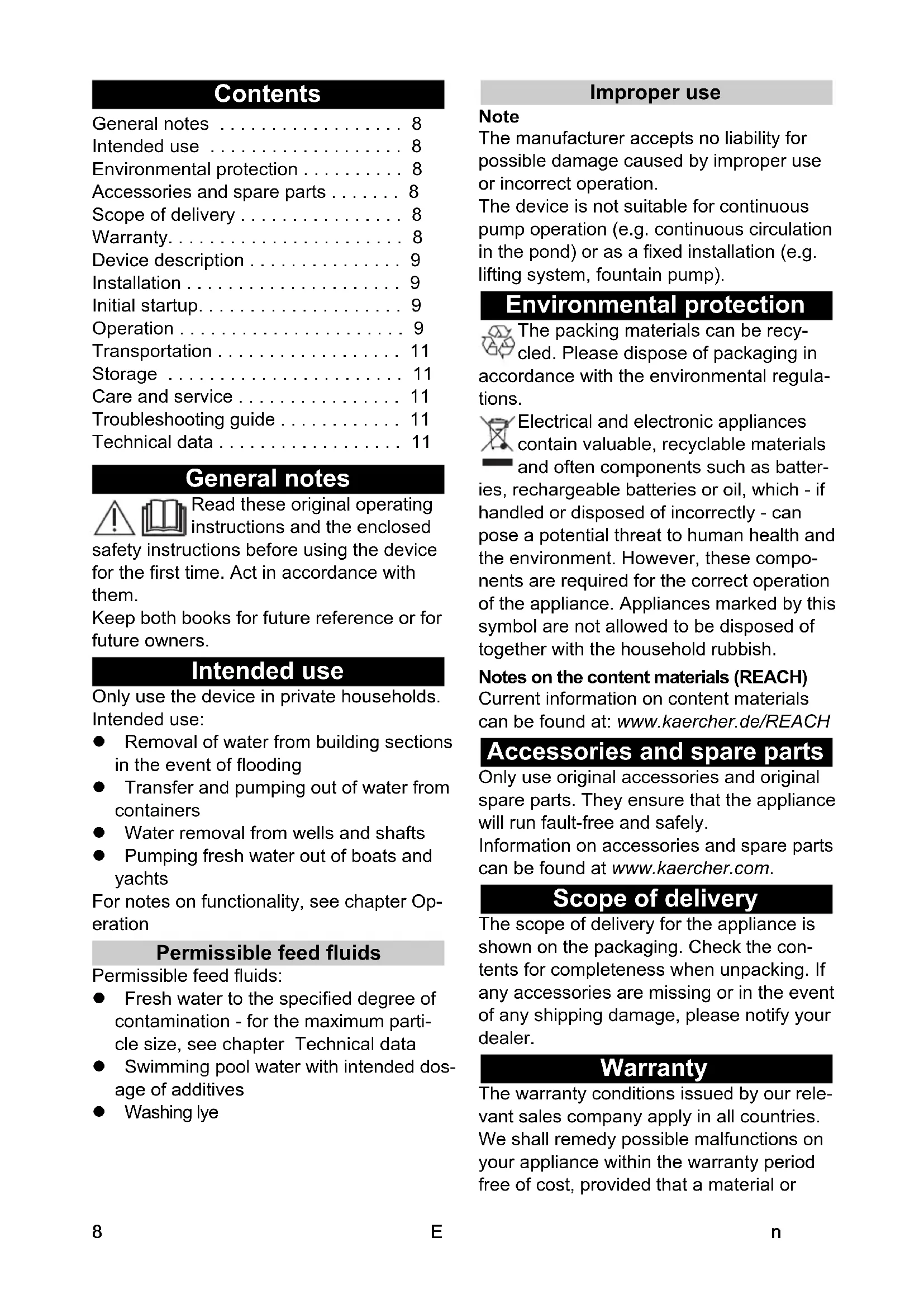 - Ausschalthöhe Schwim- merschalter (Arretierung unterste Position) mm 40-120 Manueller Betrieb Mindestflüssigkeitshöhe Schmutz- und Klarwas- serförderung mm 60 Restflüssigkeitshöhe Schmutz- und Klarwas- serförderung mm 25 Mindestflüssigkeitshöhe Flachabsaugung mm 40 Restflüssigkeitshöhe Flachabsaugung mm 1 Maße und Gewichte Gewicht (ohne Zubehör) kg 4,8 Netzkabel Kabellänge m 108English Contents General notes Read these original operating instructions and the enclosed safety instructions before using the device for the first time. Act in accordance with them. Keep both books for future reference or for future owners. Intended use Only use the device in private households. Intended use: Removal of water from building sections in the event of flooding Transfer and pumping out of water from containers Water removal from wells and shafts Pumping fresh water out of boats and yachts For notes on functionality, see chapter Op- eration Permissible feed fluids Permissible feed fluids: Fresh water to the specified degree of contamination - for the maximum parti- cle size, see chapter Technical data Swimming pool water with intended dos- age of additives Washing lye Improper use Note The manufacturer accepts no liability for possible damage caused by improper use or incorrect operation. The device is not suitable for continuous pump operation (e.g. continuous circulation in the pond) or as a fixed installation (e.g. lifting system, fountain pump). Environmental protection The packing materials can be recy- cled. Please dispose of packaging in accordance with the environmental regula- tions. Electrical and electronic appliances contain valuable, recyclable materials and often components such as batter- ies, rechargeable batteries or oil, which - if handled or disposed of incorrectly - can pose a potential threat to human health and the environment. However, these compo- nents are required for the correct operation of the appliance. Appliances marked by this symbol are not allowed to be disposed of together with the household rubbish. Notes on the content materials (REACH) Current information on content materials can be found at: www.kaercher .de/REACH Accessories and spare parts Only use original accessories and original spare parts. They ensure that the appliance will run fault-free and safely. Information on accessories and spare parts can be found at www.kaercher.com. Scope of delivery The scope of delivery for the appliance is shown on the packaging. Check the con- tents for completeness when unpacking. If any accessories are missing or in the event of any shipping damage, please notify your dealer. Warranty The warranty conditions issued by our rele- vant sales company apply in all countries. We shall remedy possible malfunctions on your appliance within the warranty period free of cost, provided that a material or General notes p. 8