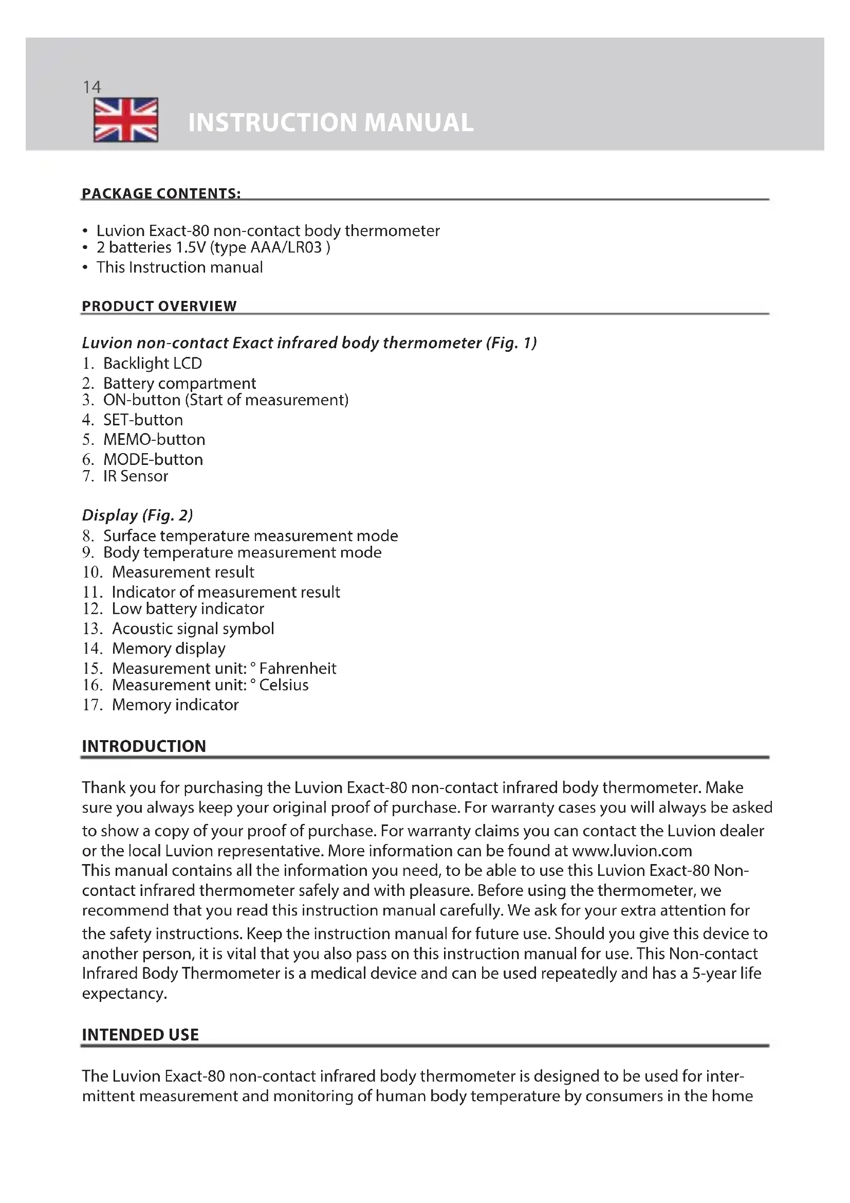 INTRODUCTION Thank you for purchasing the Luvion Exact-80 non-contact infrared body thermometer. Make sure you always keep your original proof of purchase. For warranty cases you will always be asked to show a copy of your proof of purchase. For warranty claims you can contact the Luvion dealer or the local Luvion representative. More information can be found at www.luvion.com This manual contains all the information you need, to be able to use this Luvion Exact-80 Non- contact infrared thermometer safely and with pleasure. Before using the thermometer, we recommend that you read this instruction manual carefully. We ask for your extra attention for the safety instructions. Keep the instruction manual for future use. Should you give this device to another person, it is vital that you also pass on this instruction manual for use. This Non-contact Infrared Body Thermometer is a medical device and can be used repeatedly and has a 5-year life expectancy. INTENDED USE The Luvion Exact-80 non-contact infrared body thermometer is designed to be used for inter- mittent measurement and monitoring of human body temperature by consumers in the home15 LUVION Premium Baby products