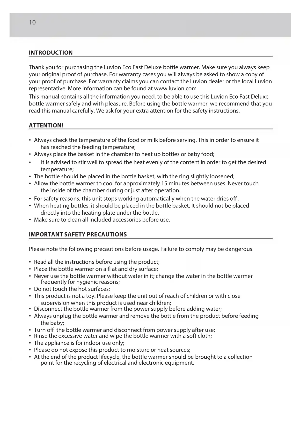 - At the end of the product lifecycle, the bottle warmer should be brought to a collection point for the recycling of electrical and electronic equipment.11 LUVION Premium Baby products INSTRUCTION MANUALTO HEAT UP QUICKLY: