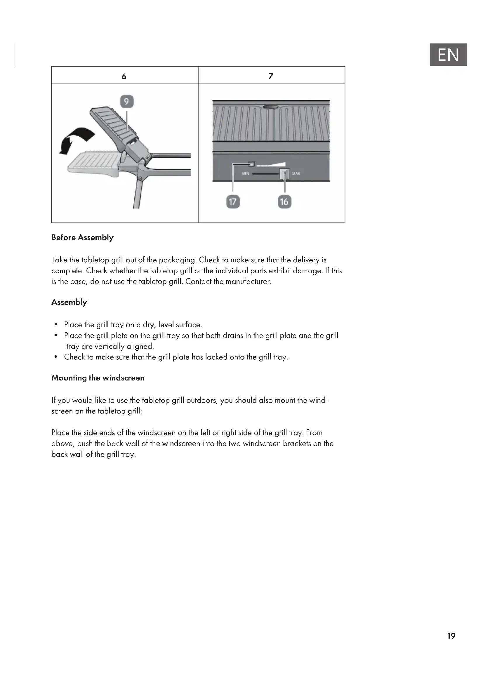 - Check to make sure that the grill plate has locked onto the grill tray. Mounting the windscreen If you would like to use the tabletop grill outdoors, you should also mount the wind- screen on the tabletop grill: Place the side ends of the windscreen on the left or right side of the grill tray. From above, push the back wall of the windscreen into the two windscreen brackets on the back wall of the grill tray.20