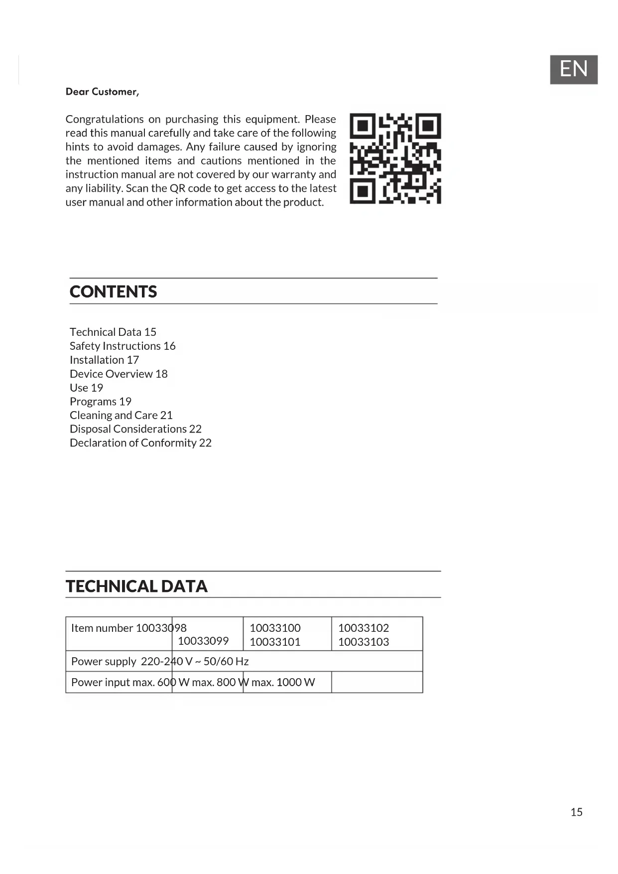Dear Customer, Congratulations on purchasing this equipment. Please read this manual carefully and take care of the following hints to avoid damages. Any failure caused by ignoring the mentioned items and cautions mentioned in the instruction manual are not covered by our warranty and any liability. Scan the QR code to get access to the latest user manual and other information about the product. TECHNICAL DATA Item number 10033098