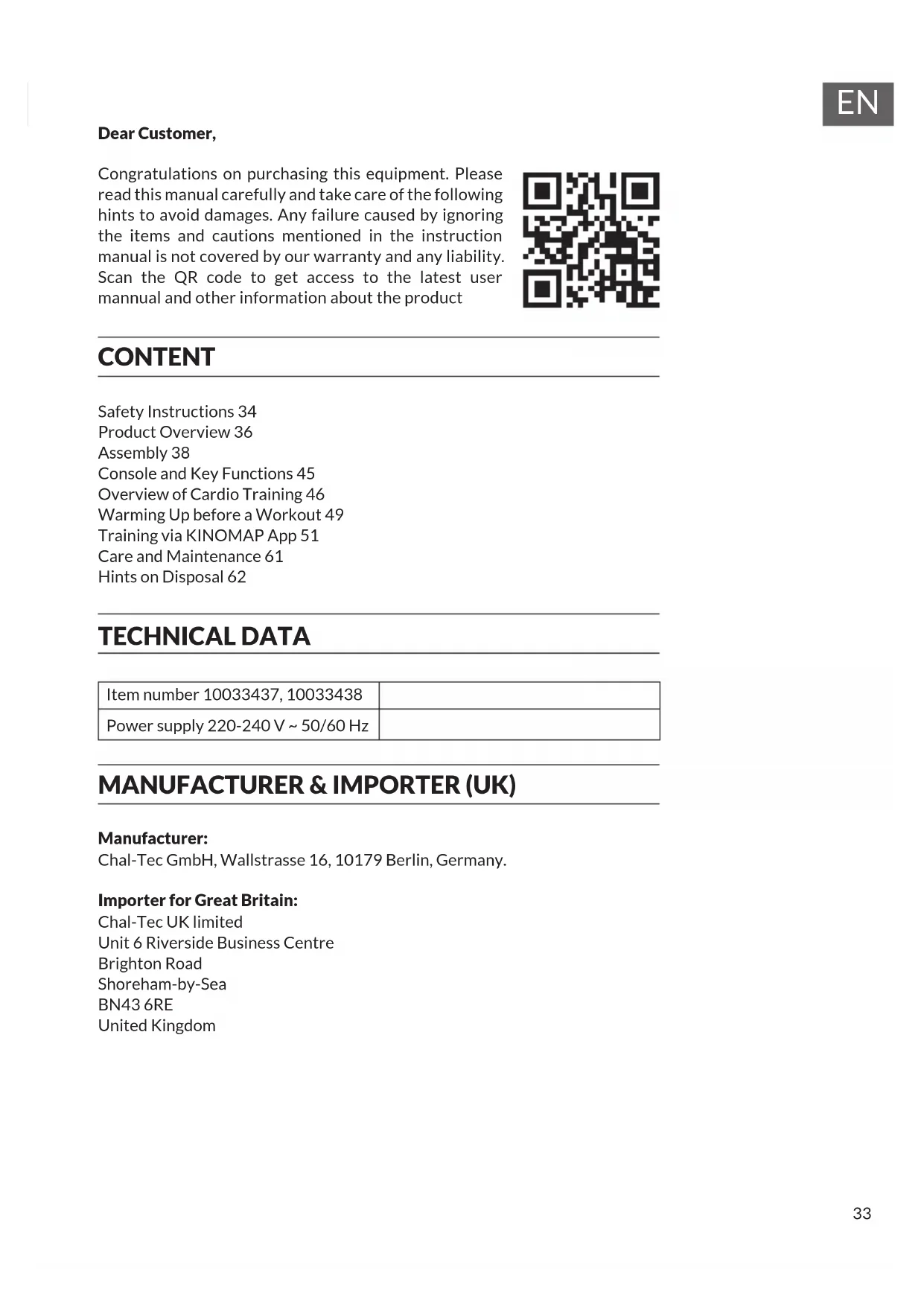 Dear Customer, Congratulations on purchasing this equipment. Please read this manual carefully and take care of the following hints to avoid damages. Any failure caused by ignoring the items and cautions mentioned in the instruction manual is not covered by our warranty and any liability. Scan the QR code to get access to the latest user mannual and other information about the product CONTENT Safety Instructions 34 Product Overview 36 Assembly 38 Console and Key Functions 45 Overview of Cardio Training 46 Warming Up before a Workout 49 Training via KINOMAP App 51 Care and Maintenance 61 Hints on Disposal 62 TECHNICAL DATA Item number 10033437, 10033438 Power supply 220-240 V ~ 50/60 Hz MANUFACTURER & IMPORTER (UK) Manufacturer: Chal-Tec GmbH, Wallstrasse 16, 10179 Berlin, Germany. Importer for Great Britain: Chal-Tec UK limited Unit 6 Riverside Business Centre Brighton Road Shoreham-by-Sea BN43 6RE United Kingdom34