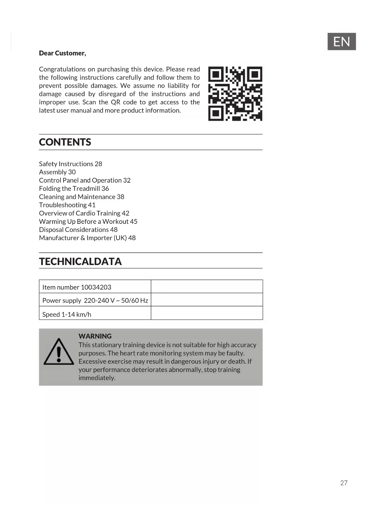 Dear Customer, Congratulations on purchasing this device. Please read the following instructions carefully and follow them to prevent possible damages. We assume no liability for damage caused by disregard of the instructions and improper use. Scan the QR code to get access to the latest user manual and more product information. CONTENTS Safety Instructions 28 Assembly 30 Control Panel and Operation 32 Folding the Treadmill 36 Cleaning and Maintenance 38 Troubleshooting 41 Overview of Cardio Training 42 Warming Up Before a Workout 45 Disposal Considerations 48 Manufacturer & Importer (UK) 48 TECHNICAL DATA Item number 10034203 Power supply 220-240 V ~ 50/60 Hz Speed 1-14 km/h WARNING This stationary training device is not suitable for high accuracy purposes. The heart rate monitoring system may be faulty. Excessive exercise may result in dangerous injury or death. If your performance deteriorates abnormally, stop training immediately.28
