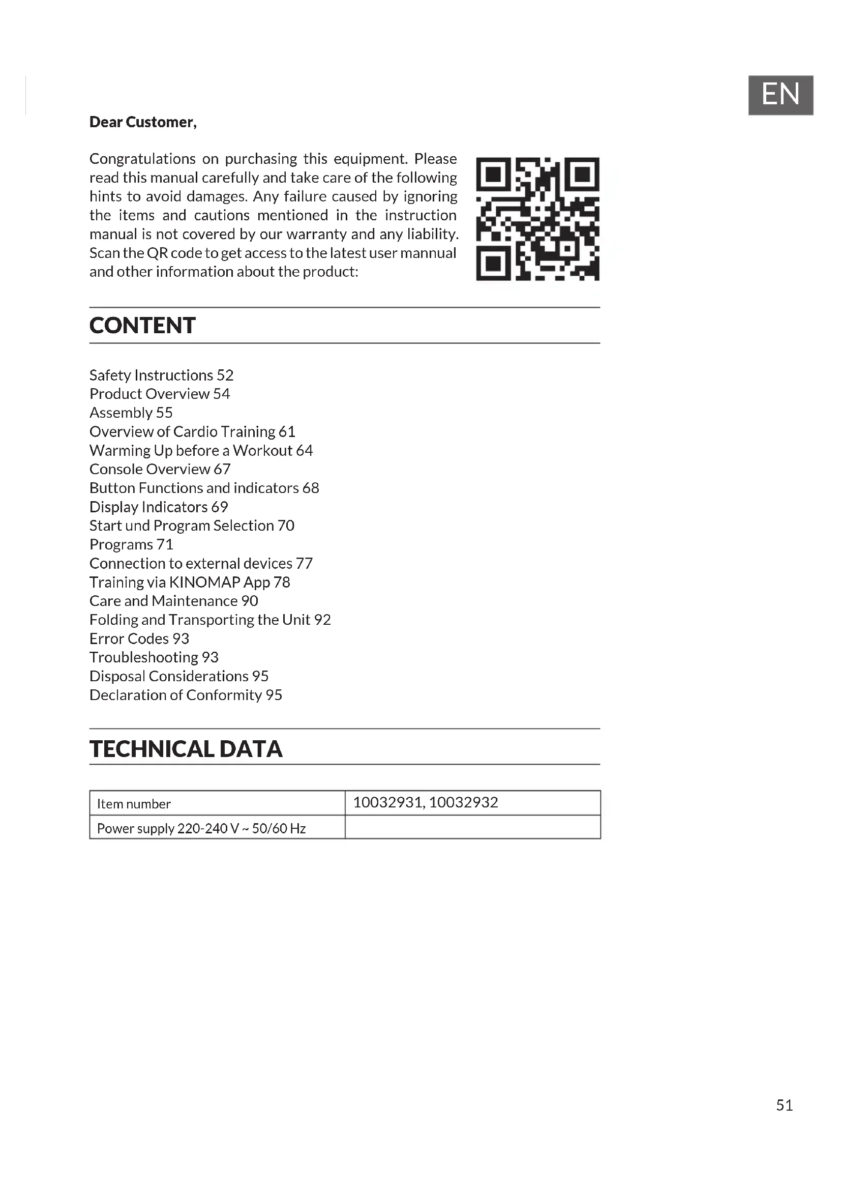 Dear Customer, Congratulations on purchasing this equipment. Please read this manual carefully and take care of the following hints to avoid damages. Any failure caused by ignoring the items and cautions mentioned in the instruction manual is not covered by our warranty and any liability. Scan the QR code to get access to the latest user mannual and other information about the product: CONTENT Safety Instructions 52 Product Overview 54 Assembly 55 Overview of Cardio Training 61 Warming Up before a Workout 64 Console Overview 67 Button Functions and indicators 68 Display Indicators 69 Start und Program Selection 70 Programs 71 Connection to external devices 77 Training via KINOMAP App 78 Care and Maintenance 90 Folding and Transporting the Unit 92 Error Codes 93 Troubleshooting 93 Disposal Considerations 95 Declaration of Conformity 95 TECHNICAL DATA Item number 10032931, 10032932 Power supply 220-240 V ~ 50/60 Hz52