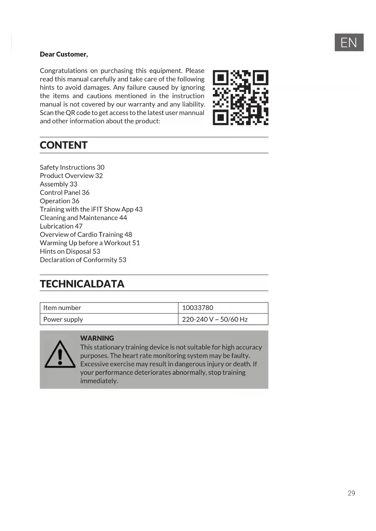 Dear Customer, Congratulations on purchasing this equipment. Please read this manual carefully and take care of the following hints to avoid damages. Any failure caused by ignoring the items and cautions mentioned in the instruction manual is not covered by our warranty and any liability. Scan the QR code to get access to the latest user mannual and other information about the product: CONTENT Safety Instructions 30 Product Overview 32 Assembly 33 Control Panel 36 Operation 36 Training with the iFIT Show App 43 Cleaning and Maintenance 44 Lubrication 47 Overview of Cardio Training 48 Warming Up before a Workout 51 Hints on Disposal 53 Declaration of Conformity 53 TECHNICAL DATA Item number
