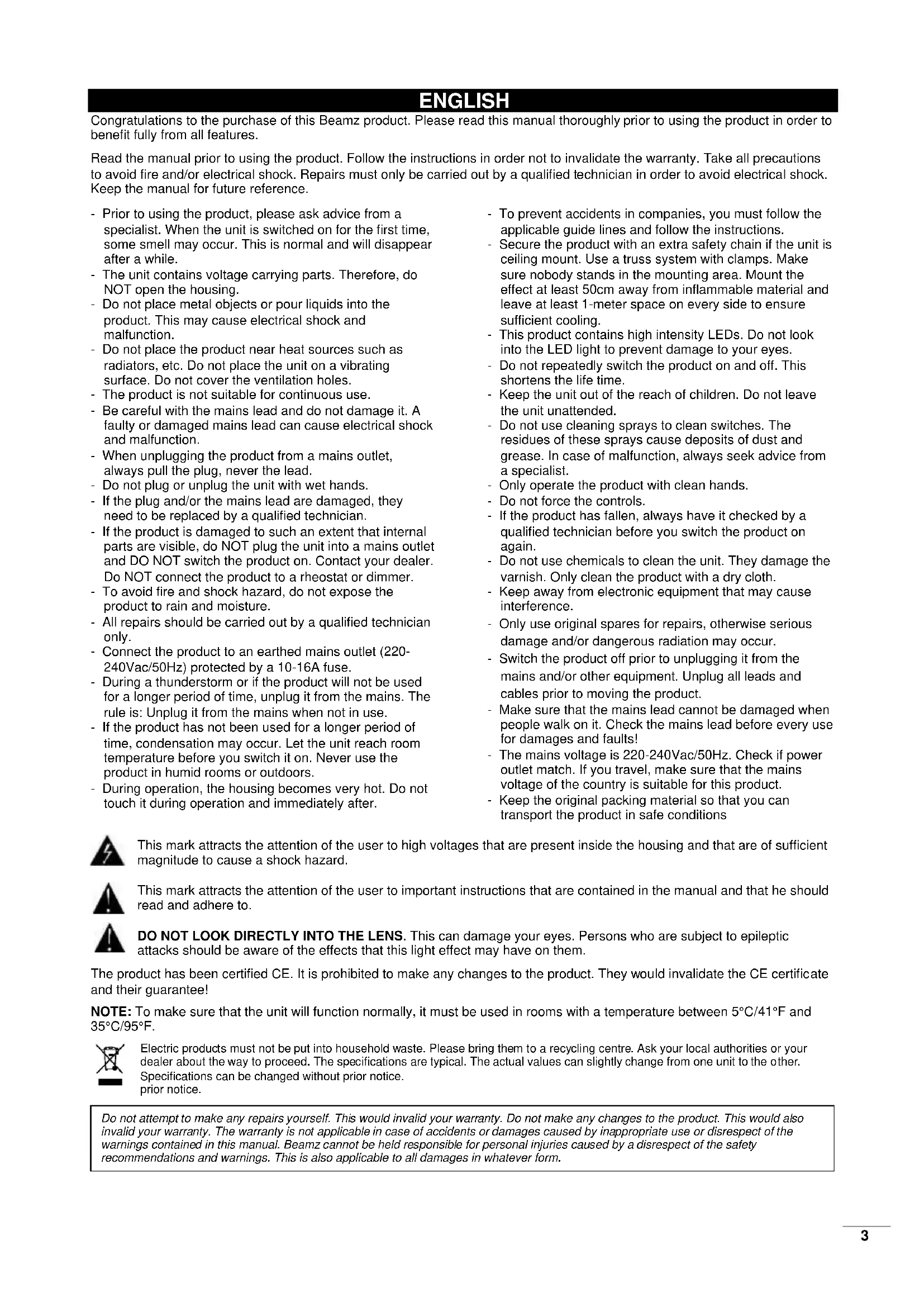 V1.123 ENGLISH Congratulations to the purchase of this Beamz product. Please read this manual thoroughly prior to using the product in order to benefit fully from all features. Read the manual prior to using the product. Follow the instructions in order not to invalidate the warranty. Take all precautions to avoid fire and/or electrical shock. Repairs must only be carried out by a qualified technician in order to avoid electrical shock. Keep the manual for future reference. - Prior to using the product, please ask advice from a specialist. When the unit is switched on for the first time, some smell may occur. This is normal and will disappear after a while. - The unit contains voltage carrying parts. Therefore, do NOT open the housing. - Do not place metal objects or pour liquids into the product. This may cause electrical shock and malfunction. - Do not place the product near heat sources such as radiators, etc. Do not place the unit on a vibrating surface. Do not cover the ventilation holes. - The product is not suitable for continuous use. - Be careful with the mains lead and do not damage it. A faulty or damaged mains lead can cause electrical shock and malfunction. - When unplugging the product from a mains outlet, always pull the plug, never the lead. - Do not plug or unplug the unit with wet hands. - If the plug and/or the mains lead are damaged, they need to be replaced by a qualified technician. - If the product is damaged to such an extent that internal parts are visible, do NOT plug the unit into a mains outlet and DO NOT switch the product on. Contact your dealer. Do NOT connect the product to a rheostat or dimmer. - To avoid fire and shock hazard, do not expose the product to rain and moisture. - All repairs should be carried out by a qualified technician only. - Connect the product to an earthed mains outlet (220- 240Vac/50Hz) protected by a 10-16A fuse. - During a thunderstorm or if the product will not be used for a longer period of time, unplug it from the mains. The rule is: Unplug it from the mains when not in use. - If the product has not been used for a longer period of time, condensation may occur. Let the unit reach room temperature before you switch it on. Never use the product in humid rooms or outdoors. - During operation, the housing becomes very hot. Do not touch it during operation and immediately after. - To prevent accidents in companies, you must follow the applicable guide lines and follow the instructions. - Secure the product with an extra safety chain if the unit is ceiling mount. Use a truss system with clamps. Make sure nobody stands in the mounting area. Mount the effect at least 50cm away from inflammable material and leave at least 1-meter space on every side to ensure sufficient cooling. - This product contains high intensity LEDs. Do not look into the LED light to prevent damage to your eyes. - Do not repeatedly switch the product on and off. This shortens the life time. - Keep the unit out of the reach of children. Do not leave the unit unattended. - Do not use cleaning sprays to clean switches. The residues of these sprays cause deposits of dust and grease. In case of malfunction, always seek advice from a specialist. - Only operate the product with clean hands. - Do not force the controls. - If the product has fallen, always have it checked by a qualified technician before you switch the product on again. - Do not use chemicals to clean the unit. They damage the varnish. Only clean the product with a dry cloth. - Keep away from electronic equipment that may cause interference. - Only use original spares for repairs, otherwise serious damage and/or dangerous radiation may occur. - Switch the product off prior to unplugging it from the mains and/or other equipment. Unplug all leads and cables prior to moving the product. - Make sure that the mains lead cannot be damaged when people walk on it. Check the mains lead before every use for damages and faults! - The mains voltage is 220-240Vac/50Hz. Check if power outlet match. If you travel, make sure that the mains voltage of the country is suitable for this product. - Keep the original packing material so that you can transport the product in safe conditions This mark attracts the attention of the user to high voltages that are present inside the housing and that are of sufficient magnitude to cause a shock hazard. This mark attracts the attention of the user to important instructions that are contained in the manual and that he should read and adhere to. DO NOT LOOK DIRECTLY INTO THE LENS. This can damage your eyes. Persons who are subject to epileptic attacks should be aware of the effects that this light effect may have on them. The product has been certified CE. It is prohibited to make any changes to the product. They would invalidate the CE certificate and their guarantee! NOTE: To make sure that the unit will function normally, it must be used in rooms with a temperature between 5°C/41°F and 35°C/95°F. Electric products must not be put into household waste. Please bring them to a recycling centre. Ask your local authorities or your dealer about the way to proceed. The specifications are typical. The actual values can slightly change from one unit to the other. Specifications can be changed without prior notice. prior notice. Do not attempt to make any repairs yourself. This would invalid your warranty. Do not make any changes to the product. This would also invalid your warranty. The warranty is not applicable in case of accidents or damages caused by inappropriate use or disrespect of the warnings contained in this manual. Beamz cannot be held responsible for personal injuries caused by a disrespect of the safety recommendations and warnings. This is also applicable to all damages in whatever form.4 UNPACKING INSTRUCTION CAUTION! Immediately upon receiving the product, carefully unpack the carton, check the contents to ensure that all parts are present, and have been received in good c