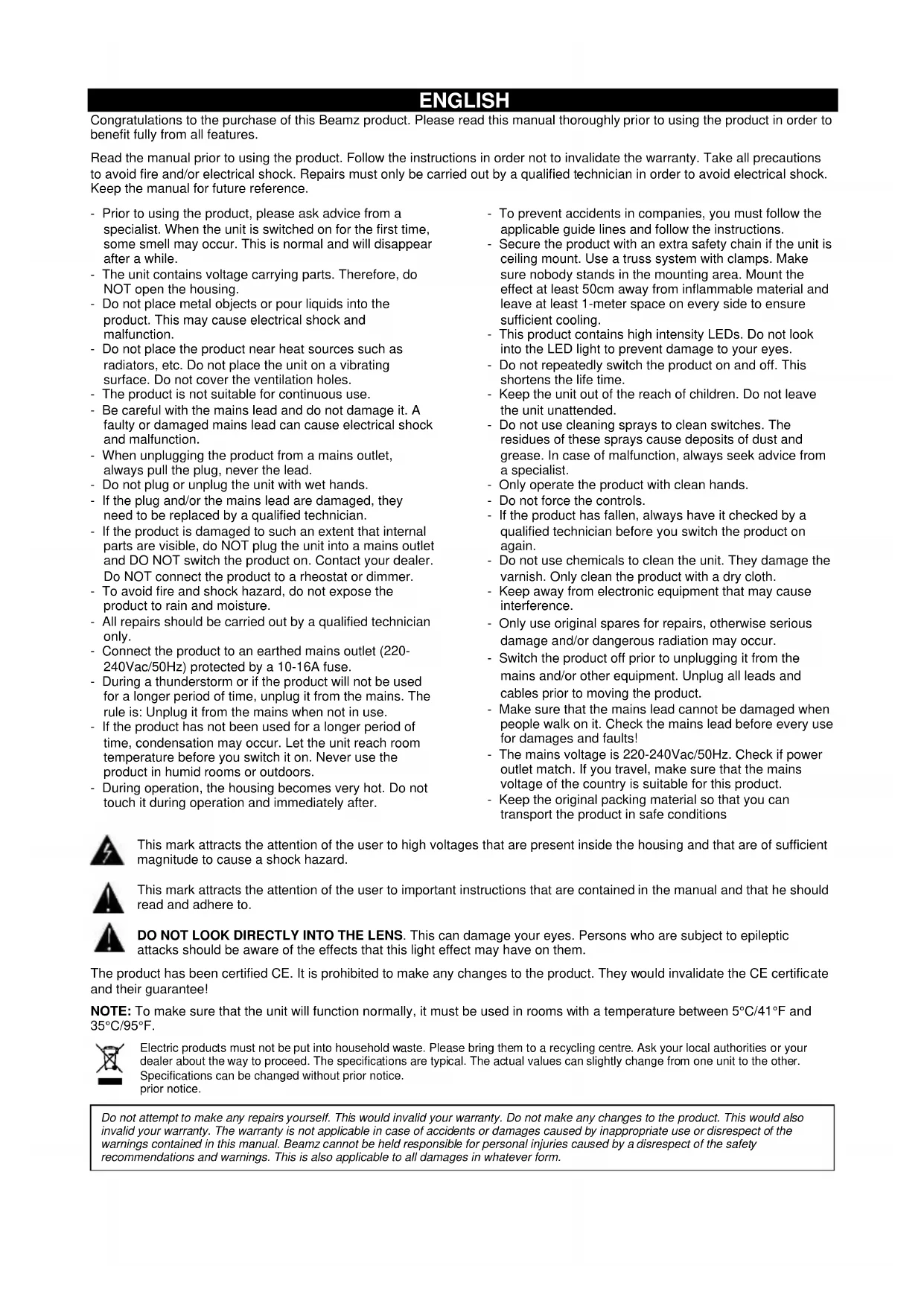 V2.1ENGLISH Congratulations to the purchase of this Beamz product. Please read this manual thoroughly prior to using the product in order to benefit fully from all features. Read the manual prior to using the product. Follow the instructions in order not to invalidate the warranty. Take all precautions to avoid fire and/or electrical shock. Repairs must only be carried out by a qualified technician in order to avoid electrical shock. Keep the manual for future reference. - Prior to using the product, please ask advice from a specialist. When the unit is switched on for the first time, some smell may occur. This is normal and will disappear after a while. - The unit contains voltage carrying parts. Therefore, do NOT open the housing. - Do not place metal objects or pour liquids into the product. This may cause electrical shock and malfunction. - Do not place the product near heat sources such as radiators, etc. Do not place the unit on a vibrating surface. Do not cover the ventilation holes. - The product is not suitable for continuous use. - Be careful with the mains lead and do not damage it. A faulty or damaged mains lead can cause electrical shock and malfunction. - When unplugging the product from a mains outlet, always pull the plug, never the lead. - Do not plug or unplug the unit with wet hands. - If the plug and/or the mains lead are damaged, they need to be replaced by a qualified technician. - If the product is damaged to such an extent that internal parts are visible, do NOT plug the unit into a mains outlet and DO NOT switch the product on. Contact your dealer. Do NOT connect the product to a rheostat or dimmer. - To avoid fire and shock hazard, do not expose the product to rain and moisture. - All repairs should be carried out by a qualified technician only. - Connect the product to an earthed mains outlet (220- 240Vac/50Hz) protected by a 10-16A fuse. - During a thunderstorm or if the product will not be used for a longer period of time, unplug it from the mains. The rule is: Unplug it from the mains when not in use. - If the product has not been used for a longer period of time, condensation may occur. Let the unit reach room temperature before you switch it on. Never use the product in humid rooms or outdoors. - During operation, the housing becomes very hot. Do not touch it during operation and immediately after. - To prevent accidents in companies, you must follow the applicable guide lines and follow the instructions. - Secure the product with an extra safety chain if the unit is ceiling mount. Use a truss system with clamps. Make sure nobody stands in the mounting area. Mount the effect at least 50cm away from inflammable material and leave at least 1-meter space on every side to ensure sufficient cooling. - This product contains high intensity LEDs. Do not look into the LED light to prevent damage to your eyes. - Do not repeatedly switch the product on and off. This shortens the life time. - Keep the unit out of the reach of children. Do not leave the unit unattended. - Do not use cleaning sprays to clean switches. The residues of these sprays cause deposits of dust and grease. In case of malfunction, always seek advice from a specialist. - Only operate the product with clean hands. - Do not force the controls. - If the product has fallen, always have it checked by a qualified technician before you switch the product on again. - Do not use chemicals to clean the unit. They damage the varnish. Only clean the product with a dry cloth. - Keep away from electronic equipment that may cause interference. - Only use original spares for repairs, otherwise serious damage and/or dangerous radiation may occur. - Switch the product off prior to unplugging it from the mains and/or other equipment. Unplug all leads and cables prior to moving the product. - Make sure that the mains lead cannot be damaged when people walk on it. Check the mains lead before every use for damages and faults! - The mains voltage is 220-240Vac/50Hz. Check if power outlet match. If you travel, make sure that the mains voltage of the country is suitable for this product. - Keep the original packing material so that you can transport the product in safe conditions This mark attracts the attention of the user to high voltages that are present inside the housing and that are of sufficient magnitude to cause a shock hazard. This mark attracts the attention of the user to important instructions that are contained in the manual and that he should read and adhere to. DO NOT LOOK DIRECTLY INTO THE LENS. This can damage your eyes. Persons who are subject to epileptic attacks should be aware of the effects that this light effect may have on them. The product has been certified CE. It is prohibited to make any changes to the product. They would invalidate the CE certificate and their guarantee! NOTE: To make sure that the unit will function normally, it must be used in rooms with a temperature between 5°C/41°F and 35°C/95°F. Electric products must not be put into household waste. Please bring them to a recycling centre. Ask your local authorities or your dealer about the way to proceed. The specifications are typical. The actual values can slightly change from one unit to the other. Specifications can be changed without prior notice. prior notice. Do not attempt to make any repairs yourself. This would invalid your warranty. Do not make any changes to the product. This would also invalid your warranty. The warranty is not applicable in case of accidents or damages caused by inappropriate use or disrespect of the warnings contained in this manual. Beamz cannot be held responsible for personal injuries caused by a disrespect of the safety recommendations and warnings. This is also applicable to all damages in whatever form.UNPACKING INSTRUCTION CAUTION! Immediately upon receiving the product, carefully unpack the carton, check the contents to ensure that all parts are present, and have been received in good condit