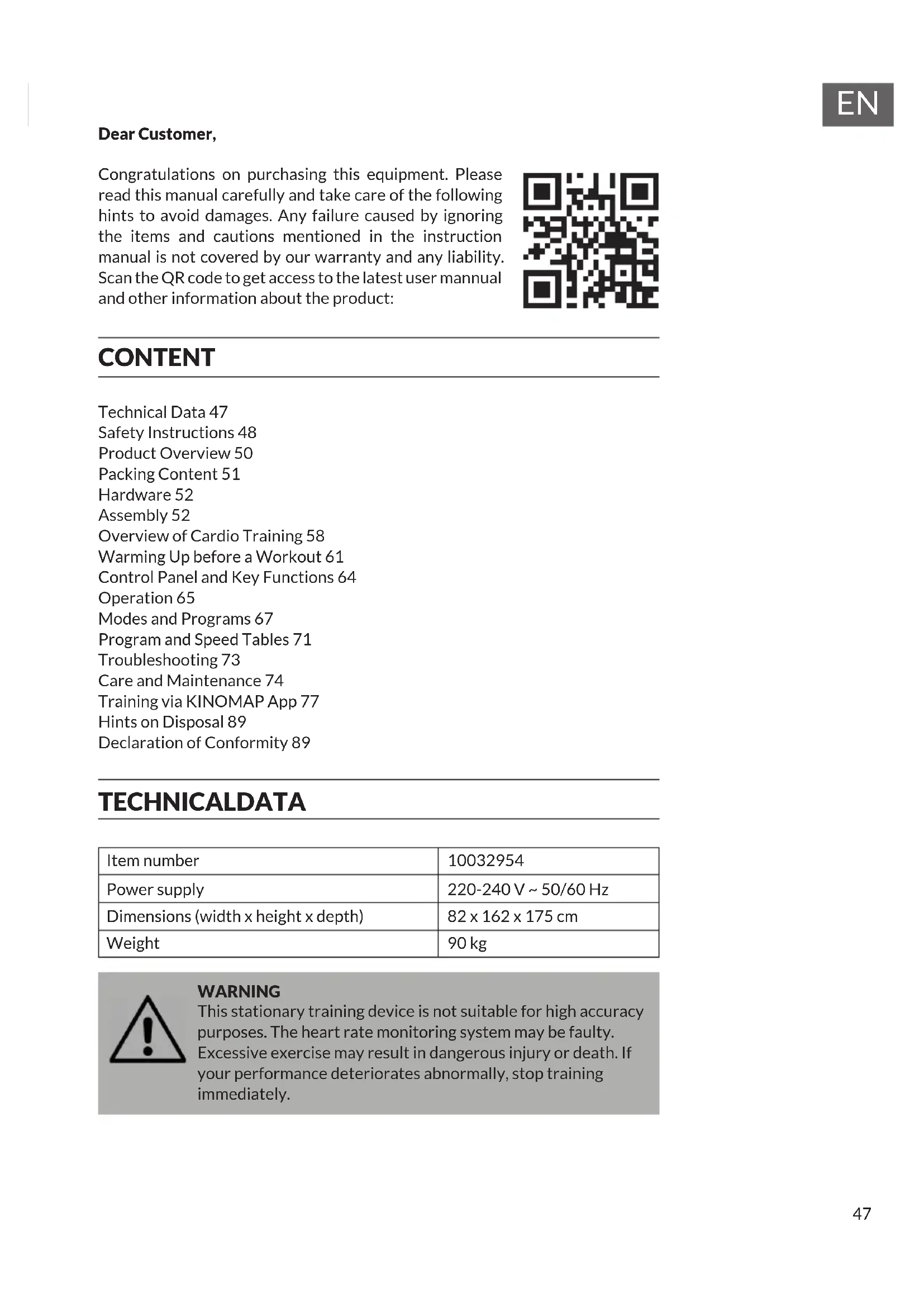 Dear Customer, Congratulations on purchasing this equipment. Please read this manual carefully and take care of the following hints to avoid damages. Any failure caused by ignoring the items and cautions mentioned in the instruction manual is not covered by our warranty and any liability. Scan the QR code to get access to the latest user mannual and other information about the product: CONTENT Technical Data 47 Safety Instructions 48 Product Overview 50 Packing Content 51 Hardware 52 Assembly 52 Overview of Cardio Training 58 Warming Up before a Workout 61 Control Panel and Key Functions 64 Operation 65 Modes and Programs 67 Program and Speed Tables 71 Troubleshooting 73 Care and Maintenance 74 Training via KINOMAP App 77 Hints on Disposal 89 Declaration of Conformity 89 TECHNICAL DATA Item number