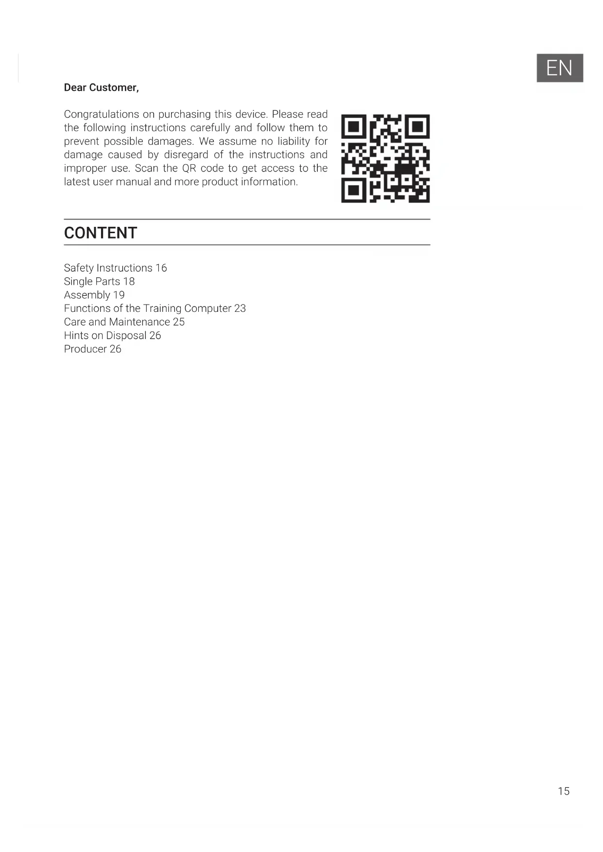 Dear Customer, Congratulations on purchasing this device. Please read the following instructions carefully and follow them to prevent possible damages. We assume no liability for damage caused by disregard of the instructions and improper use. Scan the QR code to get access to the latest user manual and more product information. CONTENT Safety Instructions 16 Single Parts 18 Assembly 19 Functions of the Training Computer 23 Care and Maintenance 25 Hints on Disposal 26 Producer 2616