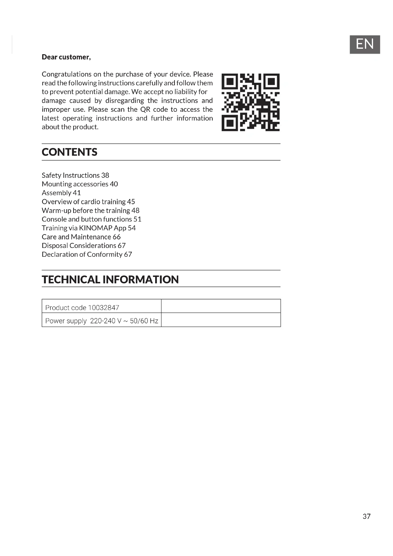 Dear customer, Congratulations on the purchase of your device. Please read the following instructions carefully and follow them to prevent potential damage. We accept no liability for damage caused by disregarding the instructions and improper use. Please scan the QR code to access the latest operating instructions and further information about the product. CONTENTS Safety Instructions 38 Mounting accessories 40 Assembly 41 Overview of cardio training 45 Warm-up before the training 48 Console and button functions 51 Training via KINOMAP App 54 Care and Maintenance 66 Disposal Considerations 67 Declaration of Conformity 67 TECHNICAL INFORMATION Product code 10032847 Power supply 220-240 V ~ 50/60 Hz38