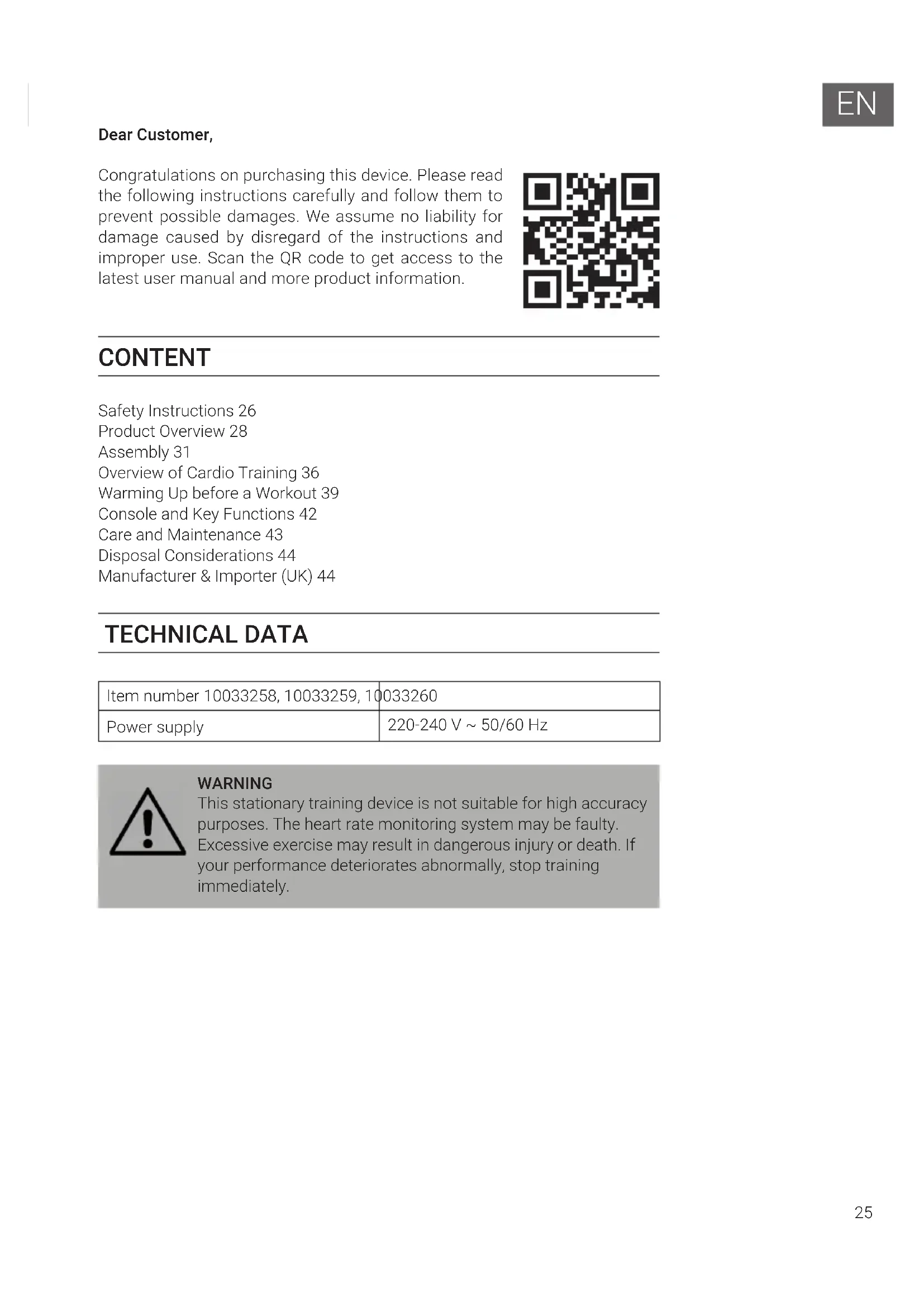 Dear Customer, Congratulations on purchasing this device. Please read the following instructions carefully and follow them to prevent possible damages. We assume no liability for damage caused by disregard of the instructions and improper use. Scan the QR code to get access to the latest user manual and more product information. CONTENT Safety Instructions 26 Product Overview 28 Assembly 31 Overview of Cardio Training 36 Warming Up before a Workout 39 Console and Key Functions 42 Care and Maintenance 43 Disposal Considerations 44 Manufacturer & Importer (UK) 44 TECHNICAL DATA Item number 10033258, 10033259, 10033260 Power supply 220-240 V ~ 50/60 Hz WARNING This stationary training device is not suitable for high accuracy purposes. The heart rate monitoring system may be faulty. Excessive exercise may result in dangerous injury or death. If your performance deteriorates abnormally, stop training immediately.26