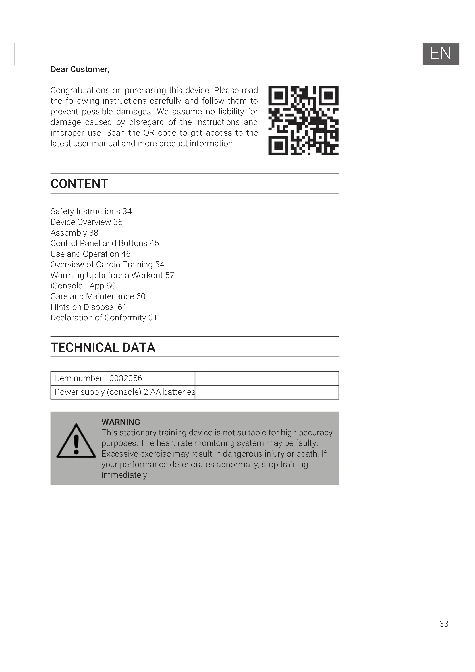 Dear Customer, Congratulations on purchasing this device. Please read the following instructions carefully and follow them to prevent possible damages. We assume no liability for damage caused by disregard of the instructions and improper use. Scan the QR code to get access to the latest user manual and more product information. CONTENT Safety Instructions 34 Device Overview 36 Assembly 38 Control Panel and Buttons 45 Use and Operation 46 Overview of Cardio Training 54 Warming Up before a Workout 57 iConsole+ App 60 Care and Maintenance 60 Hints on Disposal 61 Declaration of Conformity 61 TECHNICAL DATA Item number 10032356 Power supply (console) 2 AA batteries WARNING This stationary training device is not suitable for high accuracy purposes. The heart rate monitoring system may be faulty. Excessive exercise may result in dangerous injury or death. If your performance deteriorates abnormally, stop training immediately.34