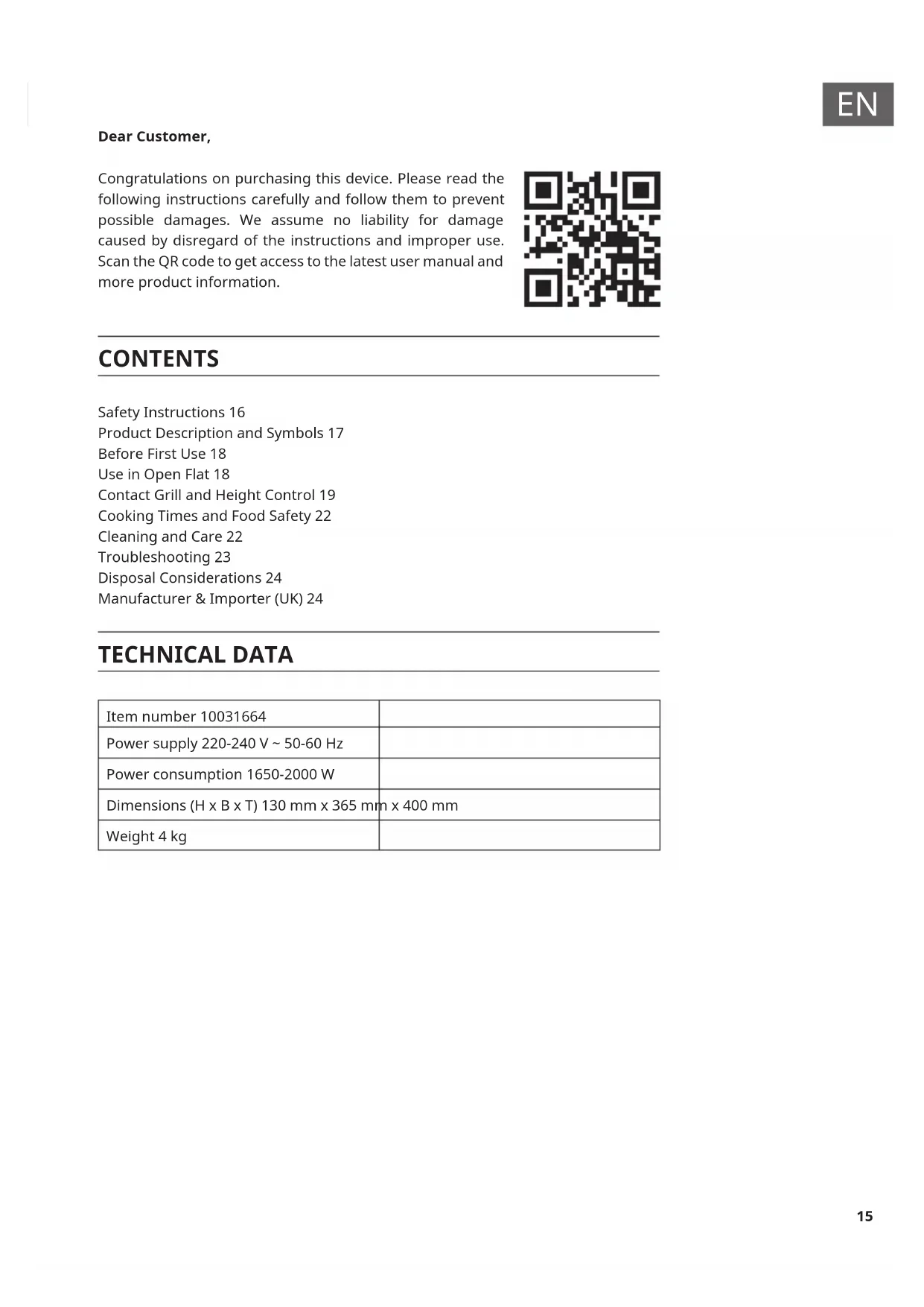 Dear Customer, Congratulations on purchasing this device. Please read the following instructions carefully and follow them to prevent possible damages. We assume no liability for damage caused by disregard of the instructions and improper use. Scan the QR code to get access to the latest user manual and more product information. CONTENTS Safety Instructions 16 Product Description and Symbols 17 Before First Use 18 Use in Open Flat 18 Contact Grill and Height Control 19 Cooking Times and Food Safety 22 Cleaning and Care 22 Troubleshooting 23 Disposal Considerations 24 Manufacturer & Importer (UK) 24 TECHNICAL DATA Item number 10031664 Power supply 220-240 V ~ 50-60 Hz Power consumption 1650-2000 W Dimensions (H x B x T) 130 mm x 365 mm x 400 mm Weight 4 kg16