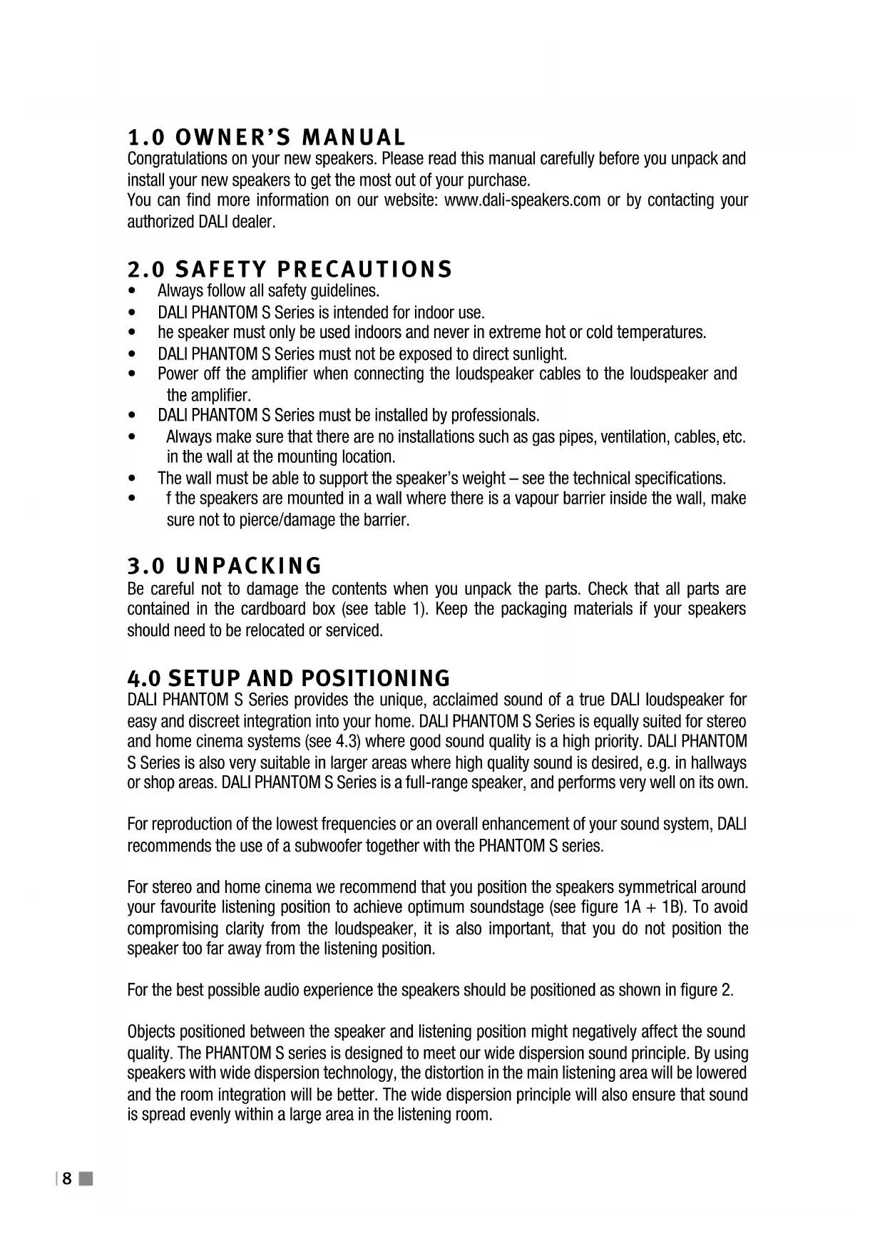 DALI PHANTOM S Series provides the unique, acclaimed sound of a true DALI loudspeaker for easy and discreet integration into your home. DALI PHANTOM S Series is equally suited for stereo and home cinema systems (see 4.3) where good sound quality is a high priority. DALI PHANTOM S Series is also very suitable in larger areas where high quality sound is desired, e.g. in hallways or shop areas. DALI PHANTOM S Series is a full-range speaker, and performs very well on its own. For reproduction of the lowest frequencies or an overall enhancement of your sound system, DALI recommends the use of a subwoofer together with the PHANTOM S series. For stereo and home cinema we recommend that you position the speakers symmetrical around your favourite listening position to achieve optimum soundstage (see figure 1A + 1B). To avoid compromising clarity from the loudspeaker, it is also important, that you do not position the speaker too far away from the listening position. For the best possible audio experience the speakers should be positioned as shown in figure 2. Objects positioned between the speaker and listening position might negatively affect the sound quality. The PHANTOM S series is designed to meet our wide dispersion sound principle. By using speakers with wide dispersion technology, the distortion in the main listening area will be lowered and the room integration will be better. The wide dispersion principle will also ensure that sound is spread evenly within a large area in the listening room.9 UK DE DK CN FR Every room has its own distinctive acoustics, which influence the way we experience sound from a speaker. The sound you hear consists of both direct sound from the speakers and reflected sound from the floor, and walls. The latter will affect how you experience the sound. As a basic rule, try to avoid large, hard and reflective areas in the immediate vicinity of your loudspeakers as it will typically cause strong reflections, which might disturb the precision and spatial effect of the sound reproduction. Soft items such as carpets, curtains etc. might help if the sound is too bright. Both the amount and quality of the deep bass depend on the size and shape of the room, and the position of the speakers. Positioning the speakers near a side or back wall will accentuate the bass. A corner location will accentuate it even more, but will also increase the reflections