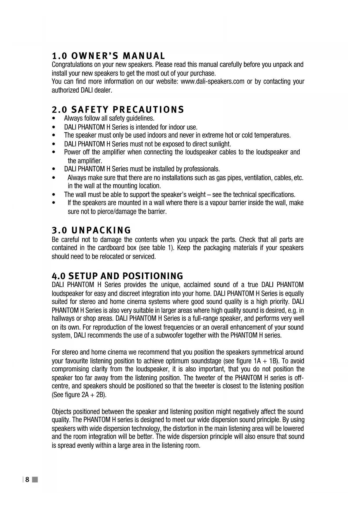 DALI PHANTOM H Series provides the unique, acclaimed sound of a true DALI PHANTOM loudspeaker for easy and discreet integration into your home. DALI PHANTOM H Series is equally suited for stereo and home cinema systems where good sound quality is a high priority. DALI PHANTOM H Series is also very suitable in larger areas where high quality sound is desired, e.g. in hallways or shop areas. DALI PHANTOM H Series is a full-range speaker, and performs very well on its own. For reproduction of the lowest frequencies or an overall enhancement of your sound system, DALI recommends the use of a subwoofer together with the PHANTOM H series. For stereo and home cinema we recommend that you position the speakers symmetrical around your favourite listening position to achieve optimum soundstage (see figure 1A + 1B). To avoid compromising clarity from the loudspeaker, it is also important, that you do not position the speaker too far away from the listening position. The tweeter of the PHANTOM H series is off- centre, and speakers should be positioned so that the tweeter is closest to the listening position (See figure 2A + 2B). Objects positioned between the speaker and listening position might negatively affect the sound quality. The PHANTOM H series is designed to meet our wide dispersion sound principle. By using speakers with wide dispersion technology, the distortion in the main listening area will be lowered and the room integration will be better. The wide dispersion principle will also ensure that sound is spread evenly within a large area in the listening room.9 UK DE DK CN FR Every room has its own distinctive acoustics, which influence the way we experience sound from a speaker. The sound you hear consists of both direct sound from the speakers and reflected sound from the floor, and walls. The latter will affect how you experience the sound. As a basic rule, try to avoid large, hard and reflective areas in the immediate vicinity of your loudspeakers as it will typically cause strong reflections, which might disturb the precision and spatial effect of the sound reproduction. Soft items such as carpets, curtains etc. might help if the sound is too bright. Both the amount and quality of the deep bass depend on the size and shape of the room, and the position of the speakers. Positioning the speakers near a side or back wall will accentuate the bass. A corner location will accentuate it even more, but will also increase the reflections. NOTE: The flow damping foam material mounted on the back of the DALI PHANTOM H Series should not be removed. It will assist in managing bass/midrange reproduction by damping resonances in the cavity behind the open-back woofer.