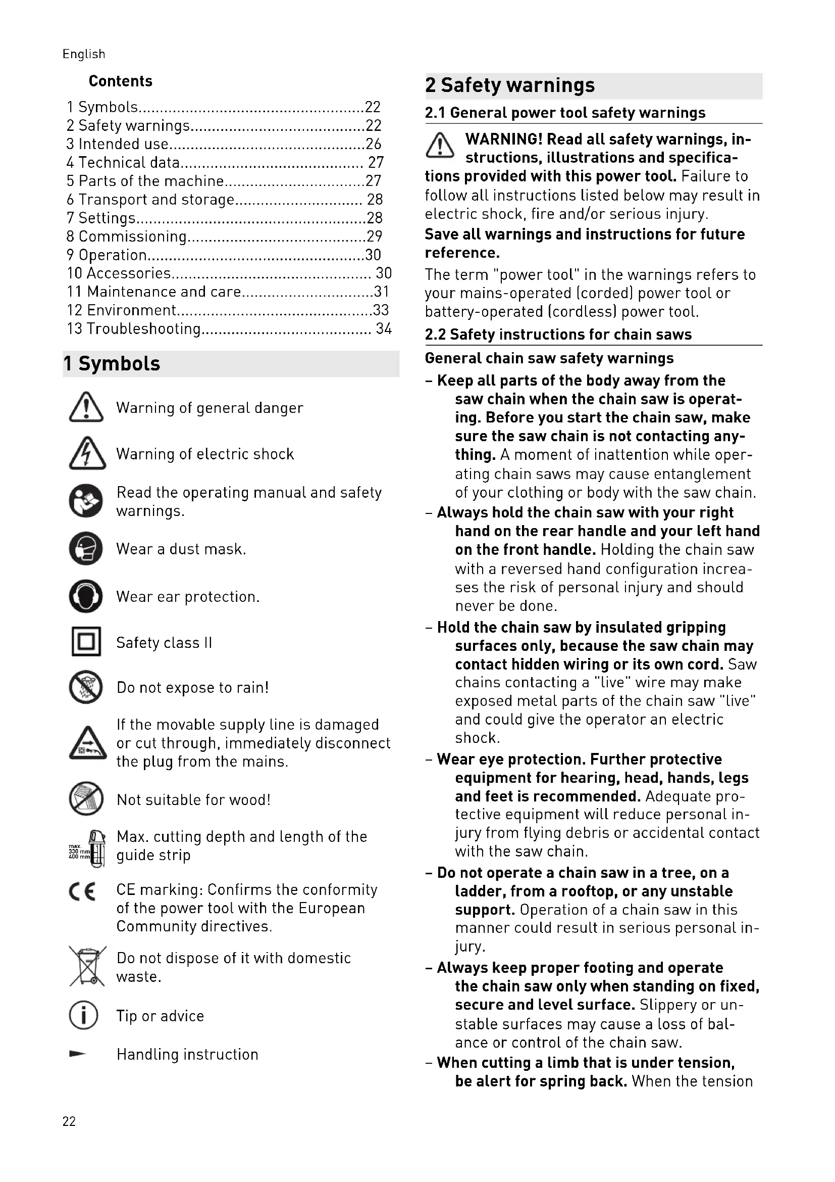 General chain saw safety warnings – Keep all parts of the body away from the saw chain when the chain saw is operat ing. Before you start the chain saw, make sure the saw chain is not contacting any thing. A moment of inattention while oper ating chain saws may cause entanglement of your clothing or body with the saw chain. – Always hold the chain saw with your right hand on the rear handle and your left hand on the front handle. Holding the chain saw with a reversed hand configuration increa ses the risk of personal injury and should never be done. – Hold the chain saw by insulated gripping surfaces only, because the saw chain may contact hidden wiring or its own cord. Saw chains contacting a "live" wire may make exposed metal parts of the chain saw "live" and could give the operator an electric shock. – Wear eye protection. Further protective equipment for hearing, head, hands, legs and feet is recommended. Adequate pro tective equipment will reduce personal in jury from flying debris or accidental contact with the saw chain. – Do not operate a chain saw in a tree, on a ladder, from a rooftop, or any unstable support. Operation of a chain saw in this manner could result in serious personal in jury. – Always keep proper footing and operate the chain saw only when standing on fixed, secure and level surface. Slippery or un stable surfaces may cause a loss of bal ance or control of the chain saw. – When cutting a limb that is under tension, be alert for spring back. When the tension English 22in the wood fibres is released, the spring loaded limb may strike the operator and/or throw the chain saw out of control. – Use extreme caution when cutting brush and saplings. The slender material may catch the saw chain and be whipped toward you or pull you off balance. – Carry the chain saw by the front handle with the chain saw switched off and away from your body. When transporting or storing the chain saw, always fit the guide bar cover. Proper handling of the chain saw will reduce the likelihood of accidental contact with the moving saw chain. – Follow instructions for lubricating, chain tensioning and changing the bar and chain. Improperly tensioned or lubricated chain may either break or increase the chance for kickback. – Cut wood only. Do not use chain saw for purposes not intended. For example: do not use chain saw for cutting metal, plas tic, masonry or non-wood building materi als. Use of the chain saw for operations dif ferent than intended could result in a haz ardous situation. – This chain saw is not intended for tree felling. Use of the chain saw for operations different than intended could result in seri ous injury to the operator or bystanders. Causes and operator prevention of kickback Kickback may occur when the nose or tip of the guide bar touches an object, or when the wood closes in and pinches the saw chain in the cut. Tip contact in some cases may cause a sudden reverse reaction, kicking the guide bar up and back towards the operator. Pinching the saw chain along the top of the guide bar may push the guide bar rapidly back towards the operator. Either of these reactions may cause you to lose control of the saw which could result in serious personal injury. Do not rely exclusively upon the safety devices built into your saw. As a chain saw user, you should take several steps to keep your cutting jobs free from accident or injury. Kickback is the result of chain saw misuse and/or incorrect operating procedures or con ditions and can be avoided by taking proper precautions as given below: – Maintain a firm grip, with thumbs and fin gers encircling the chain saw handles, with both hands on the saw and position your body and arm to allow you to resist kickback forces. Kickback forces can be controlled by the operator, if proper pre cautions are taken. Do not let go of the chain saw. – Do not overreach and do not cut above shoulder height. This helps prevent unin tended tip contact and enables better con trol of the chain saw in unexpected situa tions. – Only use replacement guide bars and saw chains specified by the manufacturer. In correct replacement guide bars and saw chains may cause chain breakage and/or kickback. – Follow the manufacturer’s sharpening and maintenance instructions for the saw chain. Decreasing the depth gauge height can lead to increased kickback.