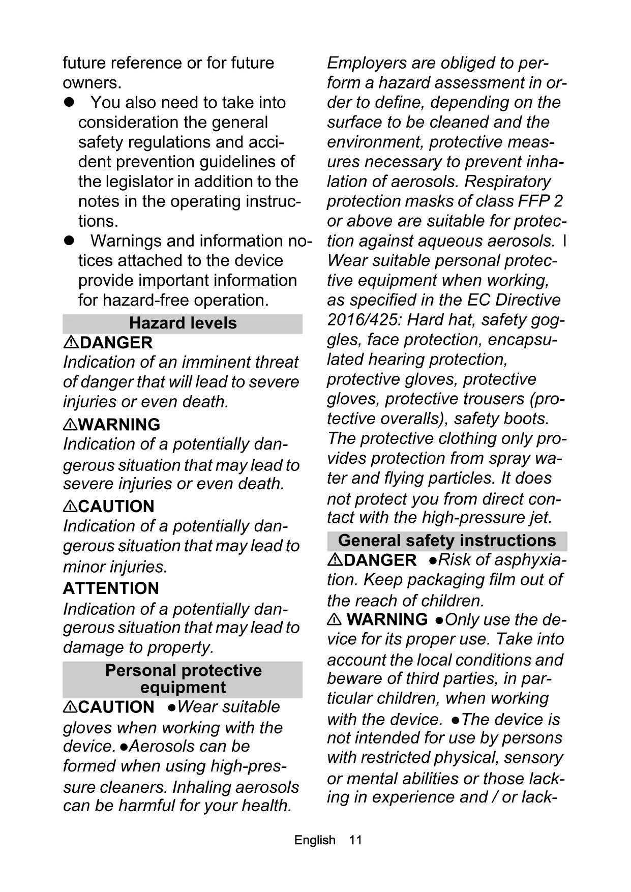 Beachten Sie beim Transport im öffentlichen Straßenverkehr die gesetzlichen Bestimmungen des jeweiligen Landes. Benut- zen Sie mit Sicherungen ausge- sattete Seile, Ketten, Zugeinrichtungen und Lastan- schlagmittel, die den geltenden Vorschriften entsprechen. Safety instructions Ultra- high-pressure cleaner Read these safety in- structions and the orig- inal operating instructions before using the device for the first time. Act in accordance with them. Keep the two booklets forEnglish 11 future reference or for future owners. You also need to take into consideration the general safety regulations and acci- dent prevention guidelines of the legislator in addition to the notes in the operating instruc- tions. Warnings and information no- tices attached to the device provide important information for hazard-free operation. Hazard levels DANGER Indication of an imminent threat of danger that will lead to severe injuries or even death. 몇 WARNING Indication of a potentially dan- gerous situation that may lead to severe injuries or even death. 몇 CAUTION Indication of a potentially dan- gerous situation that may lead to minor injuries. ATTENTION Indication of a potentially dan- gerous situation that may lead to damage to property. Personal protective equipment 몇 CAUTION Wear suitable gloves when working with the device. Aerosols can be formed when using high-pres- sure cleaners. Inhaling aerosols can be harmful for your health. Employers are obliged to per- form a hazard assessment in or- der to define, depending on the surface to be cleaned and the environment, protective meas- ures necessary to prevent inha- lation of aerosols. Respiratory protection masks of class FFP 2 or above are suitable for protec- tion against aqueous aerosols. l Wear suitable personal protec- tive equipment when working, as specified in the EC Directive 2016/425: Hard hat, safety gog- gles, face protection, encapsu- lated hearing protection, protective gloves, protective gloves, protective trousers (pro- tective overalls), safety boots. The protective clothing only pro- vides protection from spray wa- ter and flying particles. It does not protect you from direct con- tact with the high-pressure jet. General safety instructions DANGER Risk of asphyxia- tion. Keep packaging film out of the reach of children. 몇 WARNING Only use the de- vice for its proper use. Take into account the local conditions and beware of third parties, in par- ticular children, when working with the device. The device is not intended for use by persons with restricted physical, sensory or mental abilities or those lack- ing in experience and / or lack-12 English ing in knowledge. Only people who have been instructed on how to use the device, or have proven their ability to operate it, and have been explicitly in- structed to use it, must use the device. Children must be su- pervised to prevent them from playing with the appliance.