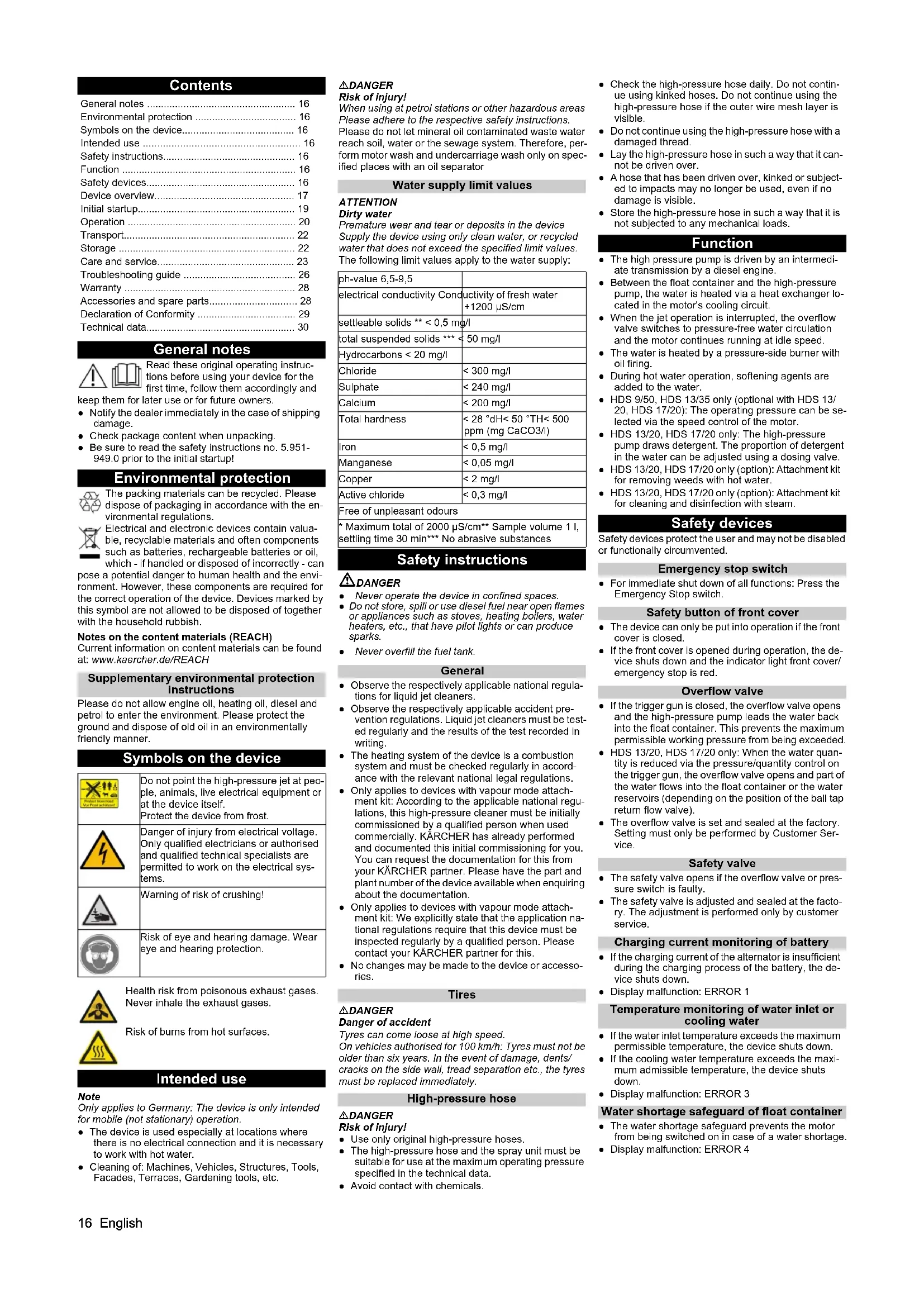 - Environmental protection The packing materials can be recycled. Please dispose of packaging in accordance with the en- vironmental regulations. Electrical and electronic devices contain valua- ble, recyclable materials and often components such as batteries, rechargeable batteries or oil, which - if handled or disposed of incorrectly - can pose a potential danger to human health and the envi- ronment. However, these components are required for the correct operation of the device. Devices marked by this symbol are not allowed to be disposed of together with the household rubbish. Notes on the content materials (REACH) Current information on content materials can be found at: www.kaercher.de/REACH Supplementary environmental protection instructions Please do not allow engine oil, heating oil, diesel and petrol to enter the environment. Please protect the ground and dispose of old oil in an environmentally friendly manner. Symbols on the device Intended use Note Only applies to Germany: The device is only intended for mobile (not stationary) operation. ● The device is used especially at locations where there is no electrical connection and it is necessary to work with hot water. ● Cleaning of: Machines, Vehicles, Structures, Tools, Facades, Terraces, Gardening tools, etc. DANGER Risk of injury! When using at petrol stations or other hazardous areas Please adhere to the respective safety instructions. Please do not let mineral oil contaminated waste water reach soil, water or the sewage system. Therefore, per- form motor wash and undercarriage wash only on spec- ified places with an oil separator Water supply limit values ATTENTION Dirty water Premature wear and tear or deposits in the device Supply the device using only clean water, or recycled water that does not exceed the specified limit values. The following limit values apply to the water supply: Safety instructions DANGER ● Never operate the device in confined spaces. ● Do not store, spill or use diesel fuel near open flames or appliances such as stoves, heating boilers, water heaters, etc., that have pilot lights or can produce sparks. ● Never overfill the fuel tank. General ● Observe the respectively applicable national regula- tions for liquid jet cleaners. ● Observe the respectively applicable accident pre- vention regulations. Liquid jet cleaners must be test- ed regularly and the results of the test recorded in writing. ● The heating system of the device is a combustion system and must be checked regularly in accord- ance with the relevant national legal regulations. ● Only applies to devices with vapour mode attach- ment kit: According to the applicable national regu- lations, this high-pressure cleaner must be initially commissioned by a qualified person when used commercially. KÄRCHER has already performed and documented this initial commissioning for you. You can request the documentation for this from your KÄRCHER partner. Please have the part and plant number of the device available when enquiring about the documentation. ● Only applies to devices with vapour mode attach- ment kit: We explicitly state that the application na- tional regulations require that this device must be inspected regularly by a qualified person. Please contact your KÄRCHER partner for this. ● No changes may be made to the device or accesso- ries. Tires DANGER Danger of accident Tyres can come loose at high speed. On vehicles authorised for 100 km/h: Tyres must not be older than six years. In the event of damage, dents/ cracks on the side wall, tread separation etc., the tyres must be replaced immediately. High-pressure hose DANGER Risk of injury! ● Use only original high-pressure hoses. ● The high-pressure hose and the spray unit must be suitable for use at the maximum operating pressure specified in the technical data. ● Avoid contact with chemicals. ● Check the high-pressure hose daily. Do not contin- ue using kinked hoses. Do not continue using the high-pressure hose if the outer wire mesh layer is visible. ● Do not continue using the high-pressure hose with a damaged thread. ● Lay the high-pressure hose in such a way that it can- not be driven over. ● A hose that has been driven over, kinked or subject- ed to impacts may no longer be used, even if no damage is visible. ● Store the high-pressure hose in such a way that it is not subjected to any mechanical loads. Function ● The high pressure pump is driven by an intermedi- ate transmission by a diesel engine. ● Between the float container and the high-pressure pump, the water is heated via a heat exchanger lo- cated in the motor's cooling circuit. ● When the jet operation is interrupted, the overflow valve switches to pressure-free water circulation and the motor continues running at idle speed. ● The water is heated by a pressure-side burner with oil firing. ● During hot water operation, softening agents are added to the water. ● HDS 9/50, HDS 13/35 only (optional with HDS 13/ 20, HDS 17/20): The operating pressure can be se- lected via the speed control of the motor. ● HDS 13/20, HDS 17/20 only: The high-pressure pump draws detergent. The proportion of detergent in the water can be adjusted using a dosing valve. ● HDS 13/20, HDS 17/20 only (option): Attachment kit for removing weeds with hot water. ● HDS 13/20, HDS 17/20 only (option): Attachment kit for cleaning and disinfection with steam. Safety devices Safety devices protect the user and may not be disabled or functionally circumvented. Emergency stop switch ● For immediate shut down of all functions: Press the Emergency Stop switch. Safety button of front cover ● The device can only be put into operation if the front cover is closed. ● If the front cover is opened during operation, the de- vice shuts down and the indicator light front cover/ emergency stop is red. Overflow valve ● If the trigger gun is closed, the overflow valve opens and the high-pressure pump leads the 