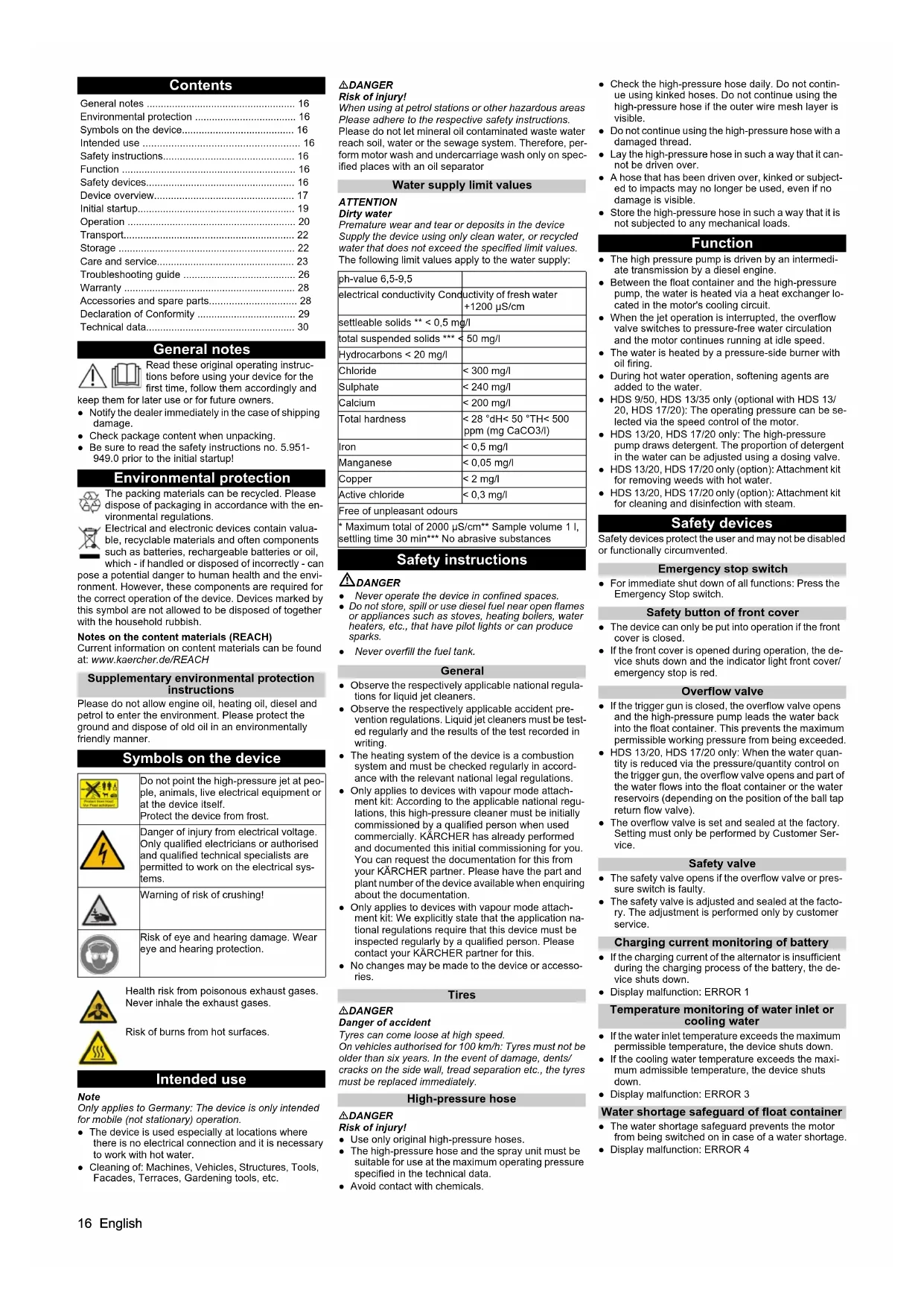 - Environmental protection The packing materials can be recycled. Please dispose of packaging in accordance with the en- vironmental regulations. Electrical and electronic devices contain valua- ble, recyclable materials and often components such as batteries, rechargeable batteries or oil, which - if handled or disposed of incorrectly - can pose a potential danger to human health and the envi- ronment. However, these components are required for the correct operation of the device. Devices marked by this symbol are not allowed to be disposed of together with the household rubbish. Notes on the content materials (REACH) Current information on content materials can be found at: www.kaercher.de/REACH Supplementary environmental protection instructions Please do not allow engine oil, heating oil, diesel and petrol to enter the environment. Please protect the ground and dispose of old oil in an environmentally friendly manner. Symbols on the device Intended use Note Only applies to Germany: The device is only intended for mobile (not stationary) operation. ● The device is used especially at locations where there is no electrical connection and it is necessary to work with hot water. ● Cleaning of: Machines, Vehicles, Structures, Tools, Facades, Terraces, Gardening tools, etc. DANGER Risk of injury! When using at petrol stations or other hazardous areas Please adhere to the respective safety instructions. Please do not let mineral oil contaminated waste water reach soil, water or the sewage system. Therefore, per- form motor wash and undercarriage wash only on spec- ified places with an oil separator Water supply limit values ATTENTION Dirty water Premature wear and tear or deposits in the device Supply the device using only clean water, or recycled water that does not exceed the specified limit values. The following limit values apply to the water supply: Safety instructions DANGER ● Never operate the device in confined spaces. ● Do not store, spill or use diesel fuel near open flames or appliances such as stoves, heating boilers, water heaters, etc., that have pilot lights or can produce sparks. ● Never overfill the fuel tank. General ● Observe the respectively applicable national regula- tions for liquid jet cleaners. ● Observe the respectively applicable accident pre- vention regulations. Liquid jet cleaners must be test- ed regularly and the results of the test recorded in writing. ● The heating system of the device is a combustion system and must be checked regularly in accord- ance with the relevant national legal regulations. ● Only applies to devices with vapour mode attach- ment kit: According to the applicable national regu- lations, this high-pressure cleaner must be initially commissioned by a qualified person when used commercially. KÄRCHER has already performed and documented this initial commissioning for you. You can request the documentation for this from your KÄRCHER partner. Please have the part and plant number of the device available when enquiring about the documentation. ● Only applies to devices with vapour mode attach- ment kit: We explicitly state that the application na- tional regulations require that this device must be inspected regularly by a qualified person. Please contact your KÄRCHER partner for this. ● No changes may be made to the device or accesso- ries. Tires DANGER Danger of accident Tyres can come loose at high speed. On vehicles authorised for 100 km/h: Tyres must not be older than six years. In the event of damage, dents/ cracks on the side wall, tread separation etc., the tyres must be replaced immediately. High-pressure hose DANGER Risk of injury! ● Use only original high-pressure hoses. ● The high-pressure hose and the spray unit must be suitable for use at the maximum operating pressure specified in the technical data. ● Avoid contact with chemicals. ● Check the high-pressure hose daily. Do not contin- ue using kinked hoses. Do not continue using the high-pressure hose if the outer wire mesh layer is visible. ● Do not continue using the high-pressure hose with a damaged thread. ● Lay the high-pressure hose in such a way that it can- not be driven over. ● A hose that has been driven over, kinked or subject- ed to impacts may no longer be used, even if no damage is visible. ● Store the high-pressure hose in such a way that it is not subjected to any mechanical loads. Function ● The high pressure pump is driven by an intermedi- ate transmission by a diesel engine. ● Between the float container and the high-pressure pump, the water is heated via a heat exchanger lo- cated in the motor's cooling circuit. ● When the jet operation is interrupted, the overflow valve switches to pressure-free water circulation and the motor continues running at idle speed. ● The water is heated by a pressure-side burner with oil firing. ● During hot water operation, softening agents are added to the water. ● HDS 9/50, HDS 13/35 only (optional with HDS 13/ 20, HDS 17/20): The operating pressure can be se- lected via the speed control of the motor. ● HDS 13/20, HDS 17/20 only: The high-pressure pump draws detergent. The proportion of detergent in the water can be adjusted using a dosing valve. ● HDS 13/20, HDS 17/20 only (option): Attachment kit for removing weeds with hot water. ● HDS 13/20, HDS 17/20 only (option): Attachment kit for cleaning and disinfection with steam. Safety devices Safety devices protect the user and may not be disabled or functionally circumvented. Emergency stop switch ● For immediate shut down of all functions: Press the Emergency Stop switch. Safety button of front cover ● The device can only be put into operation if the front cover is closed. ● If the front cover is opened during operation, the de- vice shuts down and the indicator light front cover/ emergency stop is red. Overflow valve ● If the trigger gun is closed, the overflow valve opens and the high-pressure pump leads the 
