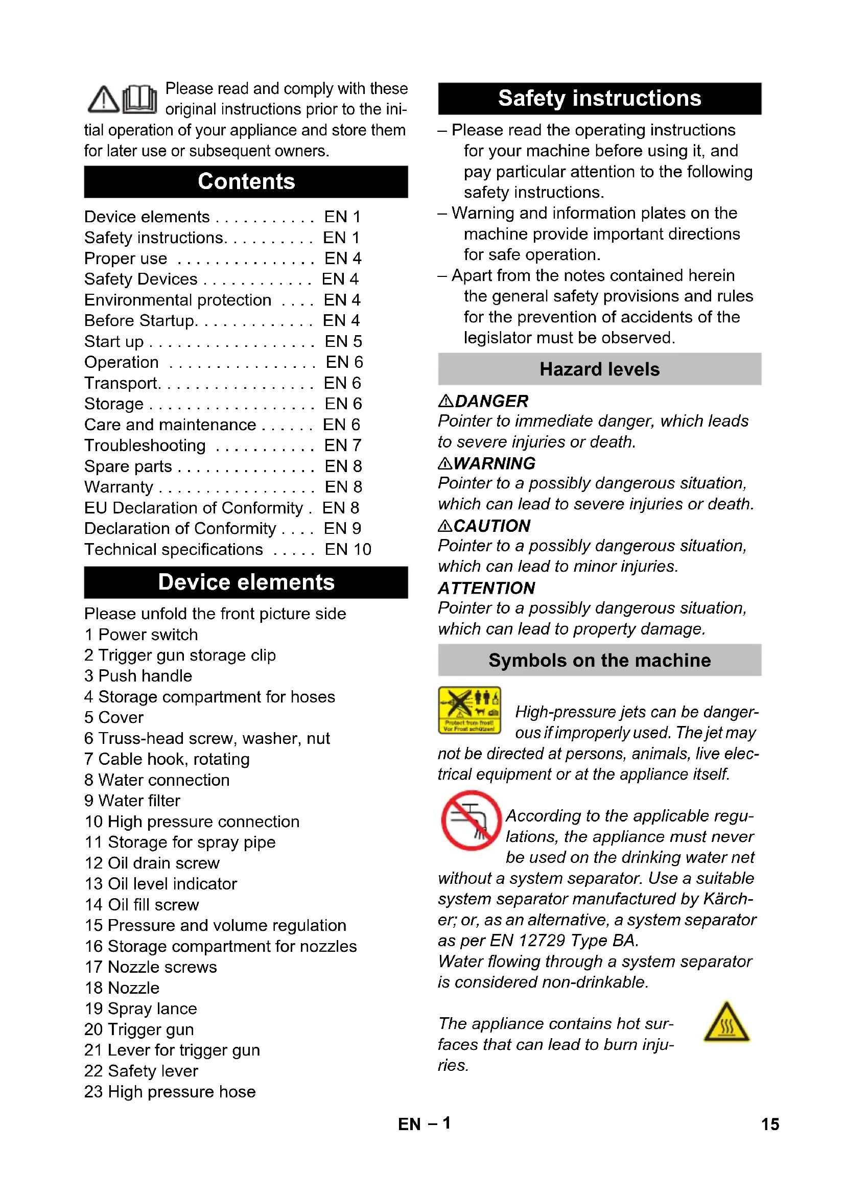 55,4 60,9 Ausnahmegrund nach Verordnung (EU) 2019/1781 Anhang I Abschnitt 2 (12): j) 14 DE– 1 Please read and comply with these original instructions prior to the ini- tial operation of your appliance and store them for later use or subsequent owners. Please unfold the front picture side 1 Power switch 2 Trigger gun storage clip 3 Push handle 4 Storage compartment for hoses 5 Cover 6 Truss-head screw, washer, nut 7 Cable hook, rotating 8 Water connection 9 Water filter 10 High pressure connection 11 Storage for spray pipe 12 Oil drain screw 13 Oil level indicator 14 Oil fill screw 15 Pressure and volume regulation 16 Storage compartment for nozzles 17 Nozzle screws 18 Nozzle 19 Spray lance 20 Trigger gun 21 Lever for trigger gun 22 Safety lever 23 High pressure hose – Please read the operating instructions for your machine before using it, and pay particular attention to the following safety instructions. – Warning and information plates on the machine provide important directions for safe operation. – Apart from the notes contained herein the general safety provisions and rules for the prevention of accidents of the legislator must be observed. DANGER Pointer to immediate danger, which leads to severe injuries or death. 몇 WARNING Pointer to a possibly dangerous situation, which can lead to severe injuries or death. 몇 CAUTION Pointer to a possibly dangerous situation, which can lead to minor injuries. ATTENTION Pointer to a possibly dangerous situation, which can lead to property damage. High-pressure jets can be danger- ous if improperly used. The jet may not be directed at persons, animals, live elec- trical equipment or at the appliance itself. According to the applicable regu- lations, the appliance must never be used on the drinking water net without a system separator. Use a suitable system separator manufactured by Kärch- er; or, as an alternative, a system separator as per EN 12729 Type BA. Water flowing through a system separator is considered non-drinkable. The appliance contains hot sur- faces that can lead to burn inju- ries. Contents Device elements ... EN 1 Safety instructions... EN 1 Proper use ... EN 4 Safety Devices ... EN 4 Environmental protection ... EN 4 Before Startup... EN 4 Start up ... EN 5 Operation ... EN 6 Transport... EN 6 Storage ... EN 6 Care and maintenance ... EN 6 Troubleshooting ... EN 7 Spare parts ... EN 8 Warranty ... EN 8 EU Declaration of Conformity . EN 8 Declaration of Conformity ... EN 9 Technical specifications ... EN 10 Device elements Safety instructions Hazard levels Symbols on the machine 15EN– 2 Risk of electric shock. The casing must only be opened by electri- cians. – The voltage indicated on the type plate must correspond to the voltage of the electrical source. – Minimum fuse strength of the socket (see Technical Data). – Safety class I - Appliances may only be connected to sockets with proper earth- ing. – It is recommended that you connect this device to a socket that has a 30 mA pro- tection switch against wrong currents. – Please use the mains cable prescribed by the manufacturer; the same is also applicable when you replace the ca- bles. See Operating Instructions Manu- al for Order Number and Type. – Check the power cord with mains plug for damage before every use. If the power cord is damaged, please arrange immediately for the exchange by an au- thorized customer service or a skilled electrician. – The appliance may only be connected to an electrical supply which has been installed by an electrician in accordance with IEC 60364. – Operating procedures create short term power sinkings. – During unfavorable net conditions other devices might be disturbed. – Never touch the mains plug with wet hands. – Make sure that the power cord or exten- sion cables are not damaged by run- ning over, pinching, dragging or similar. Protect the cable from heat, oil, and sharp edges. – The extension cable must have the cross-section listed in the circuit plan and be protected against spraying wa- ter. The connection must not lie in wa- ter. – The mains plug and the coupling of an extension cable must be watertight and must never lie in water. Moreover, the coupling may never lie on the ground. The use of cable reels that ensure that the sockets are at least 60 mm above the ground is recommended. – Unsuitable electrical extension cables can be hazardous. Only use electrical extension cables outdoors which have been approved and labelled for this pur- pose and have an adequate cable cross-section. – The power cord must be checked regu- larly for damages, such as cracks or ag- ing. If damage is found, the cable must be replaced before further use. – If couplings of the power cord or exten- sion cable are replace the splash pro- tection and the mechanical tightness must be ensured. – Do not clean the appliance with a water hose or high-pressure water jet (danger of short circuits or other damage). – Do not operate the appliance at temper- atures below 0 °C. – Please observe the safety instructions of your water supply authority. – Please ensure that screw connections of all hoses are not leaky. – The high pressure hose must not be damaged. A damaged high pressure hose must be replaced immediately. Only hoses and joints recommended by the manufacturer may be used. See Operating Instructions Manual for Order Number. – The appliance and its working equip- ment must be checked to ensure that it is in proper working order and is operat- ing safely prior to use. The appliance must not be used if a connecting line or important parts of the appliance, e.g. safety devices, high- Power connection Water connection Application 16 EN– 3 pressure hoses, spray guns, are dam- aged. – Never draw in fluids containing solvents or undiluted acids and solvents! This in- cludes petrol, paint thinner and heating oil. The spray mist thus generated is highly inflammable, explosive and poi- sonous. Do not use ace