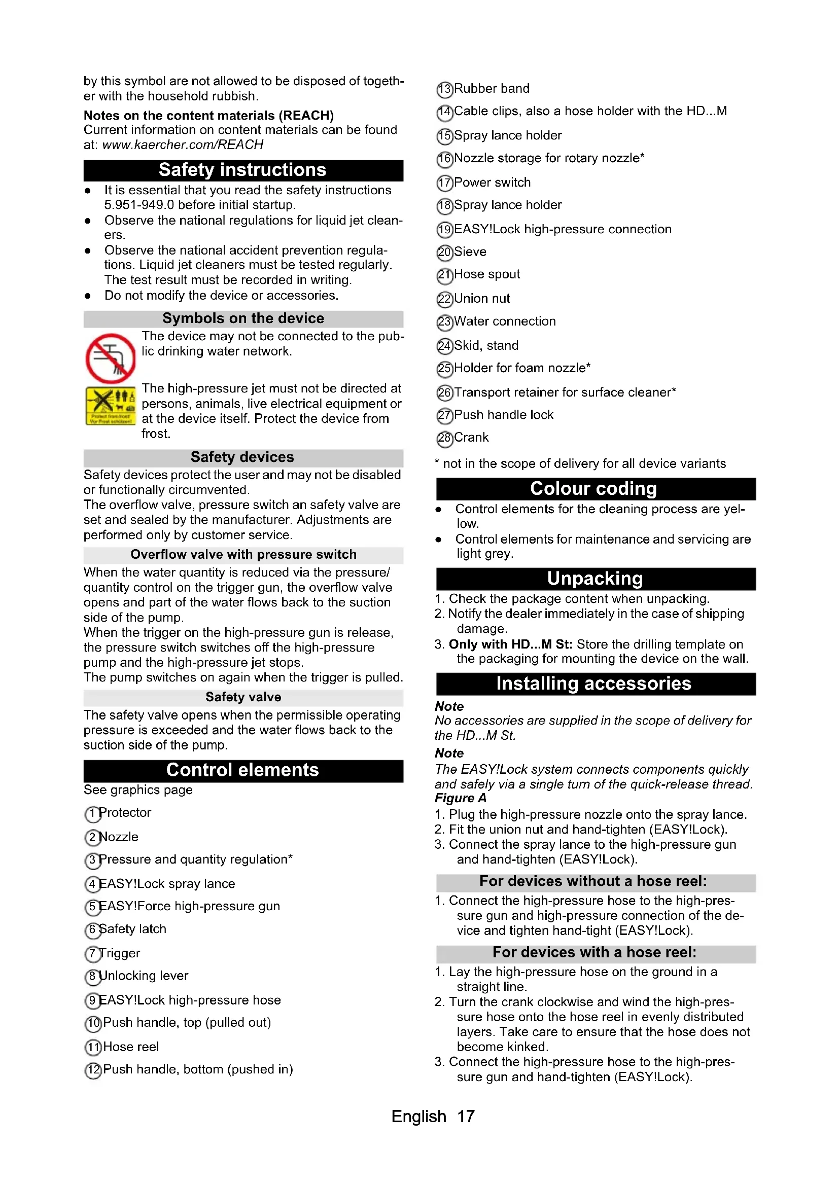 - Declaration of Conformity English 17 by this symbol are not allowed to be disposed of togeth- er with the household rubbish. Notes on the content materials (REACH) Current information on content materials can be found at: www.kaercher.com/REACH Safety instructions ● It is essential that you read the safety instructions 5.951-949.0 before initial startup. ● Observe the national regulations for liquid jet clean- ers. ● Observe the national accident prevention regula- tions. Liquid jet cleaners must be tested regularly. The test result must be recorded in writing. ● Do not modify the device or accessories. Symbols on the device The device may not be connected to the pub- lic drinking water network. The high-pressure jet must not be directed at persons, animals, live electrical equipment or at the device itself. Protect the device from frost. Safety devices Safety devices protect the user and may not be disabled or functionally circumvented. The overflow valve, pressure switch an safety valve are set and sealed by the manufacturer. Adjustments are performed only by customer service. Overflow valve with pressure switch When the water quantity is reduced via the pressure/ quantity control on the trigger gun, the overflow valve opens and part of the water flows back to the suction side of the pump. When the trigger on the high-pressure gun is release, the pressure switch switches off the high-pressure pump and the high-pressure jet stops. The pump switches on again when the trigger is pulled. Safety valve The safety valve opens when the permissible operating pressure is exceeded and the water flows back to the suction side of the pump. Control elements See graphics page 1 Protector 2 Nozzle 3 Pressure and quantity regulation* 4 EASY!Lock spray lance 5 EASY!Force high-pressure gun 6 Safety latch 7 Trigger 8 Unlocking lever 9 EASY!Lock high-pressure hose 10 Push handle, top (pulled out) 11 Hose reel 12 Push handle, bottom (pushed in) 13 Rubber band 14 Cable clips, also a hose holder with the HD M 15 Spray lance holder 16 Nozzle storage for rotary nozzle* 17 Power switch 18 Spray lance holder 19 EASY!Lock high-pressure connection 20 Sieve 21 Hose spout 22 Union nut 23 Water connection 24 Skid, stand 25 Holder for foam nozzle* 26 Transport retainer for surface cleaner* 27 Push handle lock 28 Crank p. 25