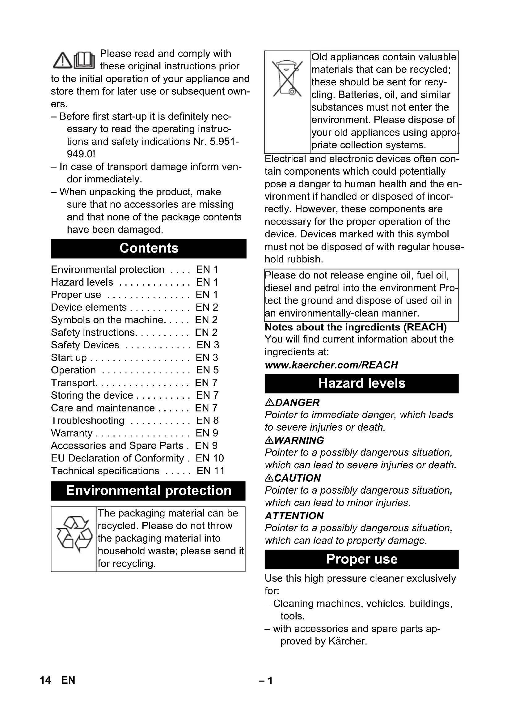 dB(A) 93 97 96 13DE– 1 Please read and comply with these original instructions prior to the initial operation of your appliance and store them for later use or subsequent own- ers. – Before first start-up it is definitely nec- essary to read the operating instruc- tions and safety indications Nr. 5.951- 949.0! – In case of transport damage inform ven- dor immediately. – When unpacking the product, make sure that no accessories are missing and that none of the package contents have been damaged. Electrical and electronic devices often con- tain components which could potentially pose a danger to human health and the en- vironment if handled or disposed of incor- rectly. However, these components are necessary for the proper operation of the device. Devices marked with this symbol must not be disposed of with regular house- hold rubbish. Notes about the ingredients (REACH) You will find current information about the ingredients at: www.kaercher.com/REACH DANGER Pointer to immediate danger, which leads to severe injuries or death. 몇 WARNING Pointer to a possibly dangerous situation, which can lead to severe injuries or death. 몇 CAUTION Pointer to a possibly dangerous situation, which can lead to minor injuries. ATTENTION Pointer to a possibly dangerous situation, which can lead to property damage. Use this high pressure cleaner exclusively for: – Cleaning machines, vehicles, buildings, tools. – with accessories and spare parts ap- proved by Kärcher. Contents Environmental protection ... EN 1 Hazard levels ... EN 1 Proper use ... EN 1 Device elements ... EN 2 Symbols on the machine... EN 2 Safety instructions... EN 2 Safety Devices ... EN 3 Start up ... EN 3 Operation ... EN 5 Transport... EN 7 Storing the device ... EN 7 Care and maintenance ... EN 7 Troubleshooting ... EN 8 Warranty ... EN 9 Accessories and Spare Parts . EN 9 EU Declaration of Conformity . EN 10 Technical specifications ... EN 11 Environmental protection The packaging material can be recycled. Please do not throw the packaging material into household waste; please send it for recycling. Old appliances contain valuable materials that can be recycled; these should be sent for recy- cling. Batteries, oil, and similar substances must not enter the environment. Please dispose of your old appliances using appro- priate collection systems. Please do not release engine oil, fuel oil, diesel and petrol into the environment Pro- tect the ground and dispose of used oil in an environmentally-clean manner. Hazard levels Proper use 14 EN– 2 Illustrations on Page 2 1 Trigger gun EASY!Force 2 Safety catch 3 Trigger 4 Safety lever 5 Rotary coupling (not with HD 16/15-4 Cage) 6 High pressure hose EASY!Lock 7 Hourmeter (option) 8 Storage for spray pipe 9 Push handle 10 Hose/cable holder 11 Power switch 12 Stopper 13 Indicator lamp operation status / mal- function 14 Power cable with plug 15 Oil filler neck (oil container with HD 25/ 15-4) 16 Water connection with filter 17 Pressure/ quantity regulation 18 Accessory compartment 19 Oil drain screw 20 Oil level indicator 21 High-pressure connection EASY!Lock 22 Manometer 23 Strut for crane loading 24 Power nozzle with covering nut 25 Spray lance EASY!Lock 26 Power press regulator – The operating elements for the cleaning process are yellow. – The controls for the maintenance and service are light gray. 몇 WARNING Observe regulations of water supplier. According to applicable regula- tions, the appliance must never be used on the drinking water net without a system separator. A suit- able system separator by KÄRCHER or al- ternatively a system separator according to EN 12729 type BA must be used. Water that was flowing through a system separator is considered non-drinkable. 몇 CAUTION Always connect the system separator to the water supply, never directly to the appli- ance! DANGER Risk of injury! – Only use original high-pressure hoses. – The high-pressure hose and the injec- tion system must be suitable for the maximum operating pressure given in the Technical Data. – Avoid contact with chemicals. – Check the high pressure hose daily. Do not use hoses with kinks. Stop using the high pressure hose if the external wire layer is visible. – Do not use the high-pressure hose any- more if the winding is damaged. – Lay the high-pressure hoses in such a way that no vehicle can drive over it. Device elements Colour coding Symbols on the machine High-pressure jets can be dangerous if improp- erly used. The jet may not be directed at per- sons, animals, live elec- trical equipment or at the appliance itself. Danger of damage to the machine on account of frozen water! Store the appliance in a heated- room during winter or empty it. Safety instructions 15EN– 3 – Do not use high-pressure hoses that have been driven over, kinked, pressed or bent even if there is no externally vis- ible damage. – Store the high-pressure hoses in such a way that they are not subject to any me- chanical load. – The appliance/accessories must not be modified. Safety devices serve to protect the user and must not be rendered in operational or their functions bypassed. The switch prevents unintented starting of the appliance. Stop the appliance during breaks or after operation. The safety catch on the trigger gun pre- vents the appliance from being switched on unintentionally. – While reducing the water supply/quanti- ty regulation at the pump head, the overflow valve opens and part of the water flows back to the pump suck side. – If the hand spray gun is closed, the overflow valve opens and the entire wa- ter volume will flow back to the pump suction side. The pressure switch on the overflow valve sends a signal to the control, which switches the pump off af- ter approx. 30 seconds of trailing time (does not apply to HD 16/15-4). – If the hand spray gun is opened, the pressure switch on the cylinder head turns the pump back on. The overflow valve and pressure switch are set and 