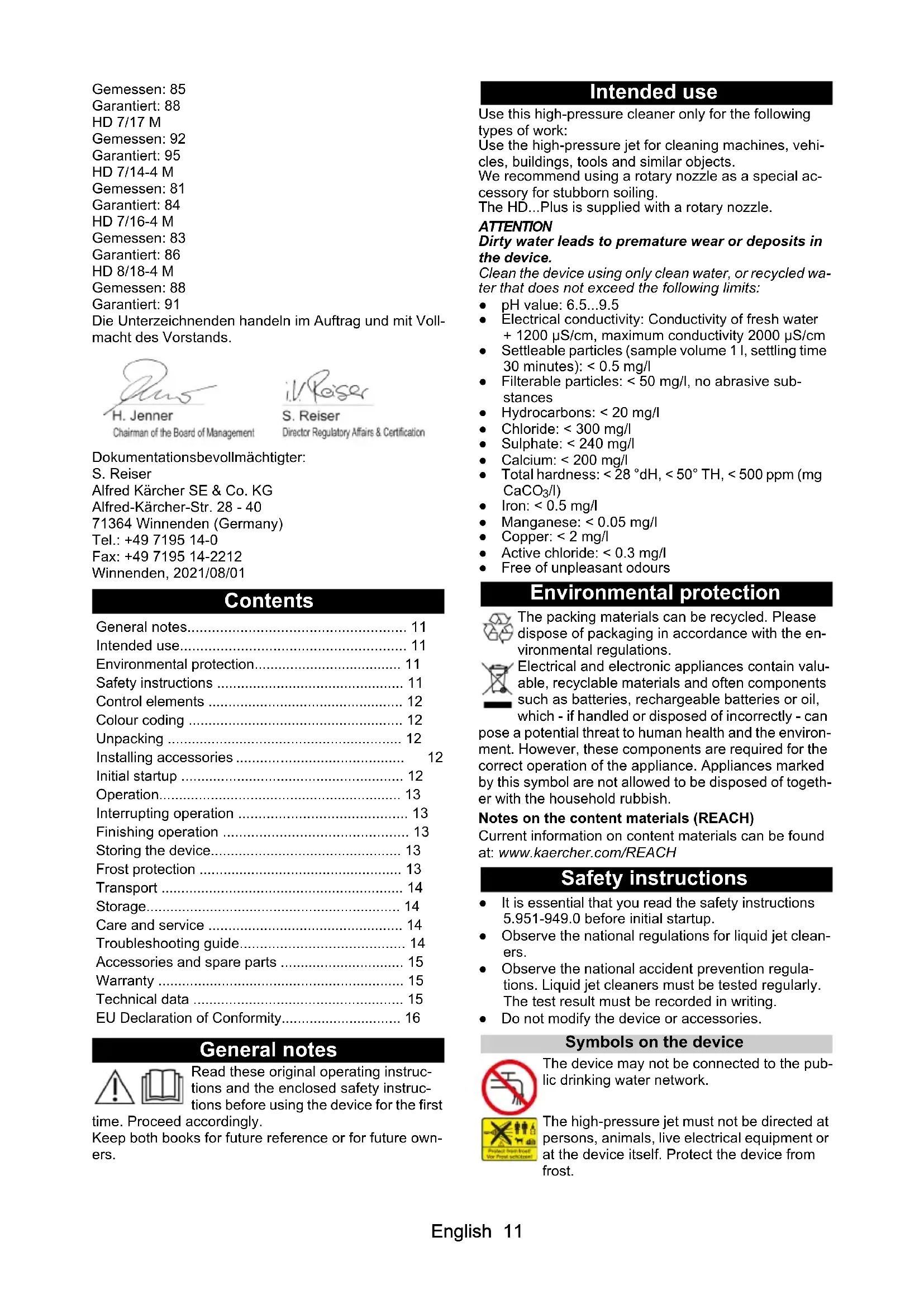- /l) ● Iron: < 0.5 mg/l ● Manganese: < 0.05 mg/l ● Copper: < 2 mg/l ● Active chloride: < 0.3 mg/l ● Free of unpleasant odours Environmental protection The packing materials can be recycled. Please dispose of packaging in accordance with the en- vironmental regulations. Electrical and electronic appliances contain valu- able, recyclable materials and often components such as batteries, rechargeable batteries or oil, which - if handled or disposed of incorrectly - can pose a potential threat to human health and the environ- ment. However, these components are required for the correct operation of the appliance. Appliances marked by this symbol are not allowed to be disposed of togeth- er with the household rubbish. Notes on the content materials (REACH) Current information on content materials can be found at: www.kaercher.com/REACH Safety instructions ● It is essential that you read the safety instructions 5.951-949.0 before initial startup. ● Observe the national regulations for liquid jet clean- ers. ● Observe the national accident prevention regula- tions. Liquid jet cleaners must be tested regularly. The test result must be recorded in writing. ● Do not modify the device or accessories. Symbols on the device The device may not be connected to the pub- lic drinking water network. The high-pressure jet must not be directed at persons, animals, live electrical equipment or at the device itself. Protect the device from frost. General notes p. 11