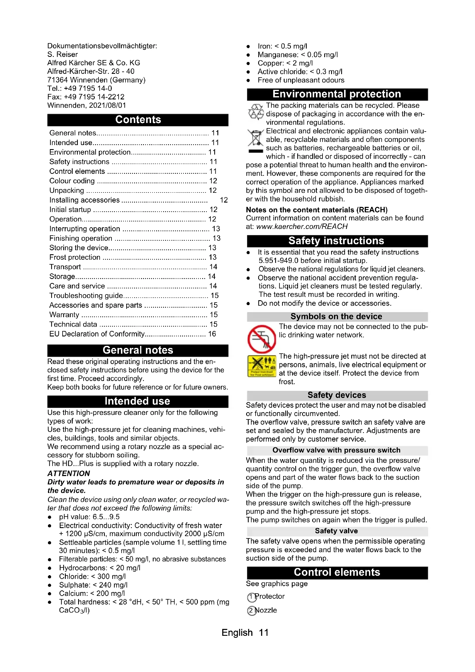 - Observe the national regulations for liquid jet cleaners. ● Observe the national accident prevention regula- tions. Liquid jet cleaners must be tested regularly. The test result must be recorded in writing. ● Do not modify the device or accessories. Symbols on the device The device may not be connected to the pub- lic drinking water network. The high-pressure jet must not be directed at persons, animals, live electrical equipment or at the device itself. Protect the device from frost. Safety devices Safety devices protect the user and may not be disabled or functionally circumvented. The overflow valve, pressure switch an safety valve are set and sealed by the manufacturer. Adjustments are performed only by customer service. Overflow valve with pressure switch When the water quantity is reduced via the pressure/ quantity control on the trigger gun, the overflow valve opens and part of the water flows back to the suction side of the pump. When the trigger on the high-pressure gun is release, the pressure switch switches off the high-pressure pump and the high-pressure jet stops. The pump switches on again when the trigger is pulled. Safety valve The safety valve opens when the permissible operating pressure is exceeded and the water flows back to the suction side of the pump. Control elements See graphics page 1 Protector 2 Nozzle General notes p. 11