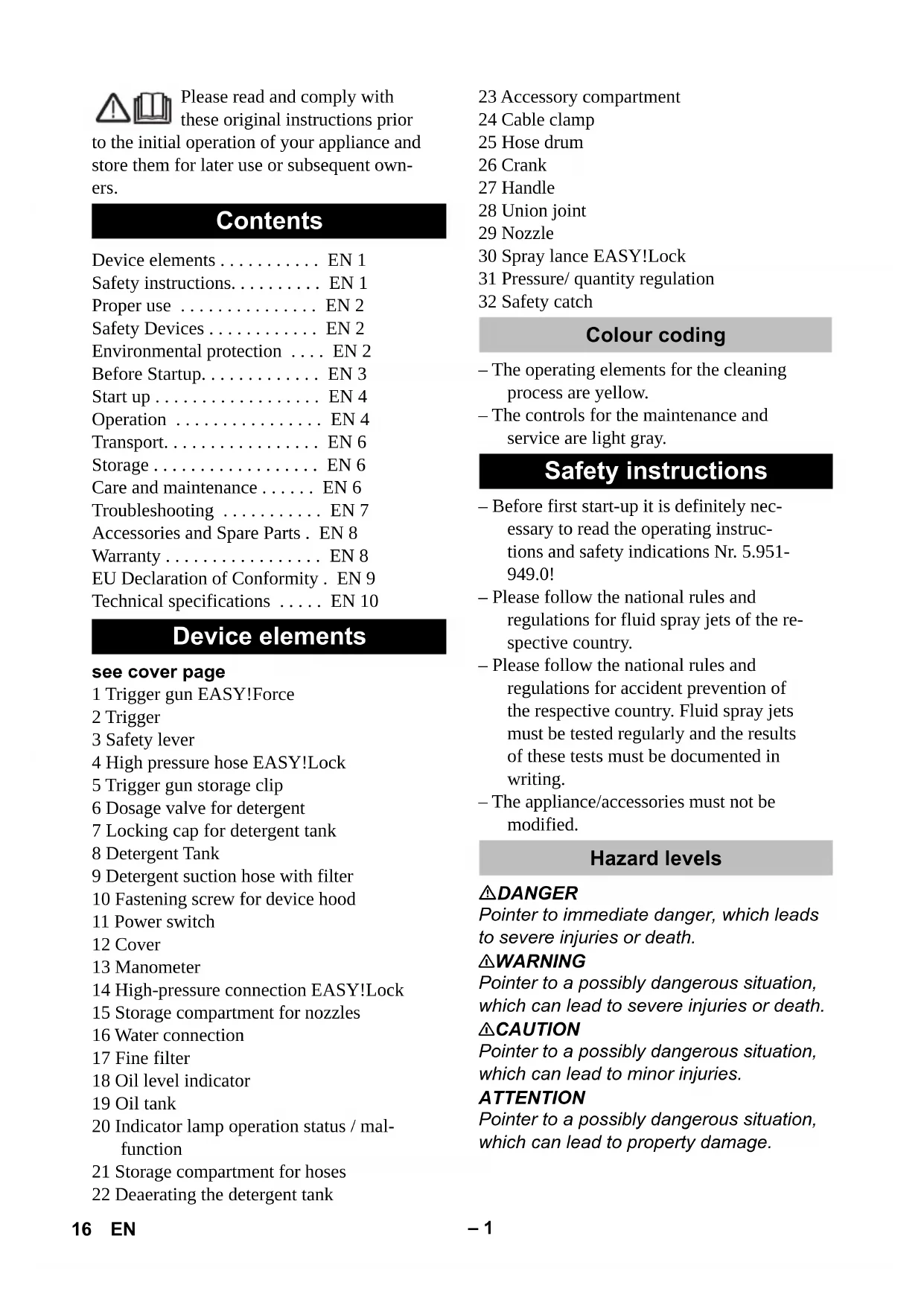 • 1.286-902.0: 75,5 kg; 1.286-903.0: 75,7 kg; 1.286-913.0: 69,1 kg; 1.286-927: 82,5 kg ** 1.286-914.0: 77,5 kg; 1.286-928.0: 86 kg 15DE– 1 Please read and comply with these original instructions prior to the initial operation of your appliance and store them for later use or subsequent own- ers. see cover page 1 Trigger gun EASY!Force 2 Trigger 3 Safety lever 4 High pressure hose EASY!Lock 5 Trigger gun storage clip 6 Dosage valve for detergent 7 Locking cap for detergent tank 8 Detergent Tank 9 Detergent suction hose with filter 10 Fastening screw for device hood 11 Power switch 12 Cover 13 Manometer 14 High-pressure connection EASY!Lock 15 Storage compartment for nozzles 16 Water connection 17 Fine filter 18 Oil level indicator 19 Oil tank 20 Indicator lamp operation status / mal- function 21 Storage compartment for hoses 22 Deaerating the detergent tank 23 Accessory compartment 24 Cable clamp 25 Hose drum 26 Crank 27 Handle 28 Union joint 29 Nozzle 30 Spray lance EASY!Lock 31 Pressure/ quantity regulation 32 Safety catch – The operating elements for the cleaning process are yellow. – The controls for the maintenance and service are light gray. – Before first start-up it is definitely nec- essary to read the operating instruc- tions and safety indications Nr. 5.951- 949.0! – Please follow the national rules and regulations for fluid spray jets of the re- spective country. – Please follow the national rules and regulations for accident prevention of the respective country. Fluid spray jets must be tested regularly and the results of these tests must be documented in writing. – The appliance/accessories must not be modified. DANGER Pointer to immediate danger, which leads to severe injuries or death. 몇 WARNING Pointer to a possibly dangerous situation, which can lead to severe injuries or death. 몇 CAUTION Pointer to a possibly dangerous situation, which can lead to minor injuries. ATTENTION Pointer to a possibly dangerous situation, which can lead to property damage. Contents Device elements . . . . . . . . . . . EN 1 Safety instructions. . . . . . . . . . EN 1 Proper use . . . . . . . . . . . . . . . EN 2 Safety Devices . . . . . . . . . . . . EN 2 Environmental protection . . . . EN 2 Before Startup. . . . . . . . . . . . . EN 3 Start up . . . . . . . . . . . . . . . . . . EN 4 Operation . . . . . . . . . . . . . . . . EN 4 Transport. . . . . . . . . . . . . . . . . EN 6 Storage . . . . . . . . . . . . . . . . . . EN 6 Care and maintenance . . . . . . EN 6 Troubleshooting . . . . . . . . . . . EN 7 Accessories and Spare Parts . EN 8 Warranty . . . . . . . . . . . . . . . . . EN 8 EU Declaration of Conformity . EN 9 Technical specifications . . . . . EN 10 Device elements Colour coding Safety instructions Hazard levels 16 EN– 2 High-pressure jets can be dan- gerous if improperly used. The jet may not be directed at persons, animals, live electrical equipment or at the appliance itself. According to applicable regula- tions, the appliance must never be used on the drinking water net without a system separator. A suit- able system separator by KÄRCHER or al- ternatively a system separator according to EN 12729 type BA must be used. Water that was flowing through a system separator is considered non-drinkable. 몇 CAUTION Always connect the system separator to the water supply, never directly to the appli- ance! Use this high pressure cleaner exclusively for – Cleaning using low pressure jet and de- tergent (for e.g. for cleaning machines, cars, buildings, tools), – For cleaning using high pressure jet without detergent (for e.g. for cleaning facades, terraces, garden appliances). For stubborn dirt, we recommend the use of the dirt blaster as a special accessory. Quality requirements for water: ATTENTION Only clean water may be used as high pressure medium. Impurities will lead to in- creased wear and tear or formation of de- posits in the appliance. If recycled water is used, the following limit values must not be exceeded. Safety devices serve to protect the user and must not be rendered in operational or their functions bypassed. While reducing the water supply/quantity regulation at the pump head, the overflow valve opens and part of the water flows back to the pump suck side. If the pulling lever on the trigger gun is re- leased the pressure switch turns off the pump, the high-pressure jet is stopped. If the pulling lever is pulled the pump is turned on again. The overflow valve and pressure switch are set and sealed at the factory. Setting only by customer service. Symbols on the machine Proper use pH value 6,5...9,5 electrical conductivity * Conductivity fresh water +1200 µS/cm settleable solids ** < 0,5 mg/l total suspended solids *** < 50 mg/l Hydrocarbons < 20 mg/l Chloride < 300 mg/l Sulphate < 240 mg/l Calcium < 200 mg/l Total hardness < 28 °dH < 50 °TH < 500 ppm (mg CaCO