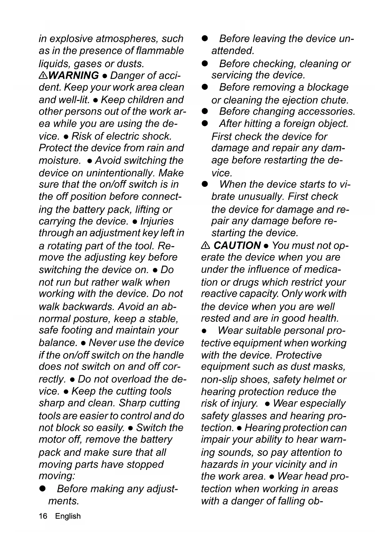 - EU Declaration of Conformity Chairman of the Board of ManagementDirector Regulatory Affairs & Certification H. Jenner S. Reiser16 English in explosive atmospheres, such as in the presence of flammable liquids, gases or dusts. 몇 WARNING ● Danger of acci- dent. Keep your work area clean and well-lit. ● Keep children and other persons out of the work ar- ea while you are using the de- vice. ● Risk of electric shock. Protect the device from rain and moisture. ● Avoid switching the device on unintentionally. Make sure that the on/off switch is in the off position before connect- ing the battery pack, lifting or carrying the device. ● Injuries through an adjustment key left in a rotating part of the tool. Re- move the adjusting key before switching the device on. ● Do not run but rather walk when working with the device. Do not walk backwards. Avoid an ab- normal posture, keep a stable, safe footing and maintain your balance. ● Never use the device if the on/off switch on the handle does not switch on and off cor- rectly. ● Do not overload the de- vice. ● Keep the cutting tools sharp and clean. Sharp cutting tools are easier to control and do not block so easily. ● Switch the motor off, remove the battery pack and make sure that all moving parts have stopped moving: Before making any adjust- ments. Before leaving the device un- attended. Before checking, cleaning or servicing the device. Before removing a blockage or cleaning the ejection chute. Before changing accessories. After hitting a foreign object. First check the device for damage and repair any dam- age before restarting the de- vice. When the device starts to vi- brate unusually. First check the device for damage and re- pair any damage before re- starting the device. 몇 CAUTION ● You must not op- erate the device when you are under the influence of medica- tion or drugs which restrict your reactive capacity . Only work with the device when you are well rested and are in good health. ● Wear suitable personal pro- tective equipment when working with the device. Protective equipment such as dust masks, non-slip shoes, safety helmet or hearing protection reduce the risk of injury. ● Wear especially safety glasses and hearing pro- tection. ● Hearing protection can impair your ability to hear warn- ing sounds, so pay attention to hazards in your vicinity and in the work area. ● Wear head pro- tection when working in areas with a danger of falling ob-English 17 jects.WARNING ● Wear long, heavy trousers, clothing with long arms and non-slip boots when working with the device. Do not work barefoot. Do not wear sandals or short trousers. Avoid wearing loose clothing or clothing with cords and straps.CAUTION ● Risk of injury when loose fitting clothing, hair or jewellery is caught by moving parts of the device. Keep cloth- ing and jewellery away from moving parts of the device. Tie long hair back. ● Use the device and accessories only according to these instructions and take the working conditions and the work to be performed into con- sideration to avoid dangerous situations. Safe operation DANGER ● Severe injuries when objects are flung by the cutting blade or when the cutting tool becomes entangled in wires or cords. Inspect the work area thoroughly for objects such as stones, sticks, metal, wires, bones or toys and remove these before using the device. 몇 WARNING ● The device is not intended for use by children, persons with restricted physical, sensory or mental abilities or persons unfamiliar with these in- structions. ● Use the device only in daylight or under good artifi- cial lighting. ● Do not operate the device on wet grass or in the rain. ● Maintain a minimum dis- tance of 15 m from persons and animals. Stop the device when any persons or animals enter this area. ● Keep the cutting head below the level of your hips. ● Never use the device with damaged or absent safety devices. ● Never use a metallic cutting string. ● Only operate the device outdoors. ● Keep your hands and feet away from the cutting area, especially when switching on the motor. ● Risk of injury because the blades con- tinue rotating after the motor has been switched off. ● Danger of injury. The blade on the protec- tive cover for shortening the cut- ting string is very sharp and you must avoid touching this, espe- cially when cleaning the device. ● Make sure that the ventilation openings are free of deposits. ● Check the device for damage before each use and after any impacts. Damaged parts, e.g. a switch, must be repaired or re- placed by the authorised Cus- tomer Service department. ● Ensure that the drive head at- tachment is correctly fitted and fastened. ● Ensure that all pro p. 22