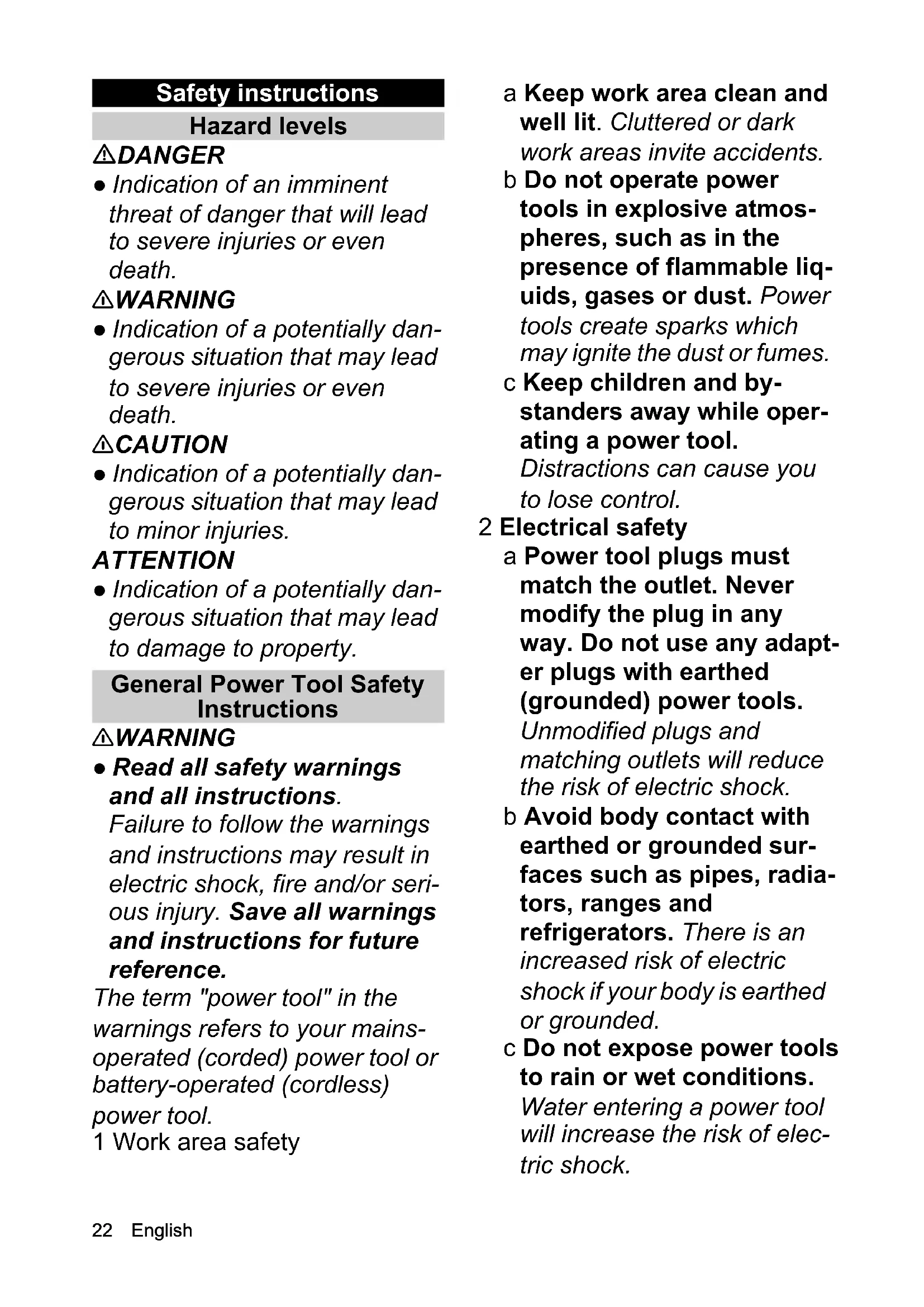 - EU Declaration of Conformity English Safety instructions Hazard levels DANGER ● Indication of an imminent threat of danger that will lead to severe injuries or even death. 몇 WARNING ● Indication of a potentially dan- gerous situation that may lead to severe injuries or even death. 몇 CAUTION ● Indication of a potentially dan- gerous situation that may lead to minor injuries. ATTENTION ● Indication of a potentially dan- gerous situation that may lead to damage to property. General Power Tool Safety Instructions 몇 WARNING ● Read all safety warnings and all instructions. Failure to follow the warnings and instructions may result in electric shock, fire and/or seri- ous injury. Save all warnings and instructions for future reference. The term "power tool" in the warnings refers to your mains- operated (corded) power tool or battery-operated (cordless) power tool. 1 Work area safety a Keep work area clean and well lit. Cluttered or dark work areas invite accidents. b Do not operate power tools in explosive atmos- pheres, such as in the presence of flammable liq- uids, gases or dust. Power tools create sparks which may ignite the dust or fumes. c Keep children and by- standers away while oper- ating a power tool. Distractions can cause you to lose control. 2 Electrical safety a Power tool plugs must match the outlet. Never modify the plug in any way. Do not use any adapt- er plugs with earthed (grounded) power tools. Unmodified plugs and matching outlets will reduce the risk of electric shock. b Avoid body contact with earthed or grounded sur- faces such as pipes, radia- tors, ranges and refrigerators. There is an increased risk of electric shock if your body is earthed or grounded. c Do not expose power tools to rain or wet conditions. Water entering a power tool will increase the risk of elec- tric shock.English 23 d Do not abuse the cord. Never use the cord for car- rying, pulling or unplug- ging the power tool. Keep cord away from heat, oil, sharp edges or moving parts. Damaged or entan- gled cords increase the risk of electric shock. e When operating a power tool outdoors, use an ex- tension cord suitable for outdoor use. Use of a cord suitable for outdoor use re- duces the risk of electric shock. f If operating a power tool in a damp location is una- voidable, use a residual current device (RCD) pro- tected supply. Use of an RCD reduces the risk of electric shock. 3 Personal safety a Stay alert, watch what you are doing and use com- mon sense when operat- ing a power tool. Do not use a power tool while you are tired or under the influ- ence of drugs, alcohol or medication. A moment of inattention while operating power tools may result in se- rious personal injury. b Use personal protective equipment. Always wear eye protection. Protective equipment such as dust mask, non-skid safety shoes, hard hat, or hearing protection used for appropri- ate conditions will reduce personal injuries. c Prevent unintentional starting. Ensure the switch is in the off-posi- tion before connecting to power source and/or bat- tery pack, picking up or carrying the tool. Carrying power tools with your finger on the switch or energising power tools that have the switch on invites accidents. d Remove any adjusting key or wrench before turning the power tool on. A wrench or a key left attached to a rotating part of the pow- er tool may result in personal injury. e Do not overreach. Keep proper footing and bal- ance at all times. This ena- bles better control of the power tool in unexpected sit- uations. f Dress properly. Do not wear loose clothing or jewellery. Keep your hair, clothing and gloves away from moving parts. Loose clothes, jewellery or long hair can be caught in moving parts. g If devices are provided for the connection of dust ex-24 English traction and collection fa- cilities, ensure these are connected and properly used. Use of dust collection can reduce dust-related haz- ards. 4 Power tool use and care a Do not force the power tool. Use the correct pow- er tool for your applica- tion. The correct power tool will do the job better and saf- er at the rate for which it was designed. b Do not use the power tool if the switch does not turn it on and off. Any power tool that cannot be controlled with the switch is dangerous and must be repaired. c Disconnect the plug from the power source and/or the battery pack from the power tool before making any adjustments, chang- ing accessories, or storing power tools. Such preven- tive safety measures reduce the risk of starting the power tool accidentally. d Store idle power tools out of the reach of children and do not allow persons unfamiliar with the power tool or these instructions to operate the power tool. Power tools are dangerous in the hands of untrained us- ers. e Maintain power tools. Check for misalignment or binding of moving parts, breakage of parts and any other condition that may affect the power tool’s op- eration. If damaged, have the power tool repaired before use. Many accidents are caused by poorly main- tained power tools. f Keep cutting tools sharp and clean. Properly main- tained cutting tools with sharp cutting edges are less likely to bind and are easier to control. g Use the power tool, acces- sories and tool bits etc. in accordance with these in- structions, taking into ac- count the working conditions and the work to be performed. Use of the power tool for operations dif- ferent from those intended could result in a hazardous situation. 5 Battery tool use and care a Recharge only with the chargers specified by the manufacturer. A charger that is suitable for one type of battery pack may create a risk of fire when used with another battery pack. b Use power tools only with specifically designated battery packs. Use of anyEnglish 25 other battery packs may cre- ate a risk of injury and fire. c When the battery pack is not in use, keep it away from other metallic ob- jects, like paperclips, coins, keys, nails, screws