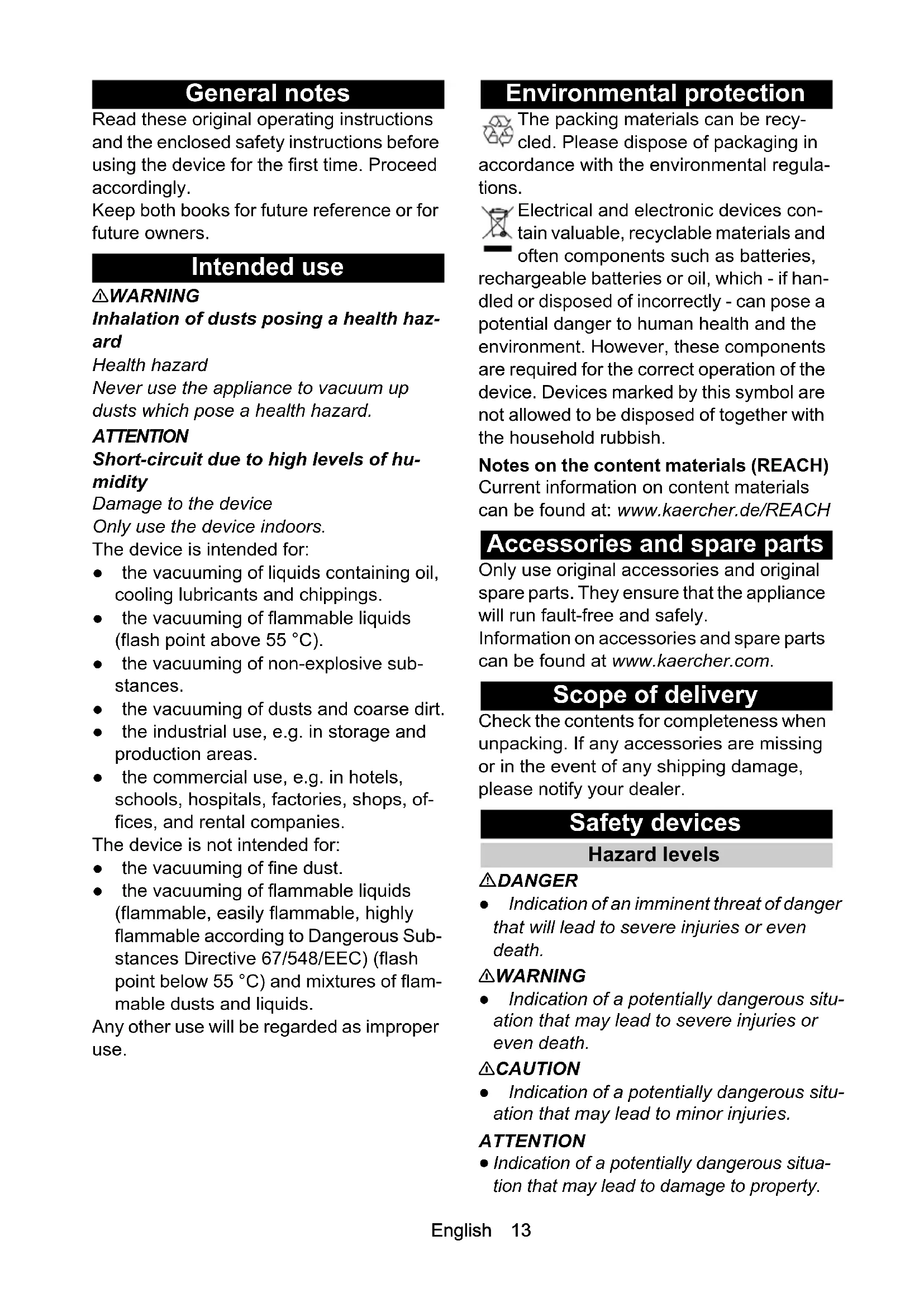 - Declaration of Conformity English 13 General notes Read these original operating instructions and the enclosed safety instructions before using the device for the first time. Proceed accordingly. Keep both books for future reference or for future owners. Intended use 몇 WARNING Inhalation of dusts posing a health haz- ard Health hazard Never use the appliance to vacuum up dusts which pose a health hazard. ATTENTION Short-circuit due to high levels of hu- midity Damage to the device Only use the device indoors. The device is intended for: ● the vacuuming of liquids containing oil, cooling lubricants and chippings. ● the vacuuming of flammable liquids (flash point above 55 °C). ● the vacuuming of non-explosive sub- stances. ● the vacuuming of dusts and coarse dirt. ● the industrial use, e.g. in storage and production areas. ● the commercial use, e.g. in hotels, schools, hospitals, factories, shops, of- fices, and rental companies. The device is not intended for: ● the vacuuming of fine dust. ● the vacuuming of flammable liquids (flammable, easily flammable, highly flammable according to Dangerous Sub- stances Directive 67/548/EEC) (flash point below 55 °C) and mixtures of flam- mable dusts and liquids. Any other use will be regarded as improper use. Environmental protection The packing materials can be recy- cled. Please dispose of packaging in accordance with the environmental regula- tions. Electrical and electronic devices con- tain valuable, recyclable materials and often components such as batteries, rechargeable batteries or oil, which - if han- dled or disposed of incorrectly - can pose a potential danger to human health and the environment. However, these components are required for the correct operation of the device. Devices marked by this symbol are not allowed to be disposed of together with the household rubbish. Notes on the content materials (REACH) Current information on content materials can be found at: www.kaercher.de/REACH Accessories and spare parts Only use original accessories and original spare parts. They ensure that the appliance will run fault-free and safely. Information on accessories and spare parts can be found at www.kaercher.com. Scope of delivery Check the contents for completeness when unpacking. If any accessories are missing or in the event of any shipping damage, please notify your dealer. Safety devices Hazard levels DANGER ● Indication of an imminent threat of danger that will lead to severe injuries or even death. 몇 WARNING ● Indication of a potentially dangerous situ- ation that may lead to severe injuries or even death. 몇 CAUTION ● Indication of a potentially dangerous situ- ation that may lead to minor injuries. ATTENTION p. 18