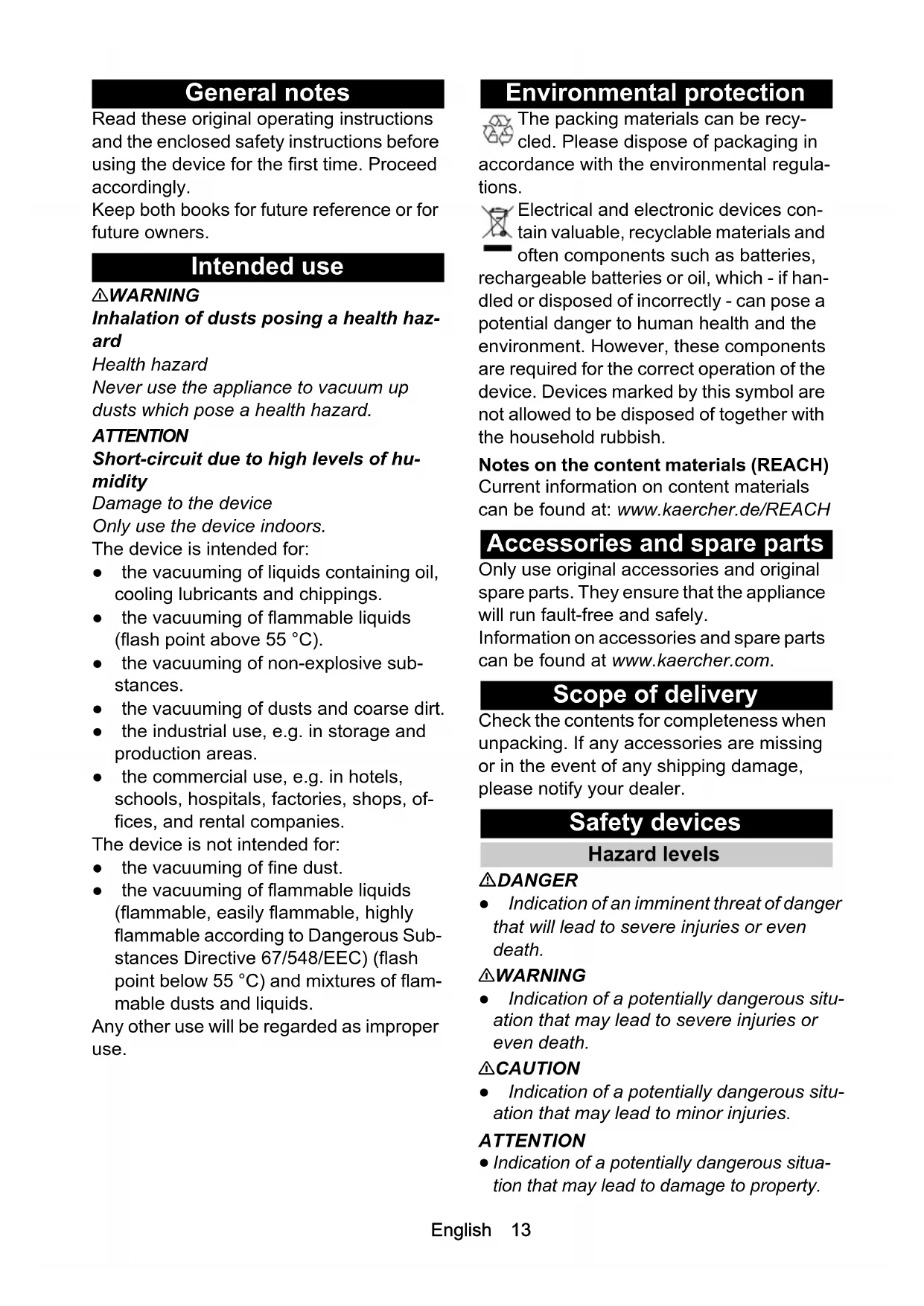 • Declaration of Conformity English 13 General notes Read these original operating instructions and the enclosed safety instructions before using the device for the first time. Proceed accordingly. Keep both books for future reference or for future owners. Intended use 몇 WARNING Inhalation of dusts posing a health haz- ard Health hazard Never use the appliance to vacuum up dusts which pose a health hazard. ATTENTION Short-circuit due to high levels of hu- midity Damage to the device Only use the device indoors. The device is intended for: ● the vacuuming of liquids containing oil, cooling lubricants and chippings. ● the vacuuming of flammable liquids (flash point above 55 °C). ● the vacuuming of non-explosive sub- stances. ● the vacuuming of dusts and coarse dirt. ● the industrial use, e.g. in storage and production areas. ● the commercial use, e.g. in hotels, schools, hospitals, factories, shops, of- fices, and rental companies. The device is not intended for: ● the vacuuming of fine dust. ● the vacuuming of flammable liquids (flammable, easily flammable, highly flammable according to Dangerous Sub- stances Directive 67/548/EEC) (flash point below 55 °C) and mixtures of flam- mable dusts and liquids. Any other use will be regarded as improper use. Environmental protection The packing materials can be recy- cled. Please dispose of packaging in accordance with the environmental regula- tions. Electrical and electronic devices con- tain valuable, recyclable materials and often components such as batteries, rechargeable batteries or oil, which - if han- dled or disposed of incorrectly - can pose a potential danger to human health and the environment. However, these components are required for the correct operation of the device. Devices marked by this symbol are not allowed to be disposed of together with the household rubbish. Notes on the content materials (REACH) Current information on content materials can be found at: www.kaercher.de/REACH Accessories and spare parts Only use original accessories and original spare parts. They ensure that the appliance will run fault-free and safely. Information on accessories and spare parts can be found at www.kaercher.com. Scope of delivery Check the contents for completeness when unpacking. If any accessories are missing or in the event of any shipping damage, please notify your dealer. Safety devices Hazard levels DANGER ● Indication of an imminent threat of danger that will lead to severe injuries or even death. 몇 WARNING ● Indication of a potentially dangerous situ- ation that may lead to severe injuries or even death. 몇 CAUTION ● Indication of a potentially dangerous situ- ation that may lead to minor injuries. ATTENTION p. 18