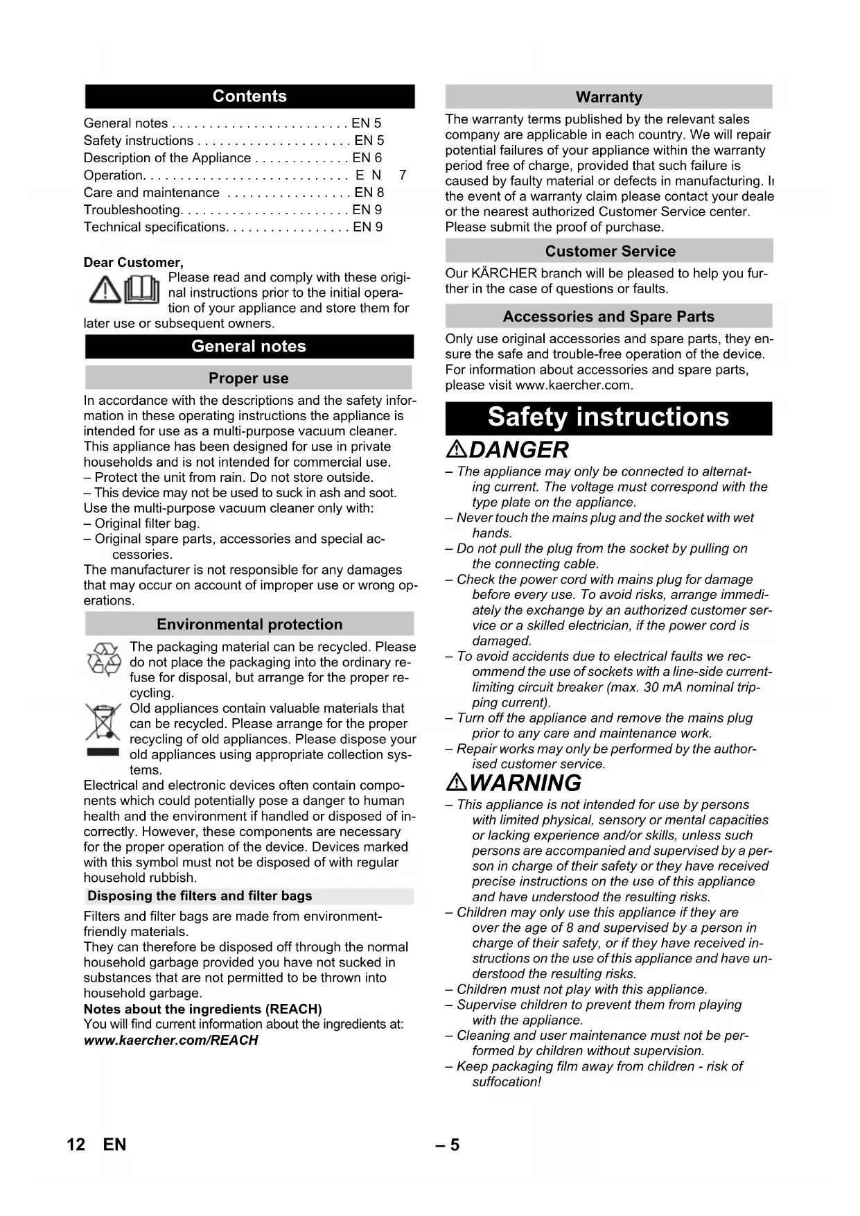 Netzabsicherung (träge) Behältervolumen Wasseraufnahme mit Handgriff Wasseraufnahme mit Bodendüse Netzkabel Schalldruckpegel (EN 60704-2-1) Gewicht (ohne Zubehör) 11DE– 5 Dear Customer, Please read and comply with these origi- nal instructions prior to the initial opera- tion of your appliance and store them for later use or subsequent owners. In accordance with the descriptions and the safety infor- mation in these operating instructions the appliance is intended for use as a multi-purpose vacuum cleaner. This appliance has been designed for use in private households and is not intended for commercial use. – Protect the unit from rain. Do not store outside. – This device may not be used to suck in ash and soot. Use the multi-purpose vacuum cleaner only with: – Original filter bag. – Original spare parts, accessories and special ac- cessories. The manufacturer is not responsible for any damages that may occur on account of improper use or wrong op- erations. The packaging material can be recycled. Please do not place the packaging into the ordinary re- fuse for disposal, but arrange for the proper re- cycling. Old appliances contain valuable materials that can be recycled. Please arrange for the proper recycling of old appliances. Please dispose your old appliances using appropriate collection sys- tems. Electrical and electronic devices often contain compo- nents which could potentially pose a danger to human health and the environment if handled or disposed of in- correctly. However, these components are necessary for the proper operation of the device. Devices marked with this symbol must not be disposed of with regular household rubbish. Filters and filter bags are made from environment- friendly materials. They can therefore be disposed off through the normal household garbage provided you have not sucked in substances that are not permitted to be thrown into household garbage. Notes about the ingredients (REACH) You will find current information about the ingredients at: www.kaercher.com/REACH The warranty terms published by the relevant sales company are applicable in each country. We will repair potential failures of your appliance within the warranty period free of charge, provided that such failure is caused by faulty material or defects in manufacturing. In the event of a warranty claim please contact your dealer or the nearest authorized Customer Service center. Please submit the proof of purchase. Our KÄRCHER branch will be pleased to help you fur- ther in the case of questions or faults. DANGER – The appliance may only be connected to alternat- ing current. The voltage must correspond with the type plate on the appliance. – Never touch the mains plug and the socket with wet hands. – Do not pull the plug from the socket by pulling on the connecting cable. – Check the power cord with mains plug for damage before every use. To avoid risks, arrange immedi- ately the exchange by an authorized customer ser- vice or a skilled electrician, if the power cord is damaged. – To avoid accidents due to electrical faults we rec- ommend the use of sockets with a line-side current- limiting circuit breaker (max. 30 mA nominal trip- ping current). – Turn off the appliance and remove the mains plug prior to any care and maintenance work. – Repair works may only be performed by the author- ised customer service. WARNING – This appliance is not intended for use by persons with limited physical, sensory or mental capacities or lacking experience and/or skills, unless such persons are accompanied and supervised by a per- son in charge of their safety or they have received precise instructions on the use of this appliance and have understood the resulting risks. – Children may only use this appliance if they are over the age of 8 and supervised by a person in charge of their safety, or if they have received in- structions on the use of this appliance and have un- derstood the resulting risks. – Children must not play with this appliance. – Supervise children to prevent them from playing with the appliance. – Cleaning and user maintenance must not be per- formed by children without supervision. – Keep packaging film away from children - risk of suffocation! Contents General notes ... EN 5 Safety instructions ... EN 5 Description of the Appliance ... EN 6 Operation...EN 7 Care and maintenance ... EN 8 Troubleshooting... EN 9 Technical specifications... EN 9 General notes Proper use Environmental protection Disposing the filters and filter bags Warranty Customer Service Safety instructions 12 EN Only use original accessories and spare parts, they en- sure the safe and trouble-free operation of the device. For information about accessories and spare parts, please visit www.kaercher.com. Accessories and Spare Parts– 6 – Switch the appliance off after every use and prior to every cleaning/maintenance procedure.– Risk of fire. Do not vacuum up any burning or glow-ing objects.– The appliance may not be used in areas where a risk of explosion is present.– Immediately switch the appliance off or pull the power plug if foam forms or liquids escape!– Do not use abrasives, glass or universal cleaners! Never immerse the appliance in water.Certain materials may produce explosive vapours or mixtures when agitated by the suction air!Never vacuum up the following materials:– Explosive or combustible gases, liquids and dust particles (reactive dust particles)– Reactive metal dust particles (such as aluminium, magnesium, zinc) in combination with highly alka-line or acidic detergents– Undiluted, strong acids and alkalies– Organic solvents (such as petrol, paint thinners, ac-etone, heating oil).In addition, these substances may cause the appliance materials to corrode. DANGER Pointer to immediate danger, which leads to severe in-juries or death. 몇 WARNING Pointer to a possibly dangerous situation, which can lead to severe injuries or death. 몇 CAUTION Poi