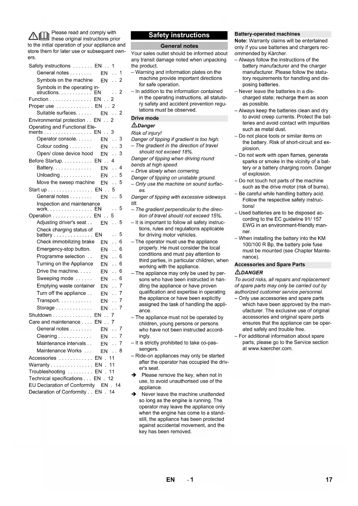 Angewandtes Konformitätsbewer- tungsverfahren 2000/14/EG: Anhang V Schallleistungspegel dB(A) Gemessen: 92 Garantiert: 94 Chairman of the Board of Management Director Regulatory Affairs & Certification 16 DE- 1 Please read and comply with these original instructions prior to the initial operation of your appliance and store them for later use or subsequent own- ers. Your sales outlet should be informed about any transit damage noted when unpacking the product. – Warning and information plates on the machine provide important directions for safe operation. – In addition to the information contained in the operating instructions, all statuto- ry safety and accident prevention regu- lations must be observed. Danger Risk of injury! Danger of tipping if gradient is too high. – The gradient in the direction of travel should not exceed 18%. Danger of tipping when driving round bends at high speed. – Drive slowly when cornering. Danger of tipping on unstable ground. – Only use the machine on sound surfac- es. Danger of tipping with excessive sideways tilt. – The gradient perpendicular to the direc- tion of travel should not exceed 15%. – It is important to follow all safety instruc- tions, rules and regulations applicable for driving motor vehicles. – The operator must use the appliance properly. He must consider the local conditions and must pay attention to third parties, in particular children, when working with the appliance. – The appliance may only be used by per- sons who have been instructed in han- dling the appliance or have proven qualification and expertise in operating the appliance or have been explicitly assigned the task of handling the appli- ance. – The appliance must not be operated by children, young persons or persons who have not been instructed accord- ingly. – It is strictly prohibited to take co-pas- sengers. – Ride-on appliances may only be started after the operator has occupied the driv- er's seat. Please remove the key, when not in use, to avoid unauthorised use of the appliance. Never leave the machine unattended so long as the engine is running. The operator may leave the appliance only when the engine has come to a stand- still, the appliance has been protected against accidental movement, and the key has been removed. Note: Warranty claims will be entertained only if you use batteries and chargers rec- ommended by Kärcher. – Always follow the instructions of the battery manufacturer and the charger manufacturer. Please follow the statu- tory requirements for handling and dis- posing batteries. – Never leave the batteries in a dis- charged state; recharge them as soon as possible. – Always keep the batteries clean and dry to avoid creep currents. Protect the bat- teries and avoid contact with impurities such as metal dust. – Do not place tools or similar items on the battery. Risk of short-circuit and ex- plosion. – Do not work with open flames, generate sparks or smoke in the vicinity of a bat- tery or a battery charging room. Danger of explosion. – Do not touch hot parts of the machine such as the drive motor (risk of burns). – Be careful while handling battery acid. Follow the respective safety instruc- tions! – Used batteries are to be disposed ac- cording to the EC guideline 91/ 157 EWG in an environment-friendly man- ner. – When installing the battery into the KM 100/100 R Bp, the battery pole fuse must be mounted (see Chapter Mainte- nance). DANGER To avoid risks, all repairs and replacement of spare parts may only be carried out by authorized customer service personnel. – Only use accessories and spare parts which have been approved by the man- ufacturer. The exclusive use of original accessories and original spare parts ensures that the appliance can be oper- ated safely and trouble free. – For additional information about spare parts, please go to the Service section at www.kaercher.com. Safety instructions . . . . . . . EN . . 1 General notes . . . . . . . .