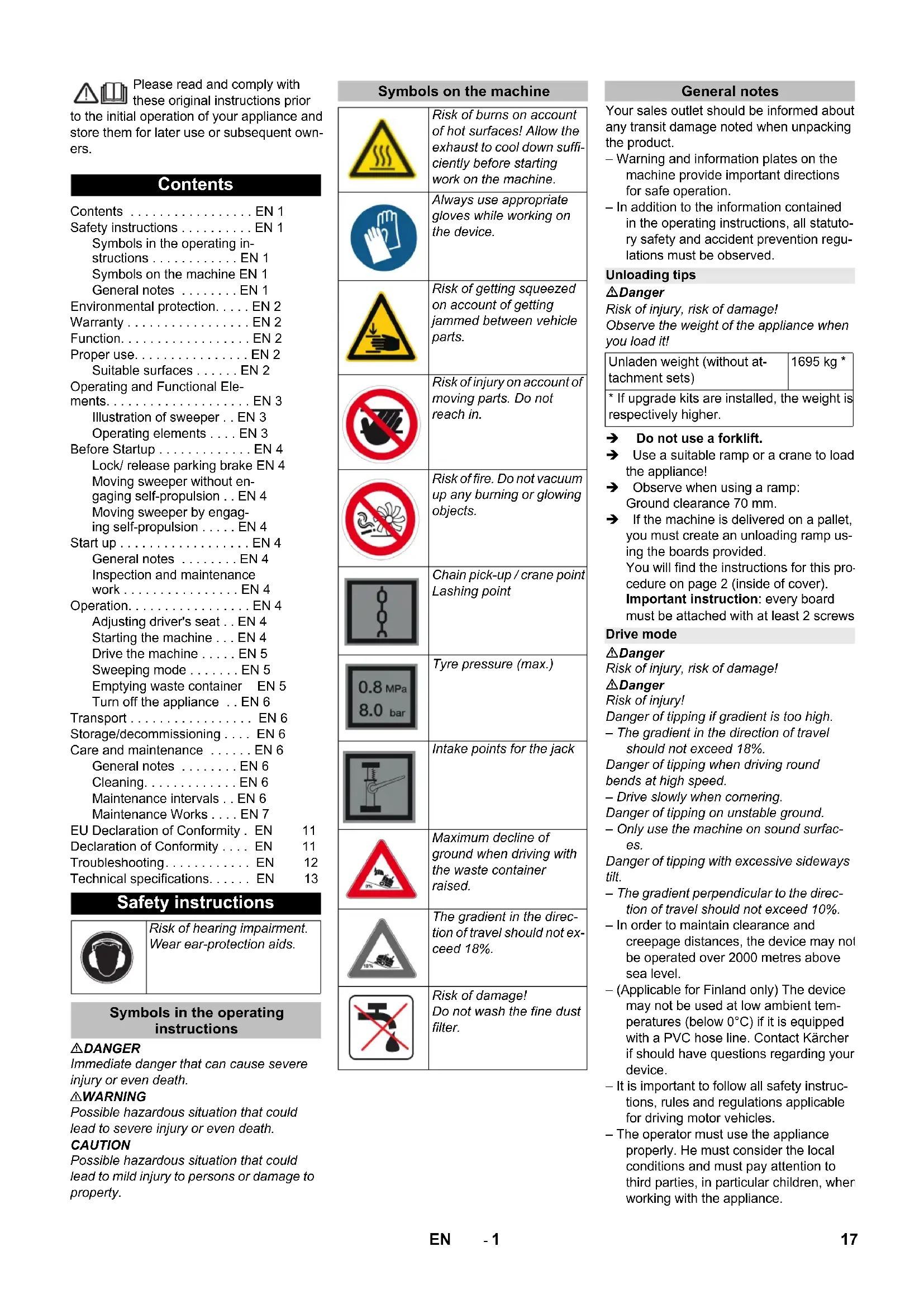 0,1 Maße und Gewichte Länge x Breite x Höhe mm 2742 x 1904 x 2213 Wenderadius rechts mm 2525 Wenderadius links mm 2490 Leergewicht (ohne Anbausätze) kg 1695 Zulässiges Gesamtgewicht kg 2701 Zulässige Achslast vorne kg 1703 Zulässige Achslast hinten kg 998 Inhalt Kraftstofftank, Diesel l 26 Technische Änderungen vorbehalten! KM 170/600 R D Classic 16 DE- 1 Please read and comply with these original instructions prior to the initial operation of your appliance and store them for later use or subsequent own- ers. DANGER Immediate danger that can cause severe injury or even death. 몇 WARNING Possible hazardous situation that could lead to severe injury or even death. CAUTION Possible hazardous situation that could lead to mild injury to persons or damage to property. Your sales outlet should be informed about any transit damage noted when unpacking the product. – Warning and information plates on the machine provide important directions for safe operation. – In addition to the information contained in the operating instructions, all statuto- ry safety and accident prevention regu- lations must be observed. Danger Risk of injury, risk of damage! Observe the weight of the appliance when you load it! Do not use a forklift. Use a suitable ramp or a crane to load the appliance! Observe when using a ramp: Ground clearance 70 mm. If the machine is delivered on a pallet, you must create an unloading ramp us- ing the boards provided. You will find the instructions for this pro- cedure on page 2 (inside of cover). Important instruction: every board must be attached with at least 2 screws. Danger Risk of injury, risk of damage! Danger Risk of injury! Danger of tipping if gradient is too high. – The gradient in the direction of travel should not exceed 18%. Danger of tipping when driving round bends at high speed. – Drive slowly when cornering. Danger of tipping on unstable ground. – Only use the machine on sound surfac- es. Danger of tipping with excessive sideways tilt. – The gradient perpendicular to the direc- tion of travel should not exceed 10%. – In order to maintain clearance and creepage distances, the device may not be operated over 2000 metres above sea level. – (Applicable for Finland only) The device may not be used at low ambient tem- peratures (below 0°C) if it is equipped with a PVC hose line. Contact Kärcher if should have questions regarding your device. – It is important to follow all safety instruc- tions, rules and regulations applicable for driving motor vehicles. – The operator must use the appliance properly. He must consider the local conditions and must pay attention to third parties, in particular children, when working with the appliance. Contents Contents ... EN 1 Safety instructions ... EN 1 Symbols in the operating in- structions ... EN 1 Symbols on the machine EN 1 General notes ... EN 1 Environmental protection... EN 2 Warranty ... EN 2 Function... EN 2 Proper use... EN 2 Suitable surfaces ... EN 2 Operating and Functional Ele- ments... EN 3 Illustration of sweeper ... EN 3 Operating elements ... EN 3 Before Startup ... EN 4 Lock/ release parking brake EN 4 Moving sweeper without en- gaging self-propulsion ... EN 4 Moving sweeper by engag- ing self-propulsion ... EN 4 Start up ... EN 4 General notes ... EN 4 Inspection and maintenance work ... EN 4 Operation... EN 4 Adjusting driver's seat ... EN 4 Starting the machine ... EN 4 Drive the machine ... EN 5 Sweeping mode ... EN 5 Emptying waste container EN 5 Turn off the appliance ... EN 6 Transport ... EN 6 Storage/decommissioning ... EN 6 Care and maintenance ... EN 6 General notes ... EN 6 Cleaning... EN 6 Maintenance intervals ... EN 6 Maintenance Works ... EN 7 EU Declaration of Conformity . EN 11 Declaration of Conformity ... EN 11 Troubleshooting... EN 12 Technical specifications... EN 13 Safety instructions Risk of hearing impairment. Wear ear-protection aids. Symbols in the operating instructions Symbols on the machine Risk of burns on account of hot surfaces! Allow the exhaust to cool down suffi- ciently before starting work on the machine. Always use appropriate gloves while working on the device. Risk of getting squeezed on account of getting jammed between vehicle parts. Risk of injury on account of moving parts. Do not reach in. Risk of fire. Do not vacuum up any burning or glowing objects. Chain pick-up / crane point Lashing point Tyre pressure (max.) Intake points for the jack Maximum decline of ground when driving with the waste container raised. The gradient in the direc- tion of travel should not ex- ceed 18%. Risk of damage! Do not wash the fine dust filter. General notes Unloading tips Unladen weight (without at- tachment sets) 1695 kg *