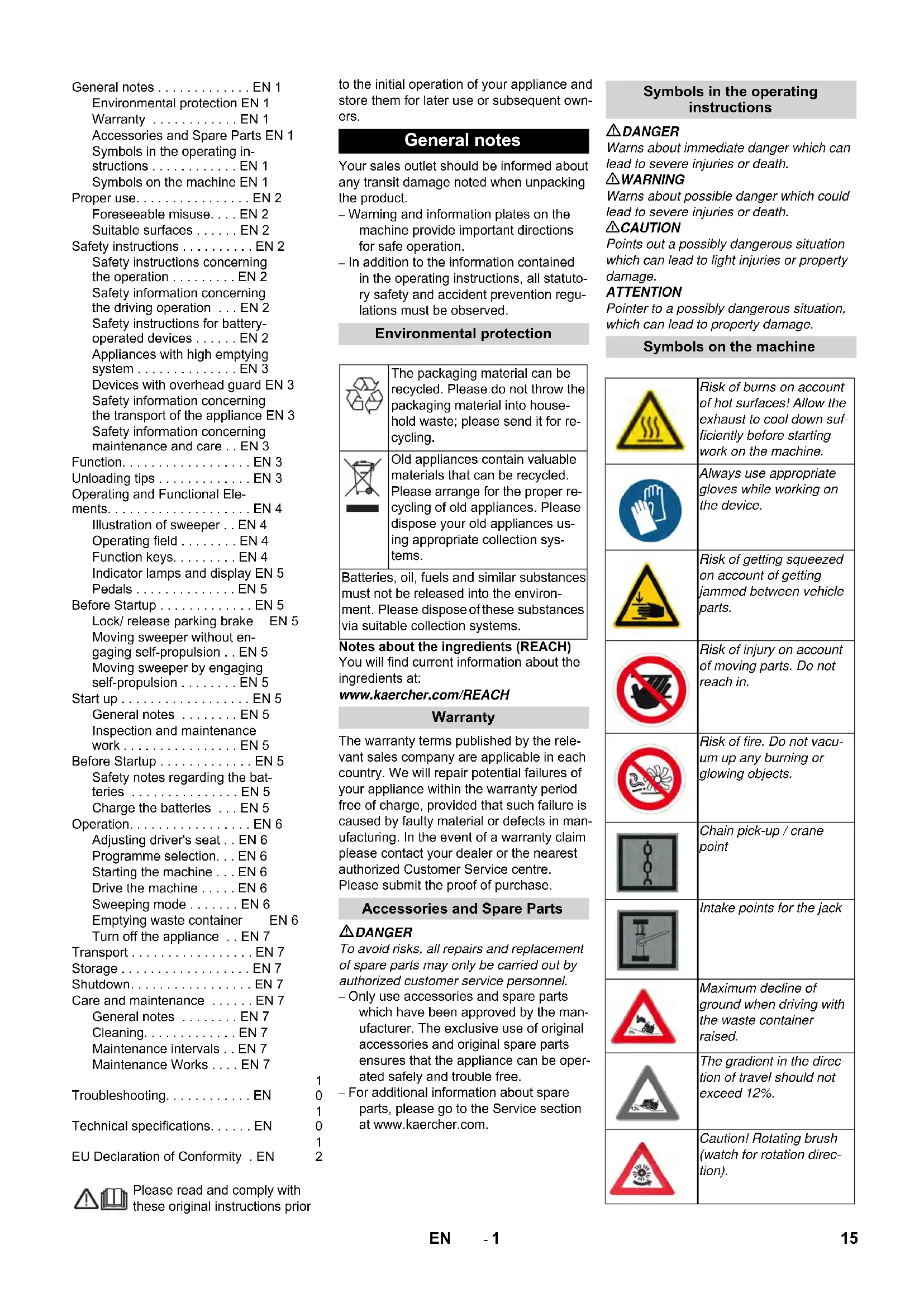 General notes Environmental protection The packaging material can be recycled. Please do not throw the packaging material into house- hold waste; please send it for re- cycling. Old appliances contain valuable materials that can be recycled. Please arrange for the proper re- cycling of old appliances. Please dispose your old appliances us- ing appropriate collection sys- tems. Batteries, oil, fuels and similar substances must not be released into the environ- ment. Please dispose of these substances via suitable collection systems. Warranty Accessories and Spare Parts Symbols in the operating instructions Symbols on the machine Risk of burns on account of hot surfaces! Allow the exhaust to cool down suf- ficiently before starting work on the machine. Always use appropriate gloves while working on the device. Risk of getting squeezed on account of getting jammed between vehicle parts. Risk of injury on account of moving parts. Do not reach in. Risk of fire. Do not vacu- um up any burning or glowing objects. Chain pick-up / crane point Intake points for the jack Maximum decline of ground when driving with the waste container raised. The gradient in the direc- tion of travel should not exceed 12%. Caution! Rotating brush (watch for rotation direc- tion). 15EN- 2 The sweeper is intended for cleaning floor surfaces for commercial use and e.g. for the following fields of application: Car parks Production facilities Logistics areas Hotel Retail industry Storage areas Walkways – This sweeper has been designed to sweep dirt and debris from indoor as well as outdoor surfaces. – The machine with working equipment must be checked to ensure that it is in proper working order and is operating safely prior to use. Otherwise, the appli- ance must not be used. – Use this sweeper only as directed in these operating instructions. – The machine may not be modified. – The machine is only suitable for use on the types of surfaces specified in the operating instructions. – The machine may only be operated on the surfaces approved by the company or its authorised representatives. – The following applies in general: Keep highly-flammable substances away from the appliance (danger of explo- sion/fire). Never vacuum up explosive liquids, combustible gases or undiluted acids and solvents. This includes petrol, paint thinner or heating oil which can gener- ate explosive fumes or mixtures upon contact with the suction air. Acetone, undiluted acids and solvents must also be avoided as they can harm the mate- rials on the machine. Never sweep/vacuum up reactive metal dusts (e.g. aluminium, magnesium, zinc), as they form explosive gases when they come in contact with highly alkaline or acidic detergents. Do not sweep/vacuum up any burning or glowing objects. The appliance is not suitable for sweep- ing off hazardous substances. The machine may not be used or stored in hazardous areas. It is not allowed to use the appliance in hazardous loca- tions. It is strictly prohibited to take co-pas- sengers. Pushing/pulling or transporting objects by means of this appliance is prohibit- ed. – Asphalt – Industrial floor – Screed – Concrete – Paving stones In order to maintain clearance and creepage distances, the device may not be operated over 2000 metres above sea level. (Applicable for Finland only) The device may not be used at low ambient tem- peratures (below 0°C) if it is equipped with a PVC hose line. Contact Kärcher if should have questions regarding your device. The machine with working equipment must be checked to ensure that it is in proper working order and is operating safely prior to use. Otherwise, the appli- ance must not be used. If the appliance is used in hazardous ar- eas (e.g. filling stations) the corre- sponding safety provisions must be ob- served. It is not allowed to use the ap- pliance in hazardous locations. DANGER Risk of injury! Do not use the appliance without an overhead guard in areas where the op- erator might get hit by falling objects. The operator must use the appliance properly. The person must consider the local conditions and must pay attention to third parties, in particular children, when working with the appliance. It is important to follow all safety instruc- tions, rules and regulations applicable for driving motor vehicles. Prior to starting work, the operator must ensure that all protective devices are properly installed and function correct- ly. The operator of the appliance is liable for accidents with other individuals or their property. Ensure that the operator wears tight-fit- ting clothes. Wear sturdy shoes and avoid wearing loose-fitting clothes. Check the immediate vicinity prior to starting (e.g. children). Ensure suffi- cient visibility! Never leave the machine unattended so long as the engine is running. The operator may leave the appliance only when the engine has come to a stand- still, the appliance has been protected against accidental movement, and the key has been removed. Please remove the key, when not in use, to avoid unauthorised use of the appliance. The appliance may only be used by per- sons who have been instructed in han- dling the appliance or have proven qualification and expertise in operating the appliance or have been explicitly assigned the task of handling the appli- ance. This appliance is not intended for use by persons (including children) with lim- ited physical, sensoric or mental capac- ities or lack of experience and/or skills, unless such persons are accompanied and supervised by a person in charge of their safety or if they received precise instructions on the use of this appli- ance. Children should be supervised to pre- vent them from playing with the appli- ance. CAUTION Risk of damage! Do not sweep up straps, strings or wires as these may wrap around the brush roller. DANGER Risk of injury! Verify the stability of the ground prior to driving on it. DANGER Risk of accident, risk of injury! Danger of tipping if gra